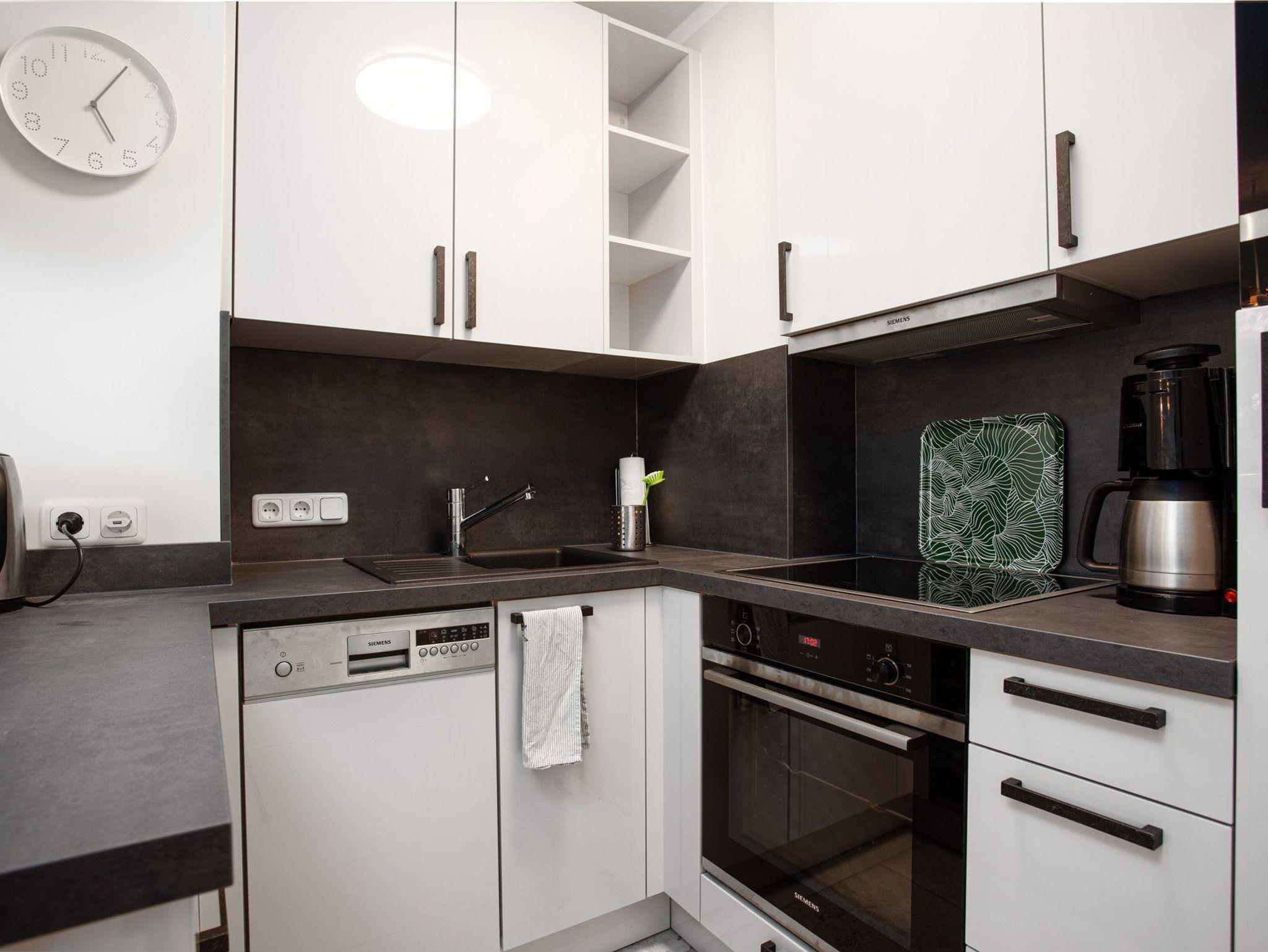 Die integrierte Einbauküche ist mit einem Geschirrspüler, Backofen sowie einer Mikrowelle und Essecke komplett ausgestattet.