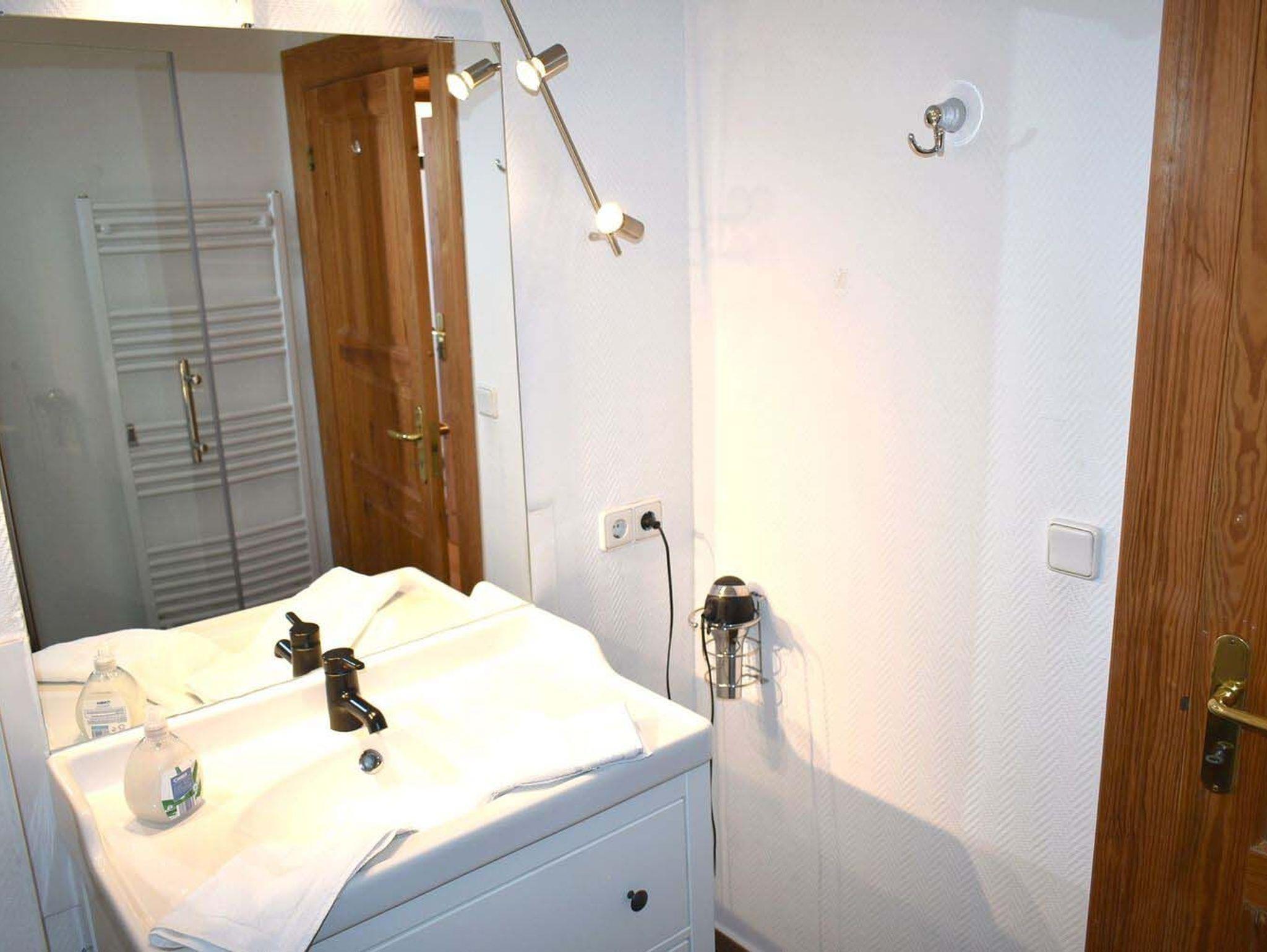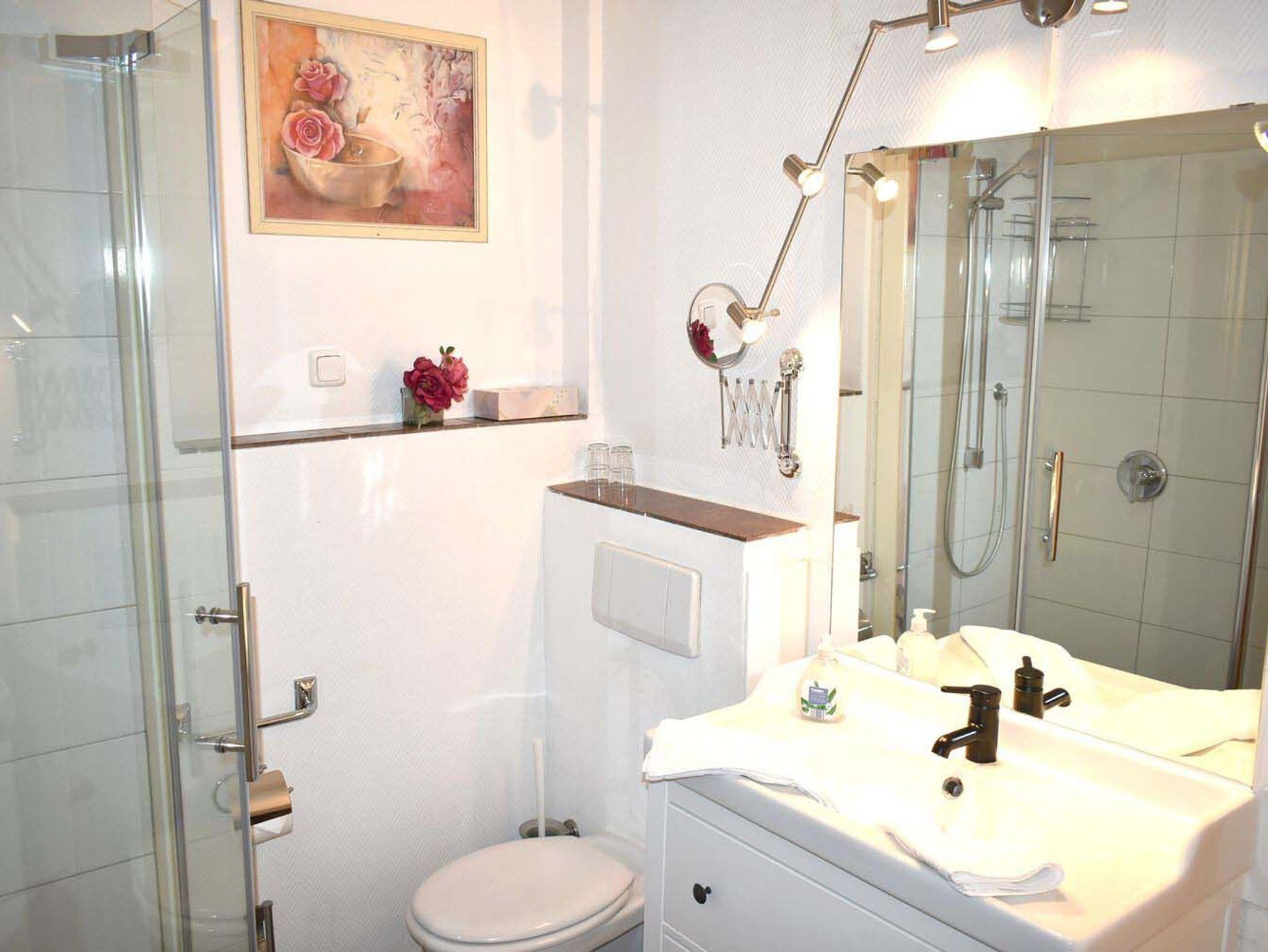 Bad 1: Dusche, Duschkabine, Fön, Handtuchheizung, Kosmetikspiegel, Spiegel, Waschtisch mit Unterschrank, WC