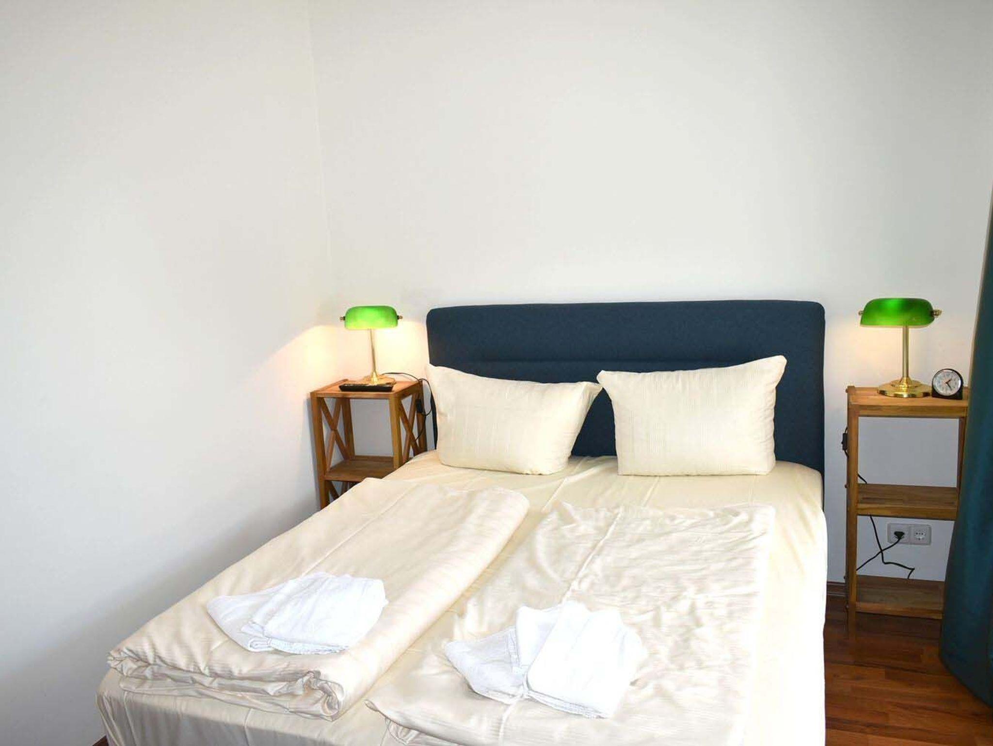 Schlafzimmer 1: 2 Matratzen, 2 Nachttische, 2 Tischlampen, Besen, Boxspringbett 2,00 x 1,60 m, Bügelbrett, Bügeleisen, Kleiderschrank mit Spiegel, Staubsauger, Stuhl, Verdunklungsplissee, Wäscheständer, Wischer mit Eimer