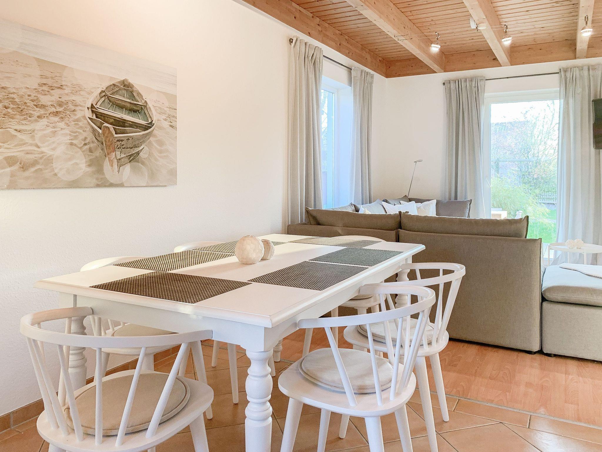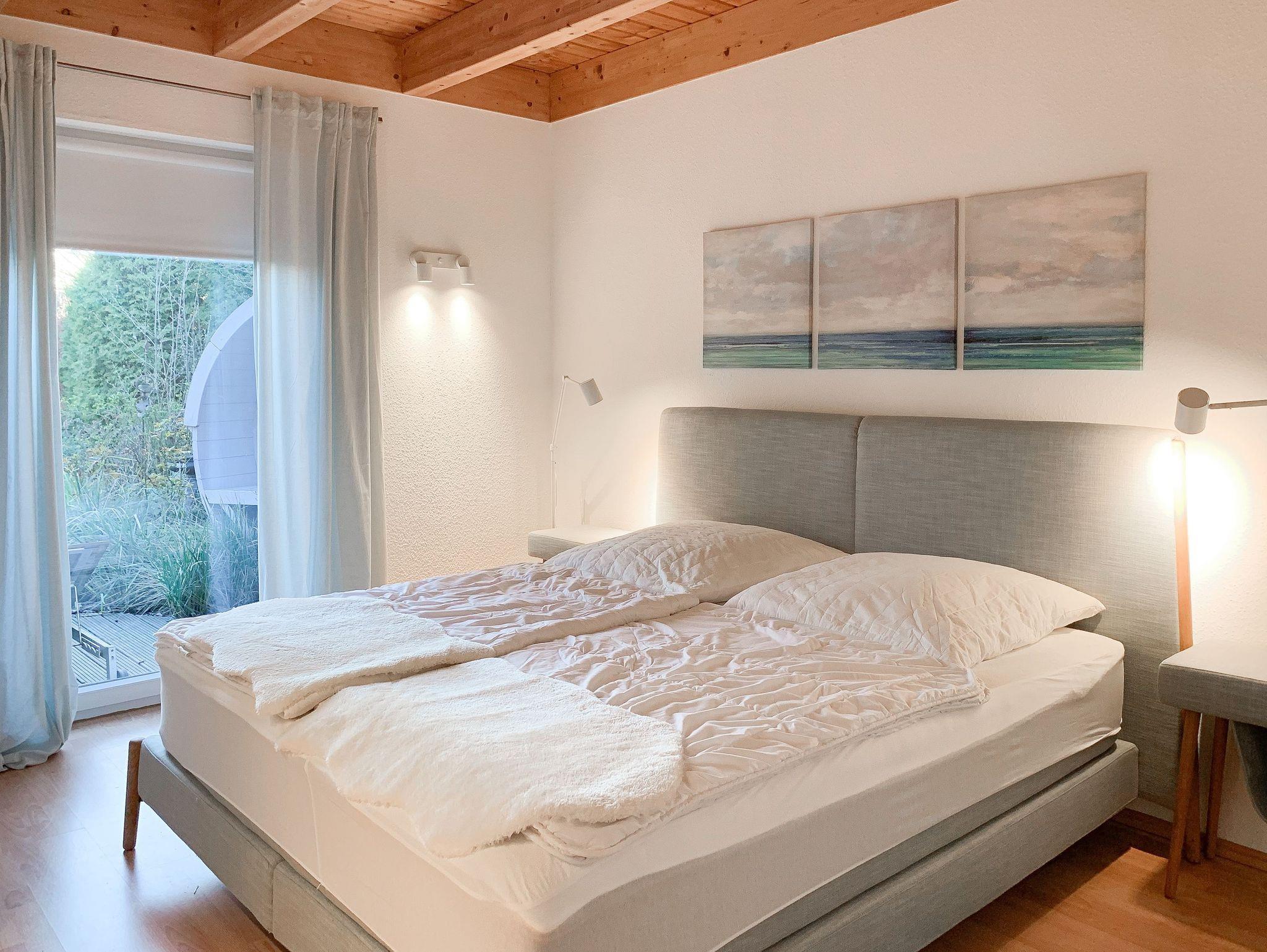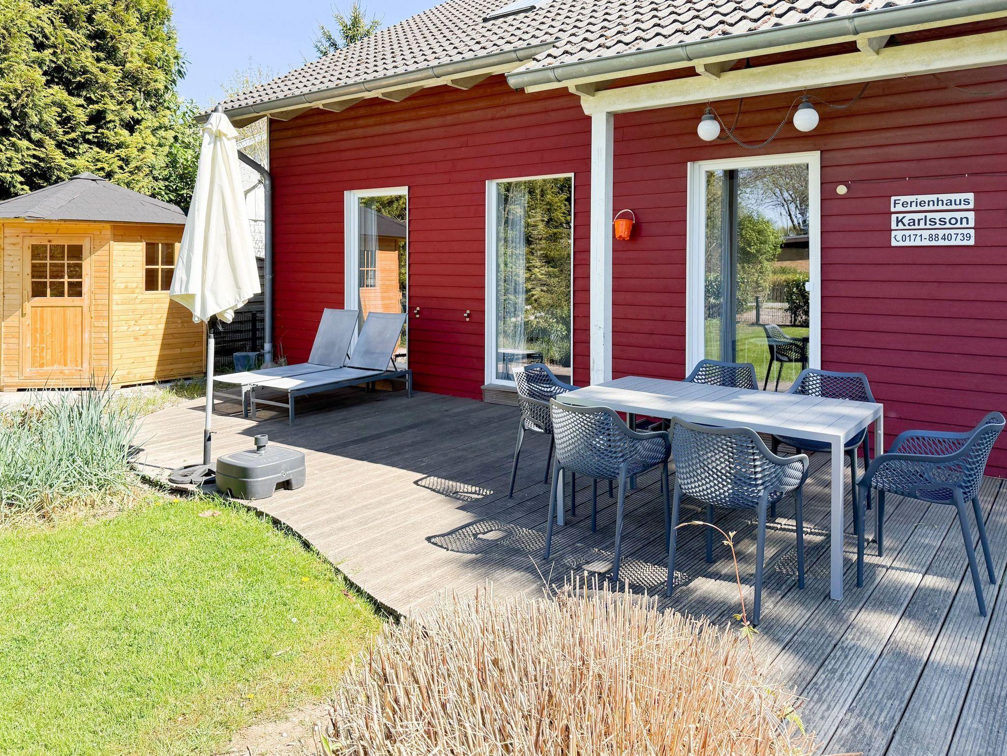 Das Ferienhaus Karlsson umgibt ein großer, eingezäunter Garten mit Spielgerüst, Gartensauna und schöner Holzterrasse, selbstverständlich[nbsp][nbsp]mit Gartenmöbeln und Sonnenliegen. Es eignet sich bestens auch für Familien mit Kindern. Auf 125 qm Wohnfläche bietet das Haus mit 3 separaten Schlafzimmern und 2 Bädern ausreichend Platz für 6 Personen plus Kleinkind. Im Erdgeschoss befindet sich der Wohnraum mit offener Einbauküche (Geschirrspüler, Backofen, Mikrowelle) und Essbereich für 6 Personen sowie der Zugang auf die großzügige Holzterrasse mit Süd Ausrichtung. Ein Schlafzimmer mit Doppelbett, ein Duschbad sowie der Hauswirtschaftsraum mit Waschmaschine und Trockner sind ebenfalls im EG untergebracht. Im Obergeschoss befinden sich das zweite Badezimmer mit Dusche und Badewanne und zwei weitere Schlafzimmer. Das eine verfügt über ein Doppelbett und TV, das andere ist mit zwei Einzelbetten ausgestattet.
