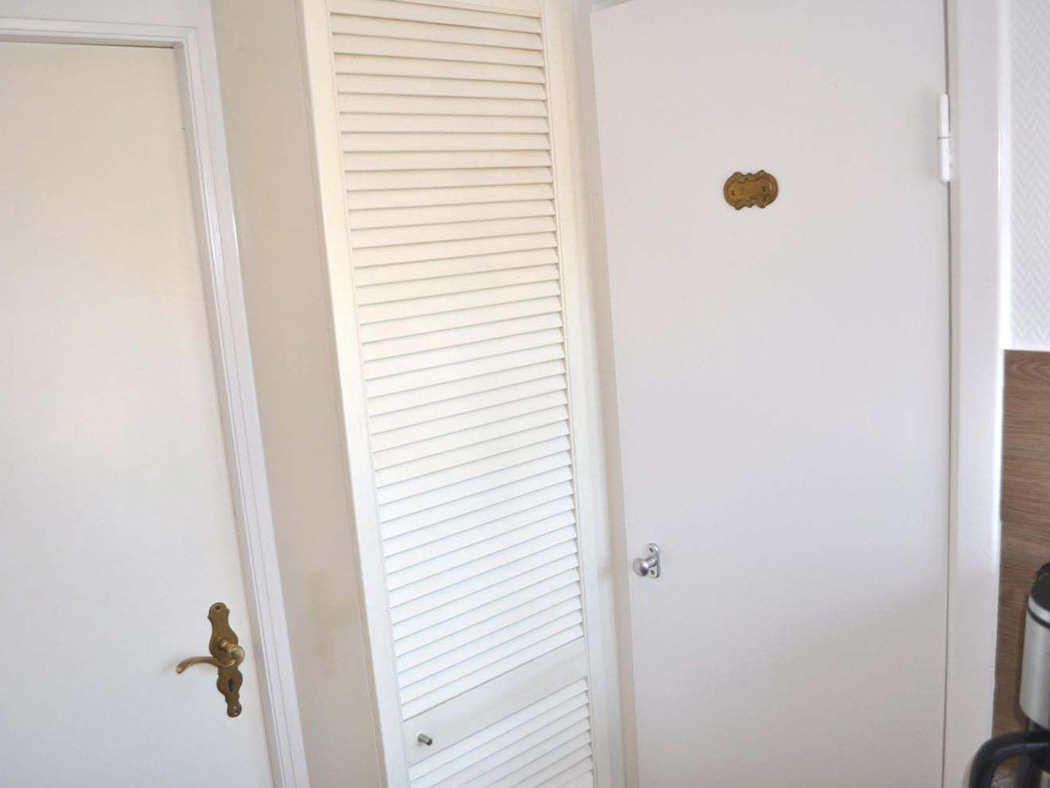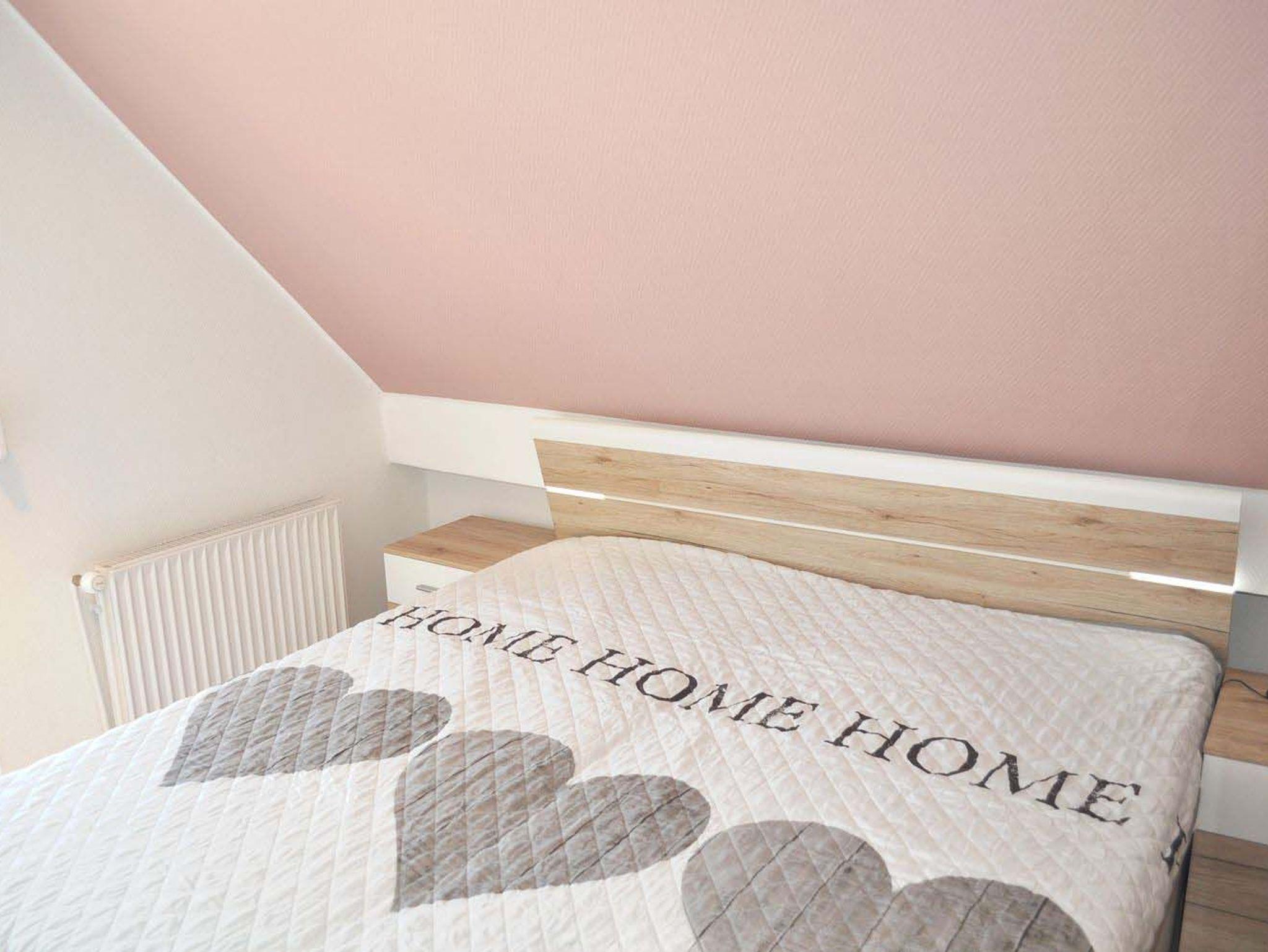 Schlafzimmer 1: 2 Matratzen, 2 Nachttische, Aussenrollladen vor der Terrassentür, Doppelbett 2,00 x 1,80 m, Kinderbett inkl., Kleiderschrank, Spiegel