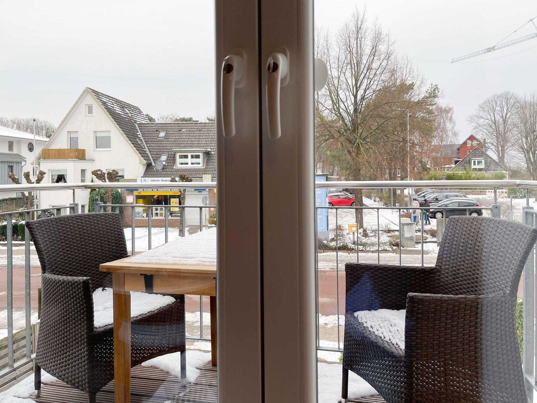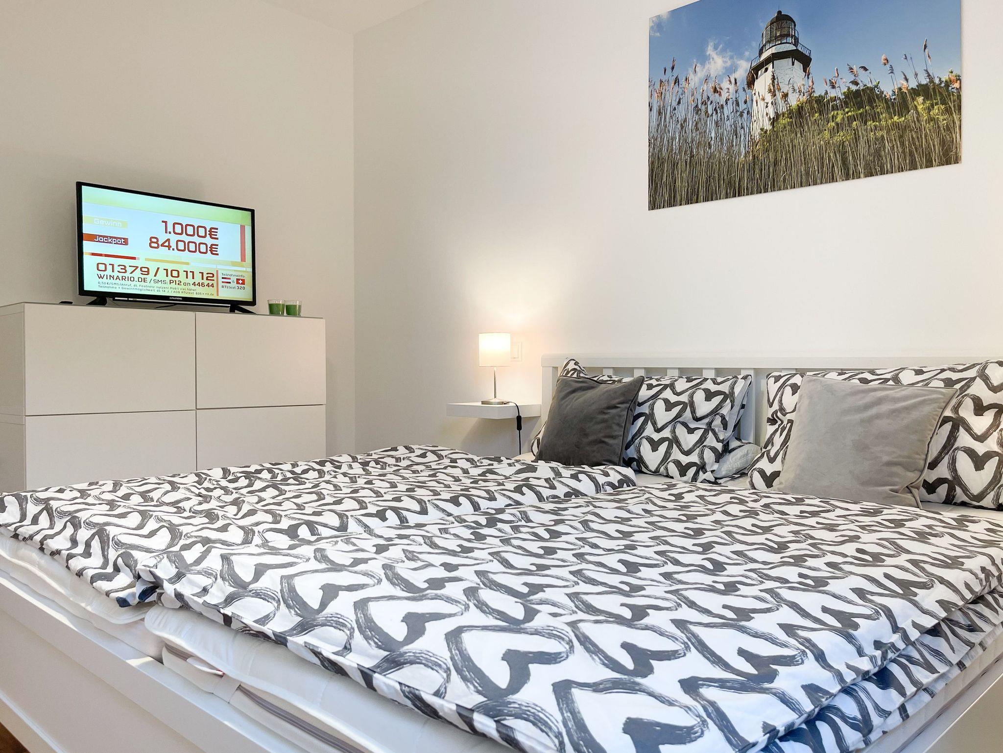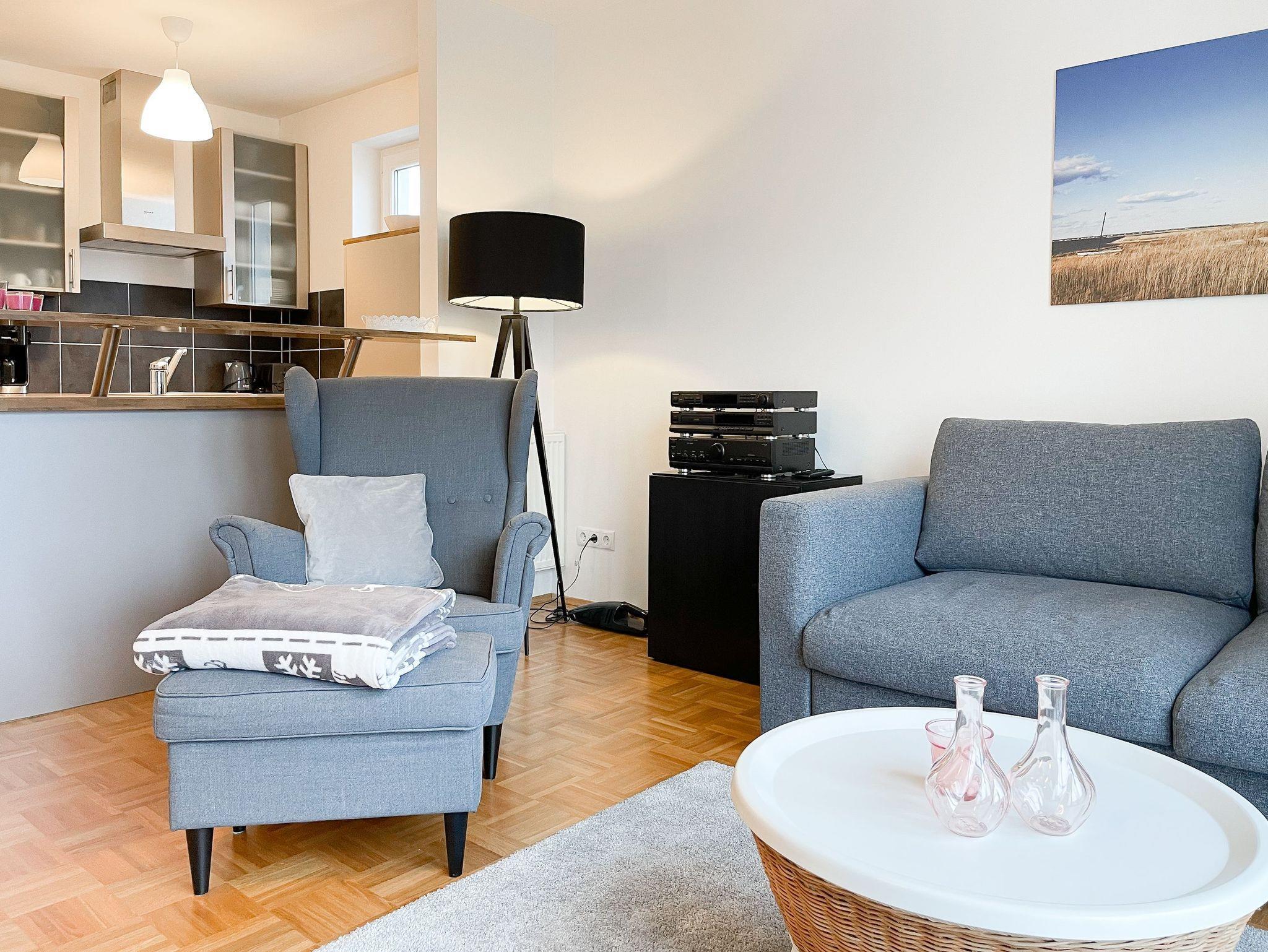 Ankommen und wohl fühlen in der liebevoll eingerichteten Ferienwohnung Kleine Jolle. Es erwartet Sie ein großzügiger Wohn- Essbereich, der mit einem Schlafsofa (140x190), einem gemütlichen Lesesessel, TV, Hifi-Anlage und WLAN ausgestattet ist. Bodentiefe Fensterelemente führen auf den Balkon in Nordwest Ausrichtung, um die letzen Sonnenstunden zu genießen. Der anschließende Essbereich bietet ausreichend Platz für 4 Personen. Die angrenzende Einbauküche mit Tresen ist bestens ausgestattet.[nbsp] Im separatem Schlafzimmer befindet sich ein Doppelbett (180x200), ein Kleiderschrank mit viel Staufläche sowie ein weiterer TV. Die Fenster lassen sich durch Plissees verdunkeln. Das moderne, großzügige Bad mit ist sowohl mit einer bodentiefen Walk-In Dusche als auch einer Badewanne ausgestattet. Ein Fahrstuhl ist vorhanden. Waschmaschine und Trockner (Münzgeräte) sind im Keller untergebracht und stehen zur gemeinschaftlichen Nutzung zur Verfügung. Ein reservierter Parkplatz auf dem Grundstück gehört zur Wohnung.