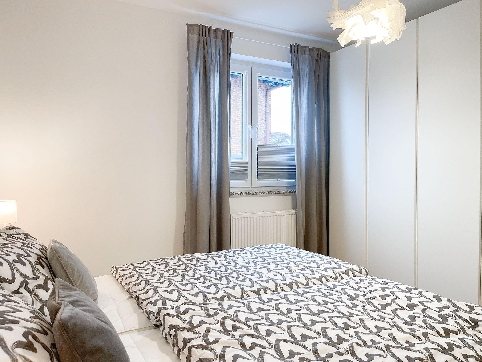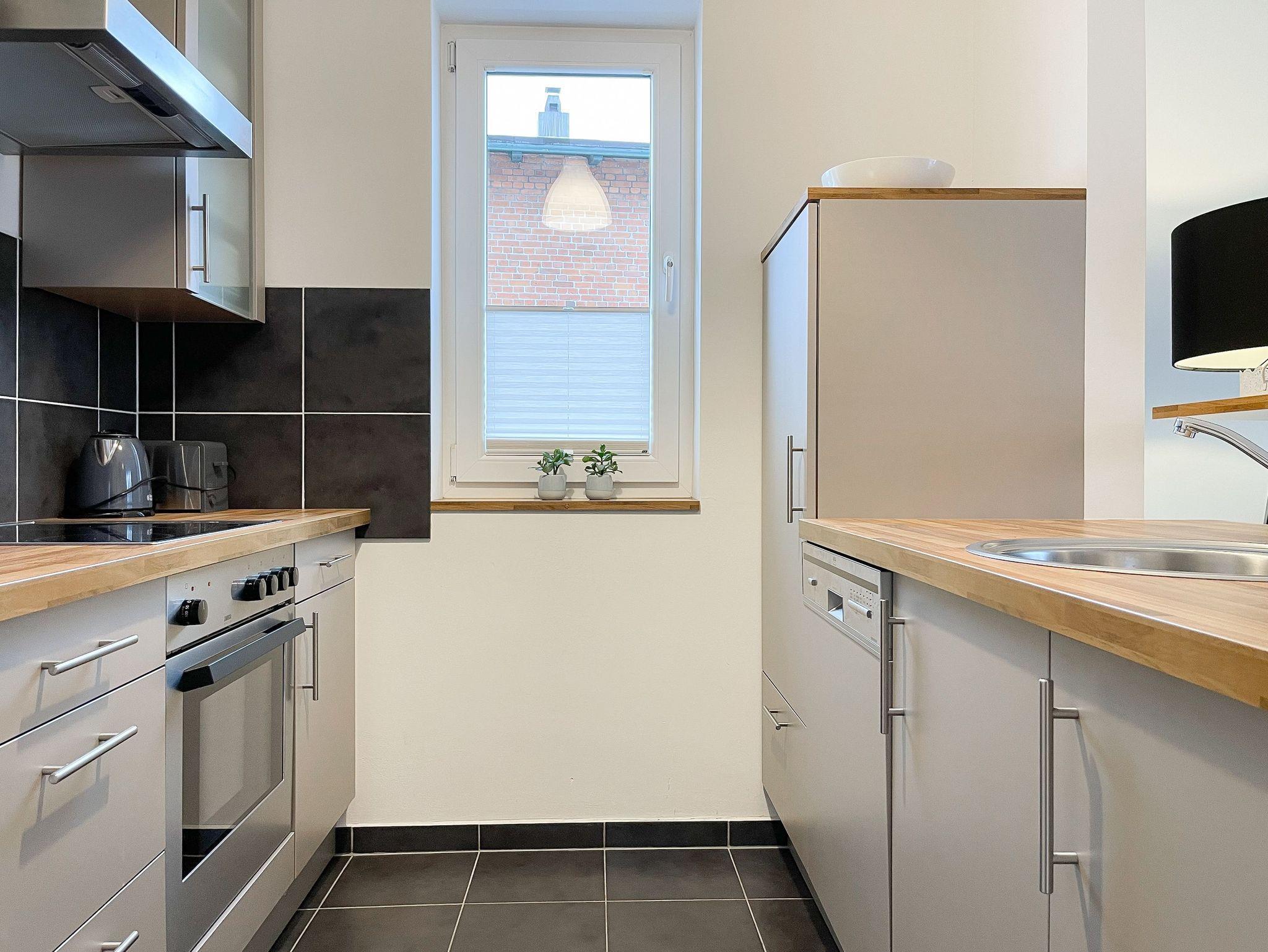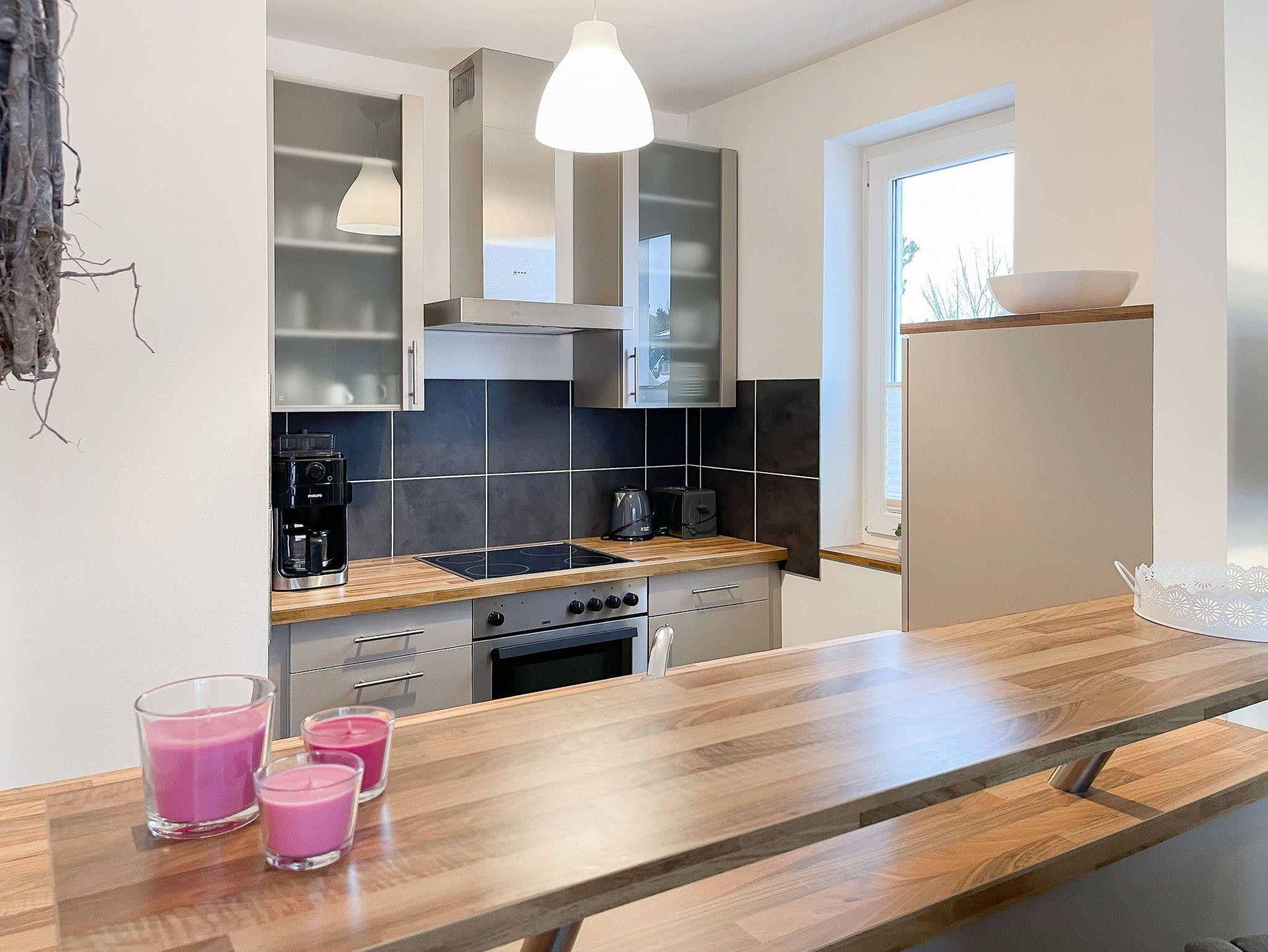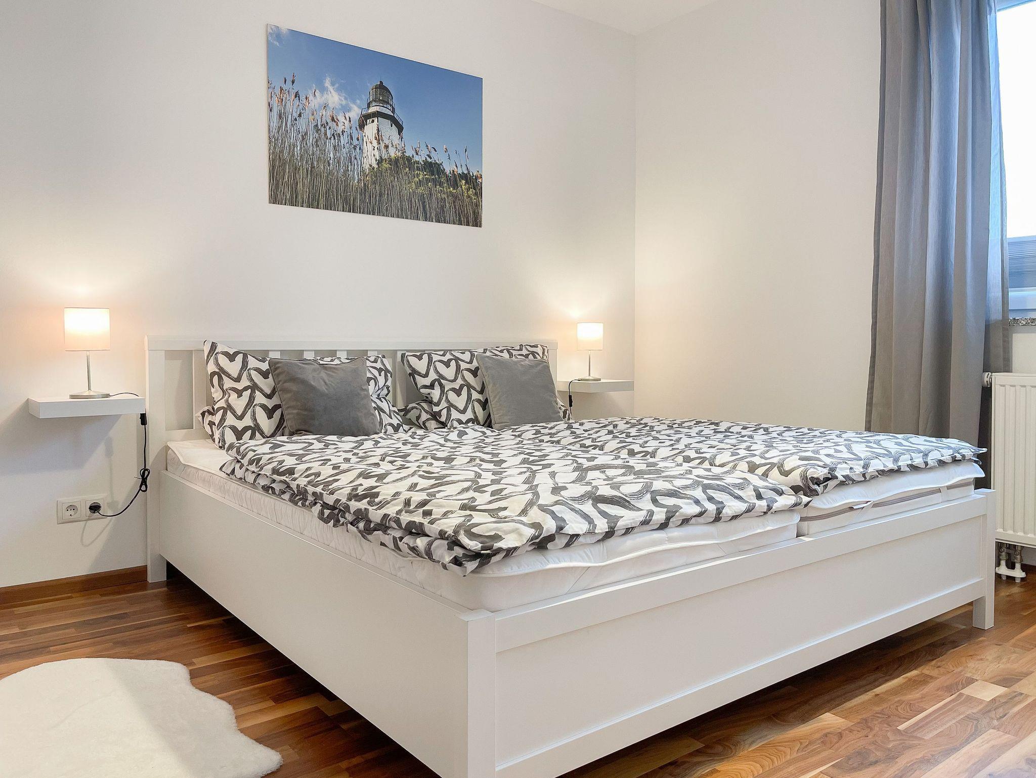 Ankommen und wohl fühlen in der liebevoll eingerichteten Ferienwohnung Kleine Jolle. Es erwartet Sie ein großzügiger Wohn- Essbereich, der mit einem Schlafsofa (140x190), einem gemütlichen Lesesessel, TV, Hifi-Anlage und WLAN ausgestattet ist. Bodentiefe Fensterelemente führen auf den Balkon in Nordwest Ausrichtung, um die letzen Sonnenstunden zu genießen. Der anschließende Essbereich bietet ausreichend Platz für 4 Personen. Die angrenzende Einbauküche mit Tresen ist bestens ausgestattet.[nbsp] Im separatem Schlafzimmer befindet sich ein Doppelbett (180x200), ein Kleiderschrank mit viel Staufläche sowie ein weiterer TV. Die Fenster lassen sich durch Plissees verdunkeln. Das moderne, großzügige Bad mit ist sowohl mit einer bodentiefen Walk-In Dusche als auch einer Badewanne ausgestattet. Ein Fahrstuhl ist vorhanden. Waschmaschine und Trockner (Münzgeräte) sind im Keller untergebracht und stehen zur gemeinschaftlichen Nutzung zur Verfügung. Ein reservierter Parkplatz auf dem Grundstück gehört zur Wohnung.