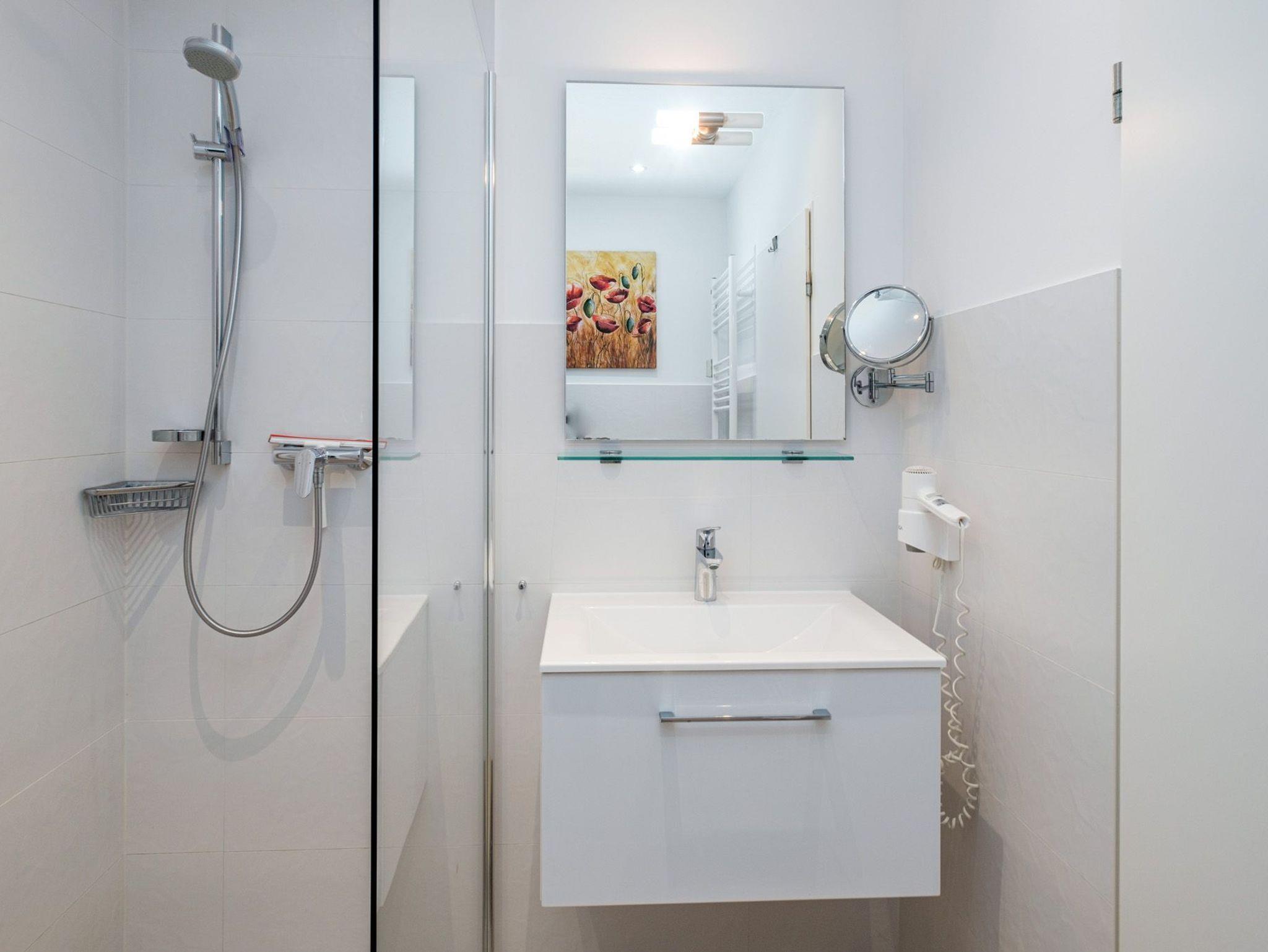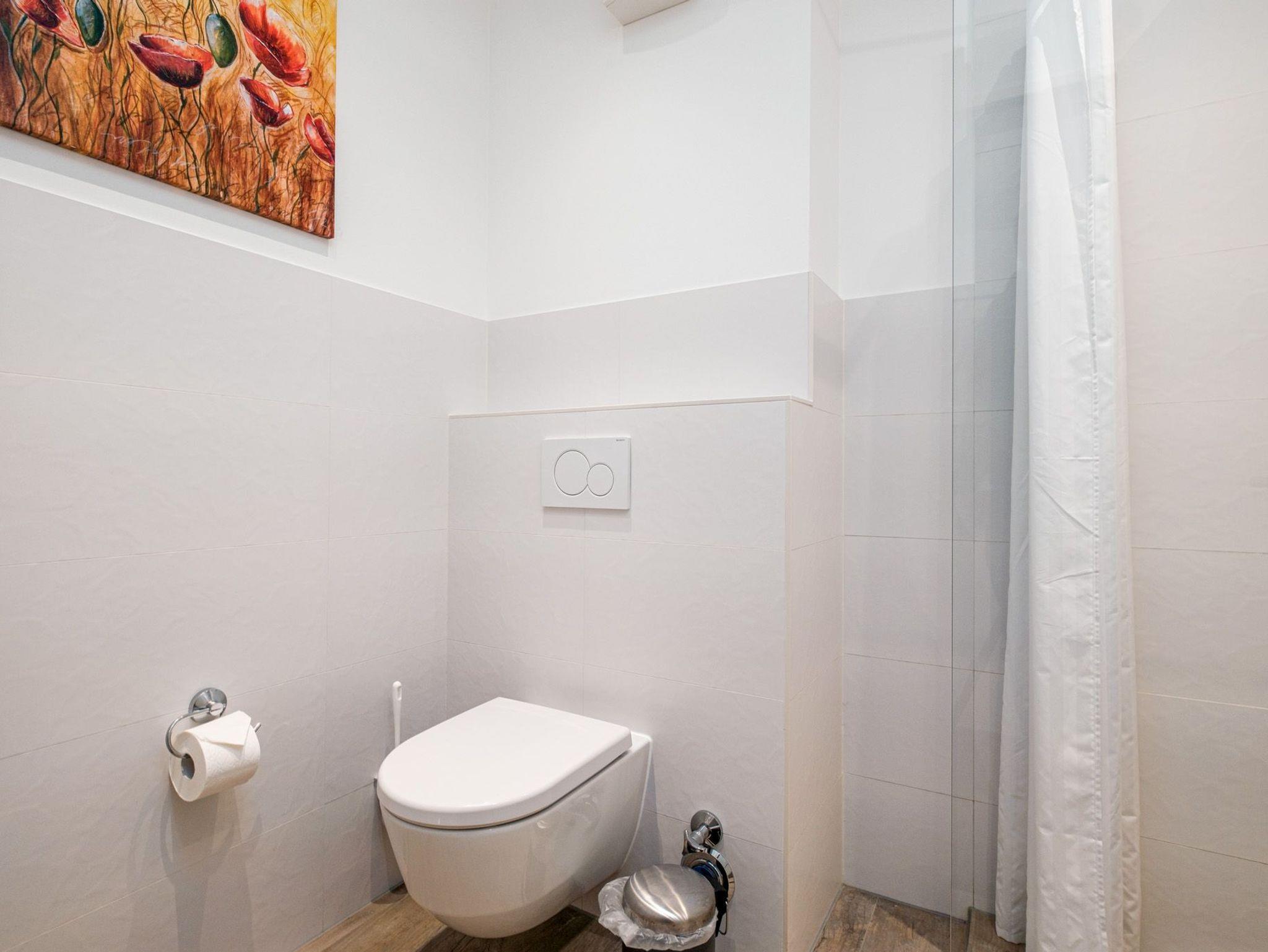 Im modernen Badezimmer mit einer Glasregendusche, WC, Fön und Handtuchwärmer erfrischen Sie sich nach einem erholsamen Tag am Strand.