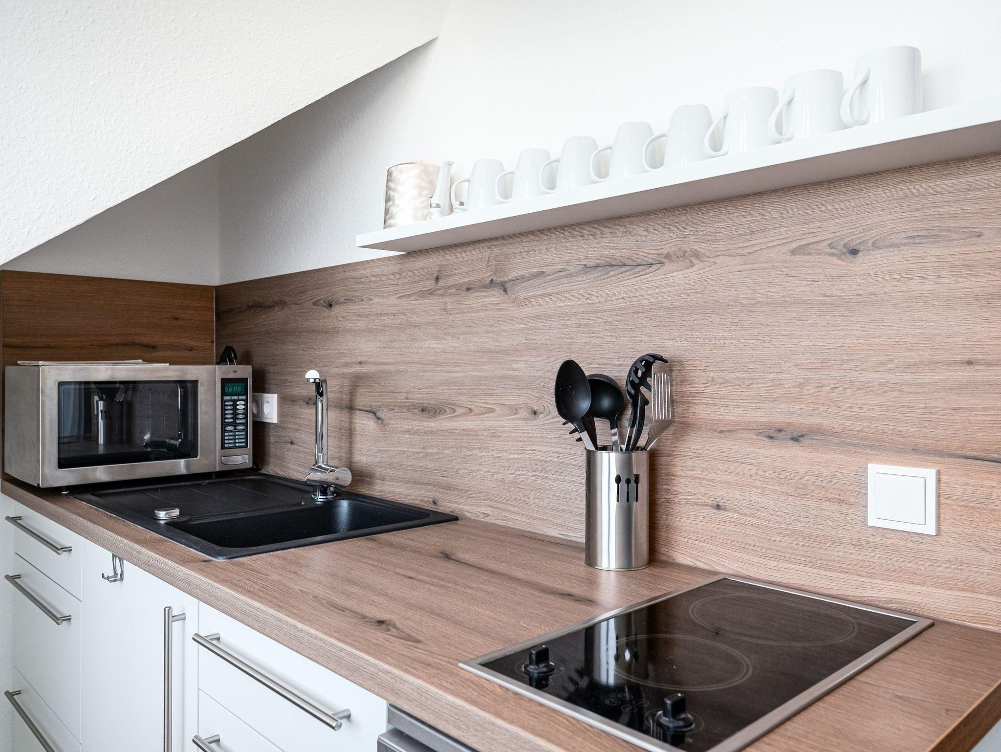 Die neue Küche ist mit Geschirrspüler, Mikrowelle und einem Stehtisch eingerichtet. Bei einer heißen Tasse Kaffee oder Kaltgetränk genießen Sie einen traumhaften Blick auf die Ostsee.