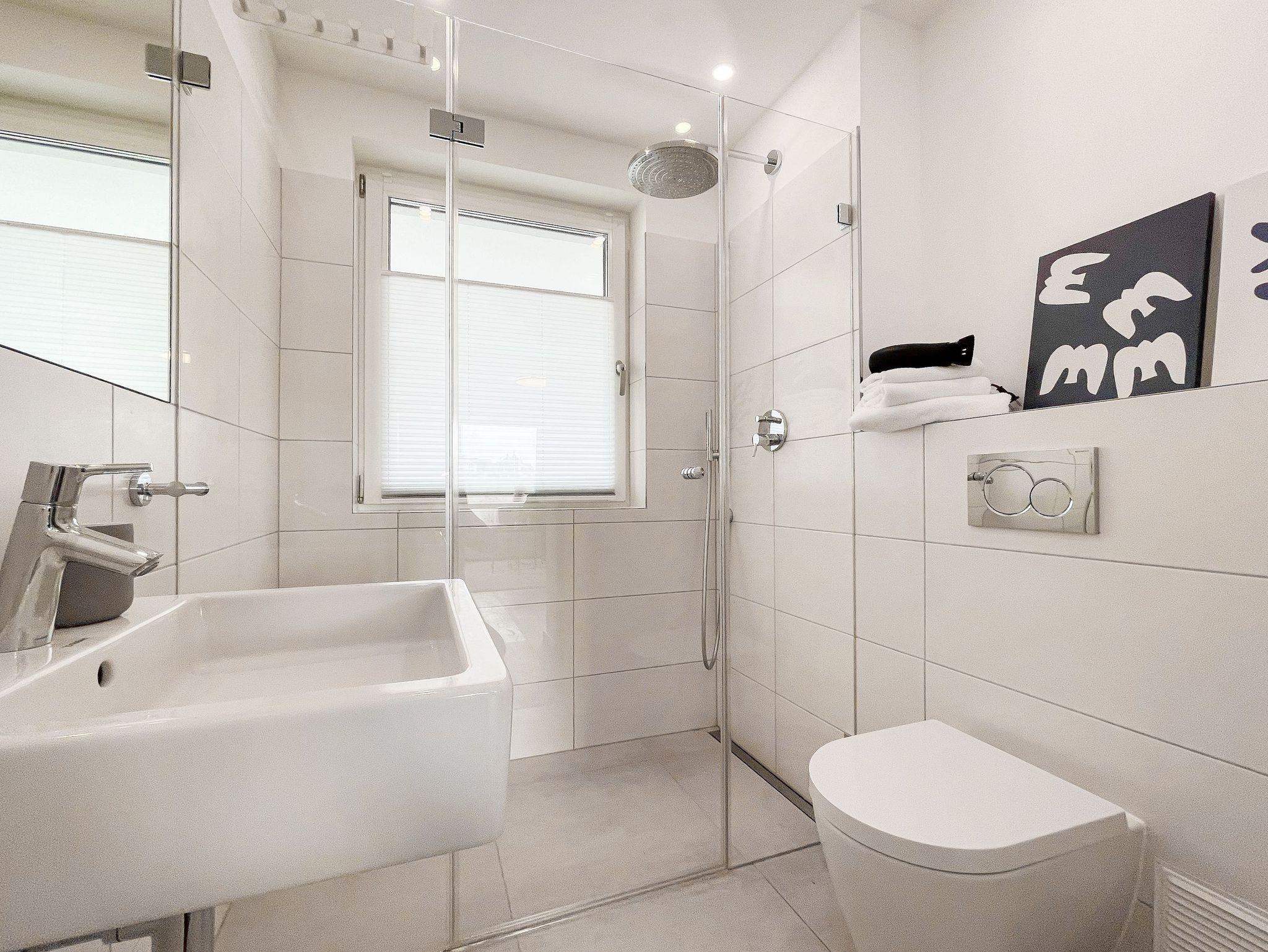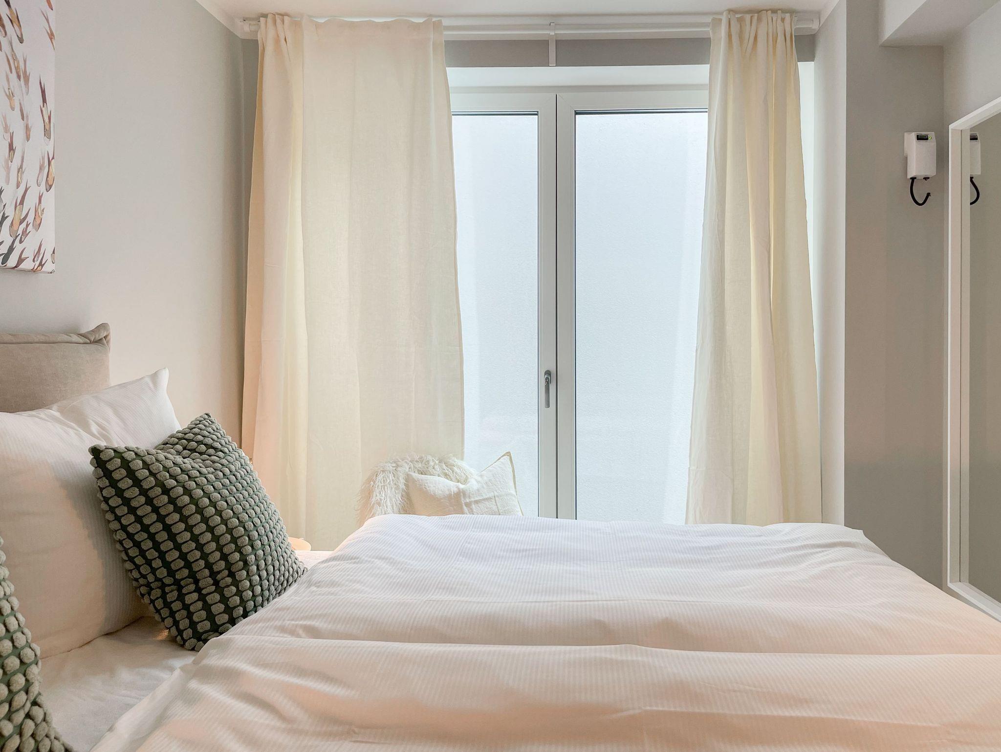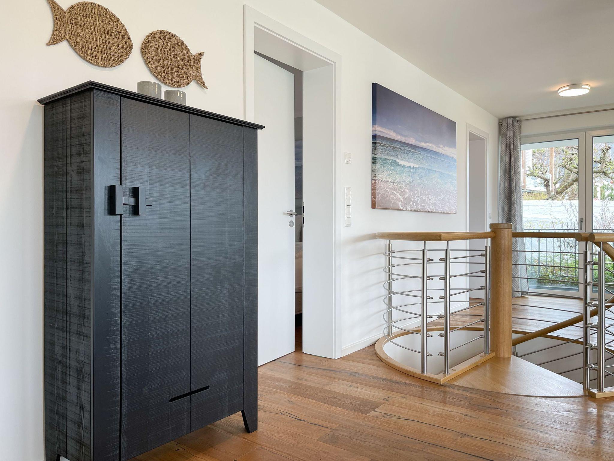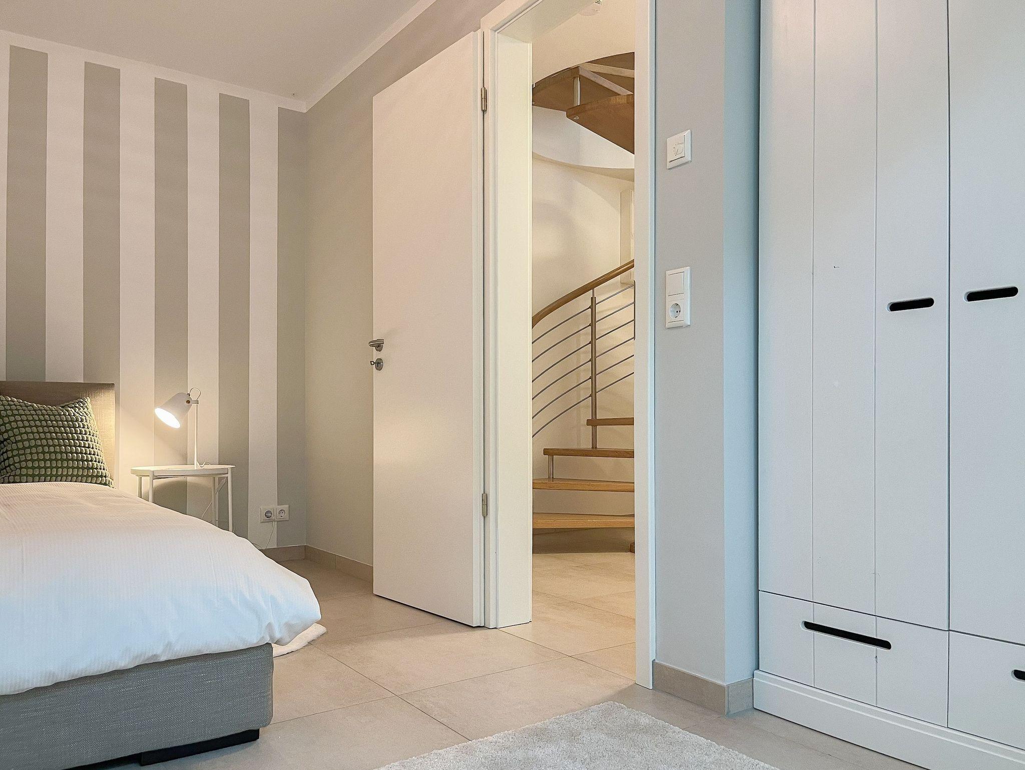 Über eine Wendeltreppe ist das Untergeschoss zu erreichen, das über bodentiefe Fenster und große begehbare Lichtschächte verfügt, sodass für ausreichend Tageslicht gesorgt ist. Hier befinden sich Schlafzimmer 2 mit einem Boxspringbett (180x200) und Schlafzimmer 3 mit einem Einzelbett (120x200). Die Fenster sind mit Vorhängen versehen, um die Räume abzudunkeln. Zwischen den Schlafräumen ist ein weiteres Bad untergebracht, ausgestattet mit einer kleinen bodenebenen Dusche, kleinem Waschbecken, WC, Handtuchtrockner und Fenster. Die notwendige Hebeanlage für dieses Bad ist im Erdreich unter dem Schlafzimmer 2 verbaut. Bei vollständiger Füllung, ist ein kurzes Abpumpgeräusch wahrnehmbar.