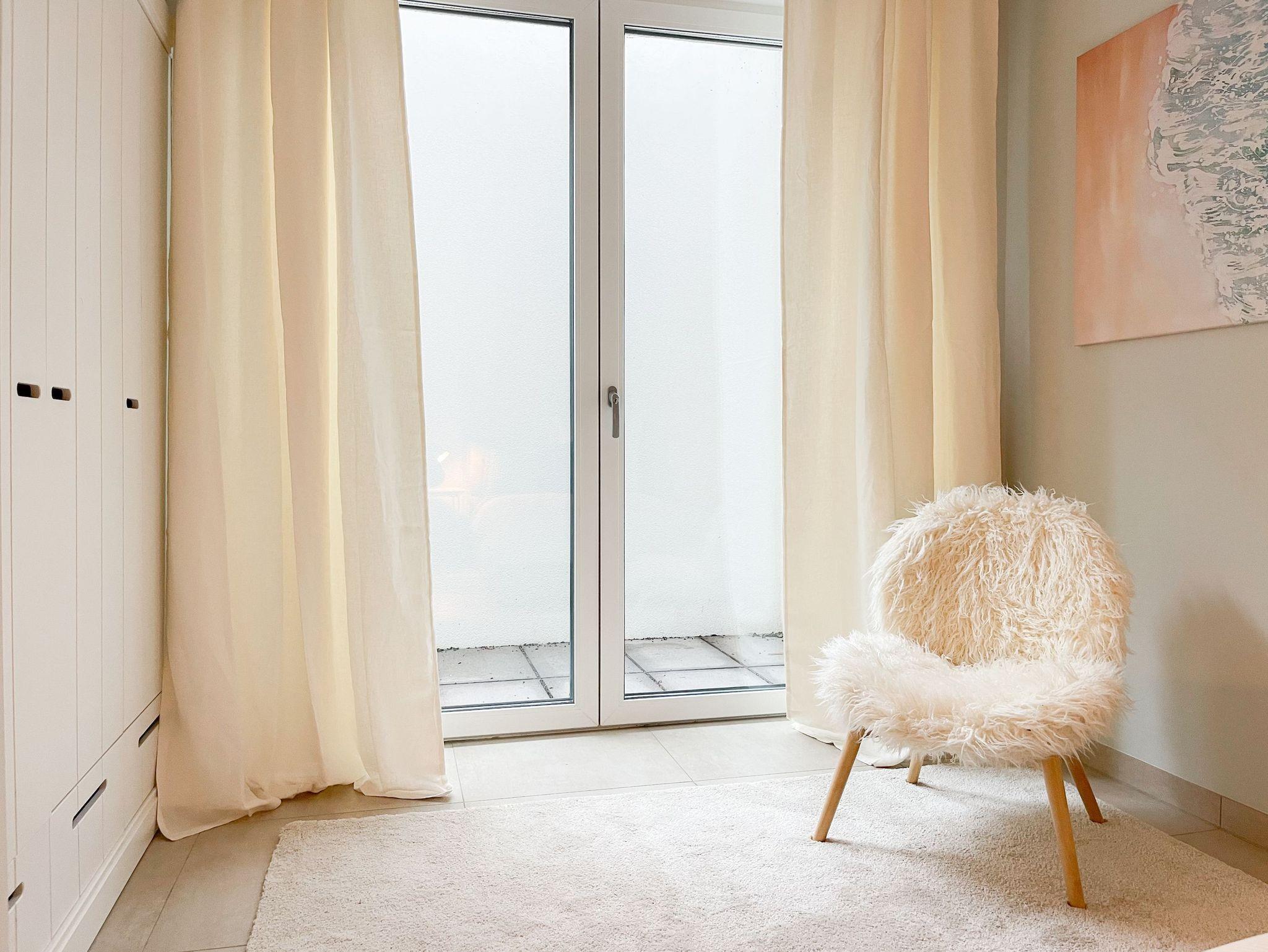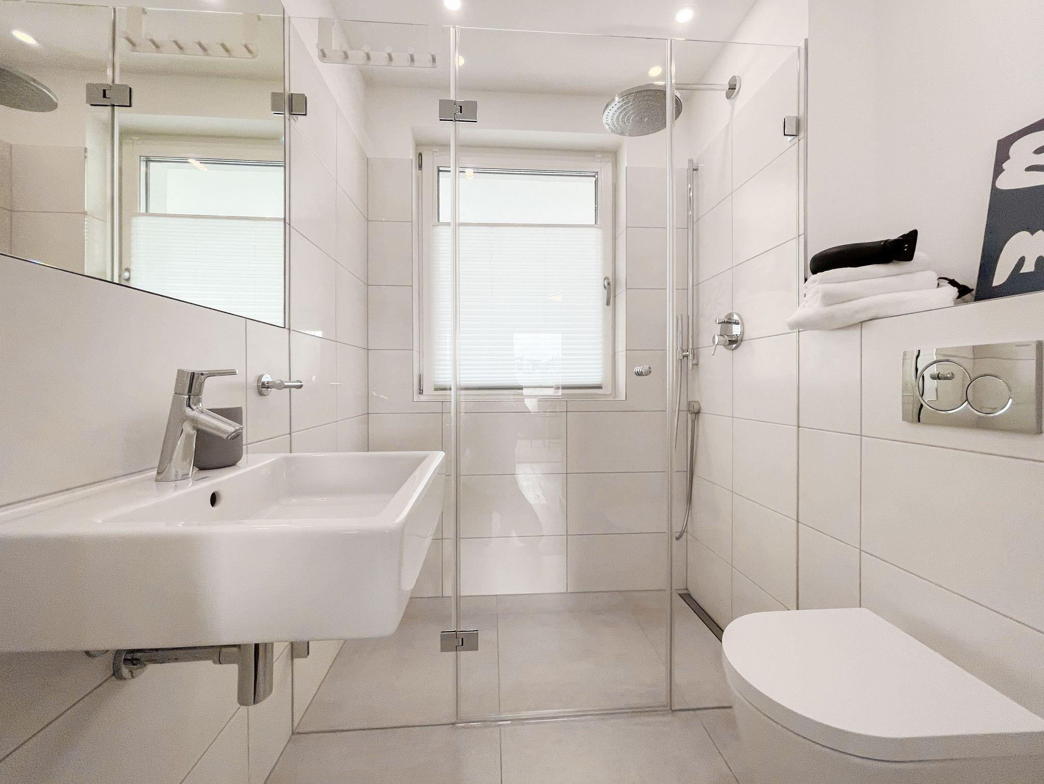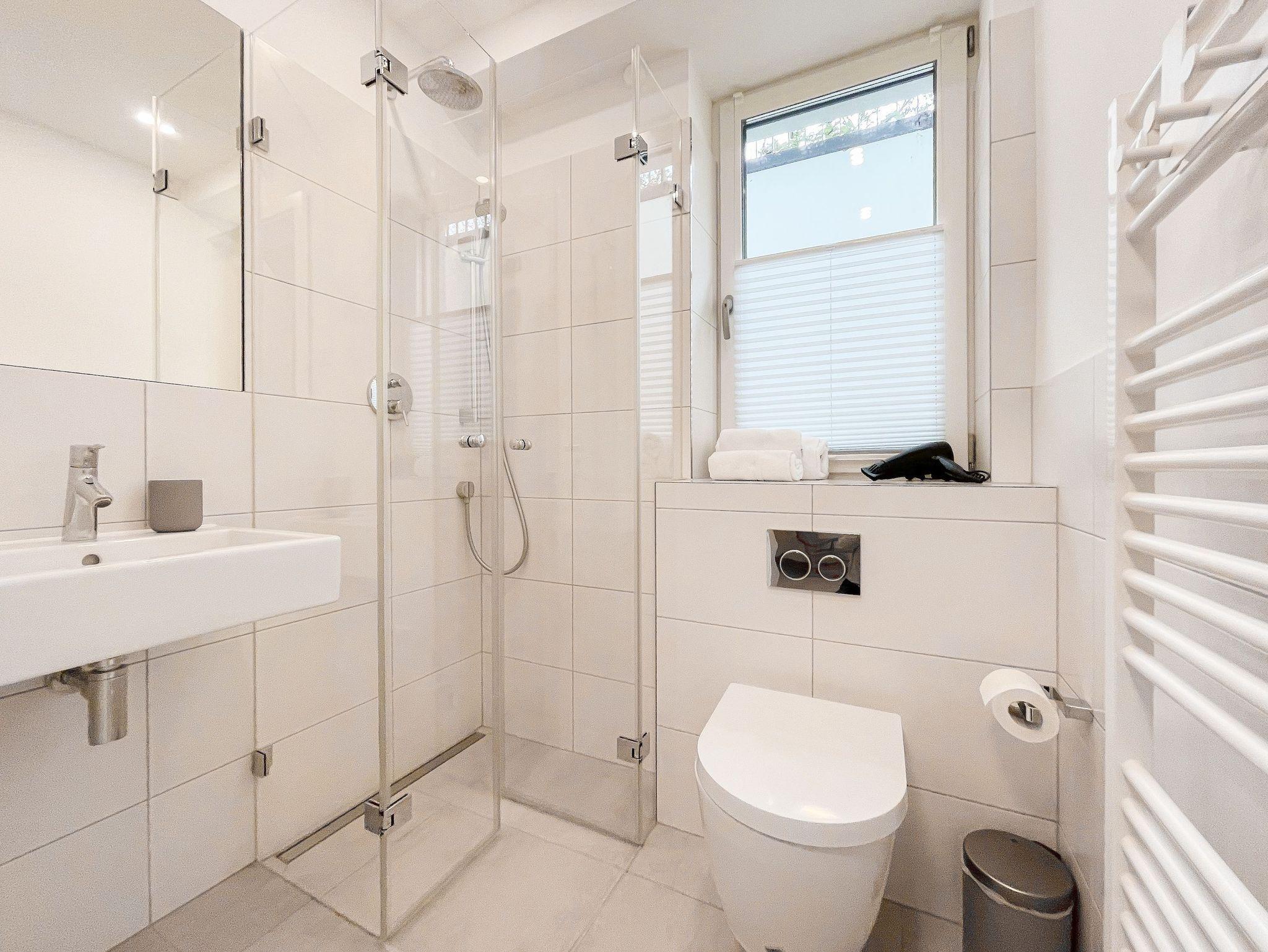 Über eine Wendeltreppe ist das Untergeschoss zu erreichen, das über bodentiefe Fenster und große begehbare Lichtschächte verfügt, sodass für ausreichend Tageslicht gesorgt ist. Hier befinden sich Schlafzimmer 2 mit einem Boxspringbett (180x200) und Schlafzimmer 3 mit einem Einzelbett (120x200). Die Fenster sind mit Vorhängen versehen, um die Räume abzudunkeln. Zwischen den Schlafräumen ist ein weiteres Bad untergebracht, ausgestattet mit einer kleinen bodenebenen Dusche, kleinem Waschbecken, WC, Handtuchtrockner und Fenster. Die notwendige Hebeanlage für dieses Bad ist im Erdreich unter dem Schlafzimmer 2 verbaut. Bei vollständiger Füllung, ist ein kurzes Abpumpgeräusch wahrnehmbar.
