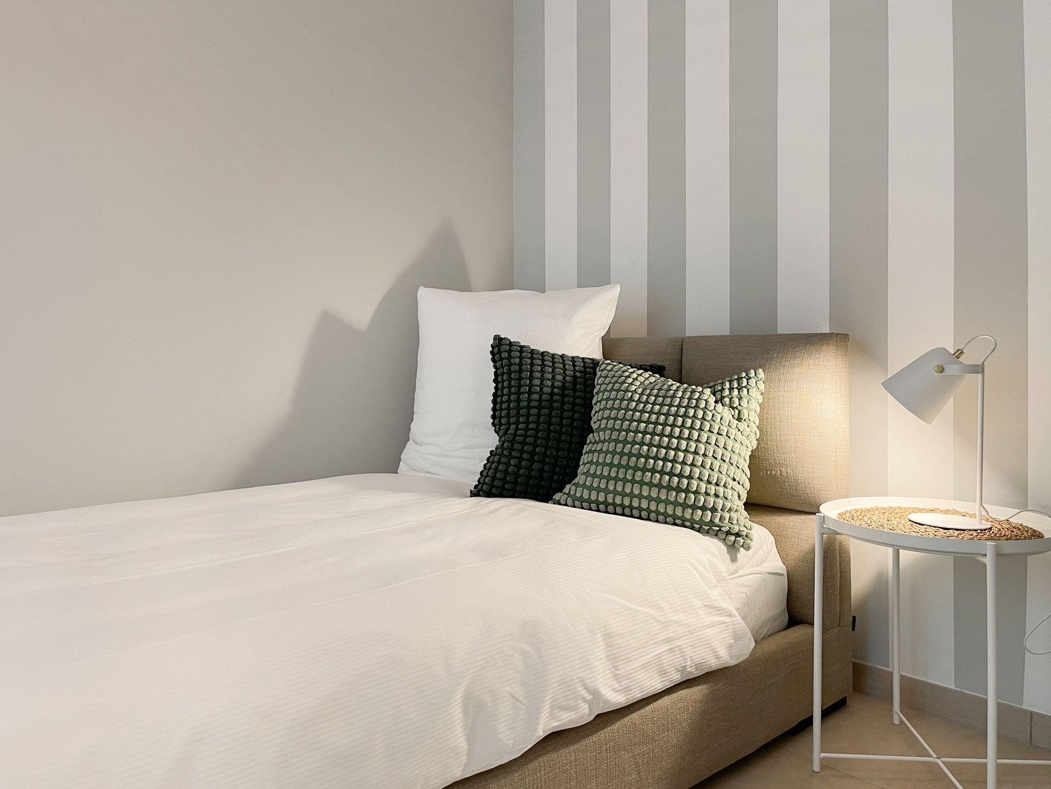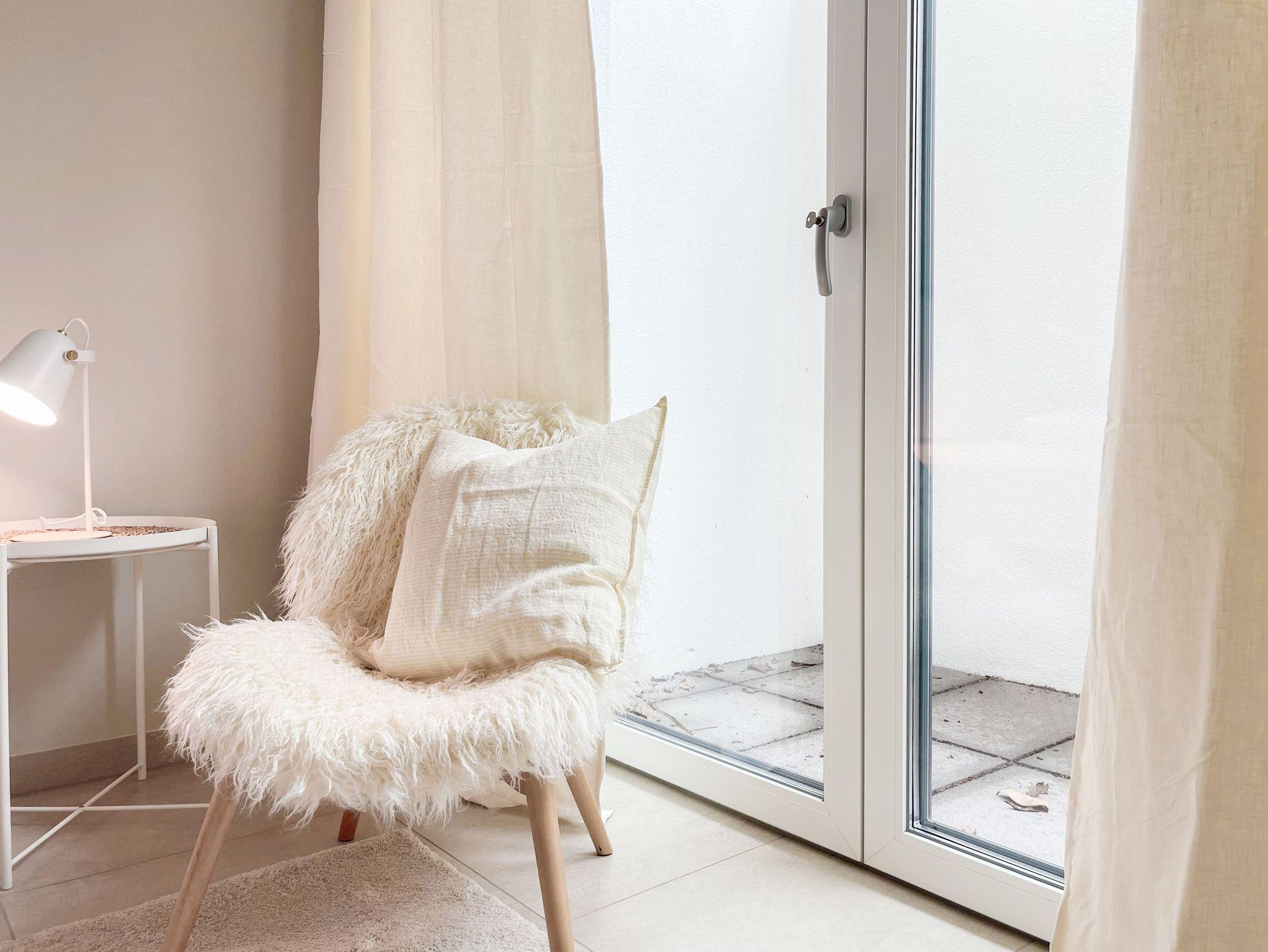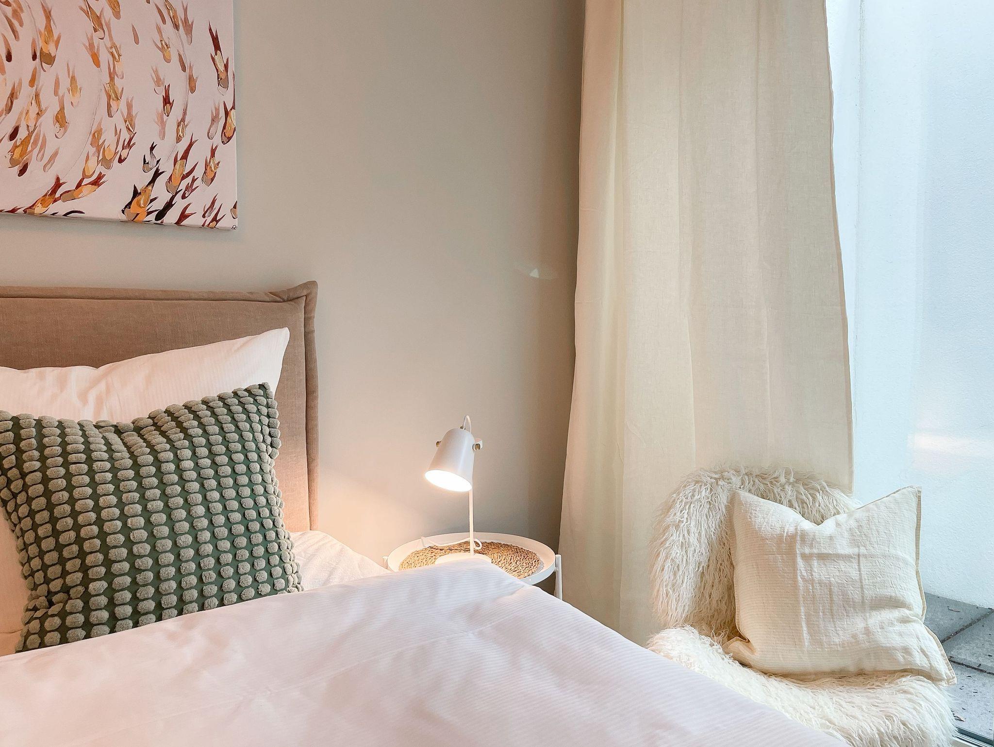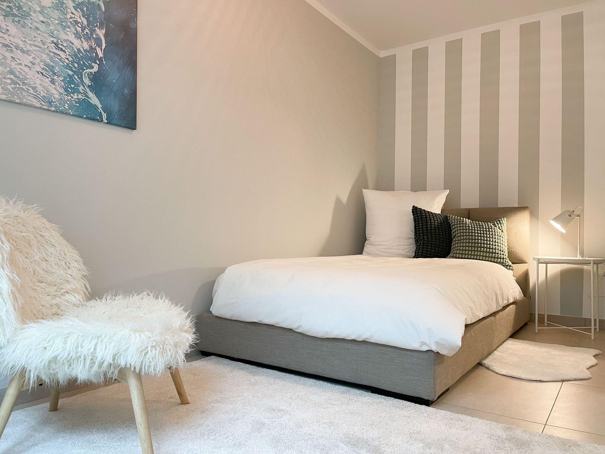 Über eine Wendeltreppe ist das Untergeschoss zu erreichen, das über bodentiefe Fenster und große begehbare Lichtschächte verfügt, sodass für ausreichend Tageslicht gesorgt ist. Hier befinden sich Schlafzimmer 2 mit einem Boxspringbett (180x200) und Schlafzimmer 3 mit einem Einzelbett (120x200). Die Fenster sind mit Vorhängen versehen, um die Räume abzudunkeln. Zwischen den Schlafräumen ist ein weiteres Bad untergebracht, ausgestattet mit einer kleinen bodenebenen Dusche, kleinem Waschbecken, WC, Handtuchtrockner und Fenster. Die notwendige Hebeanlage für dieses Bad ist im Erdreich unter dem Schlafzimmer 2 verbaut. Bei vollständiger Füllung, ist ein kurzes Abpumpgeräusch wahrnehmbar.