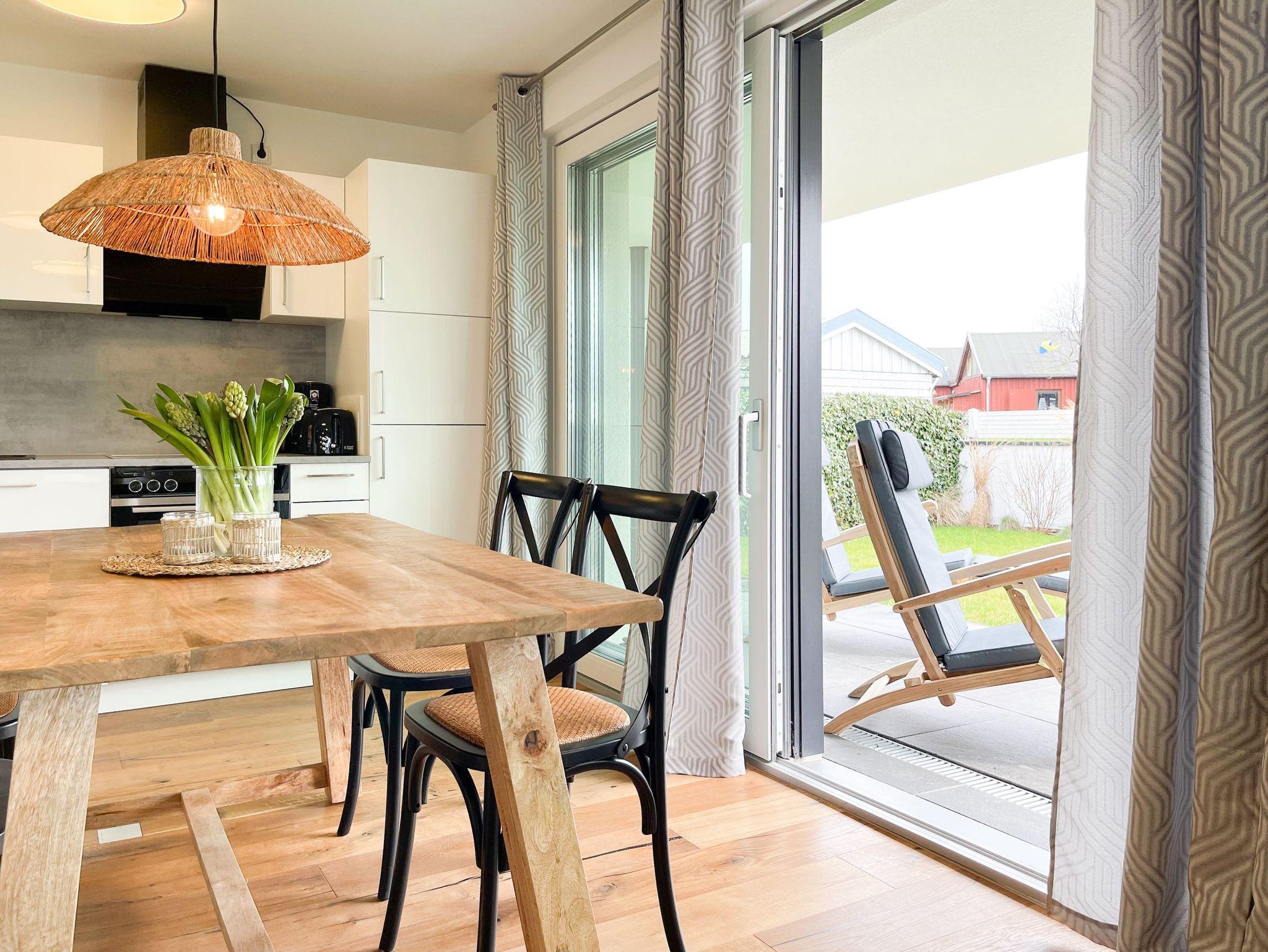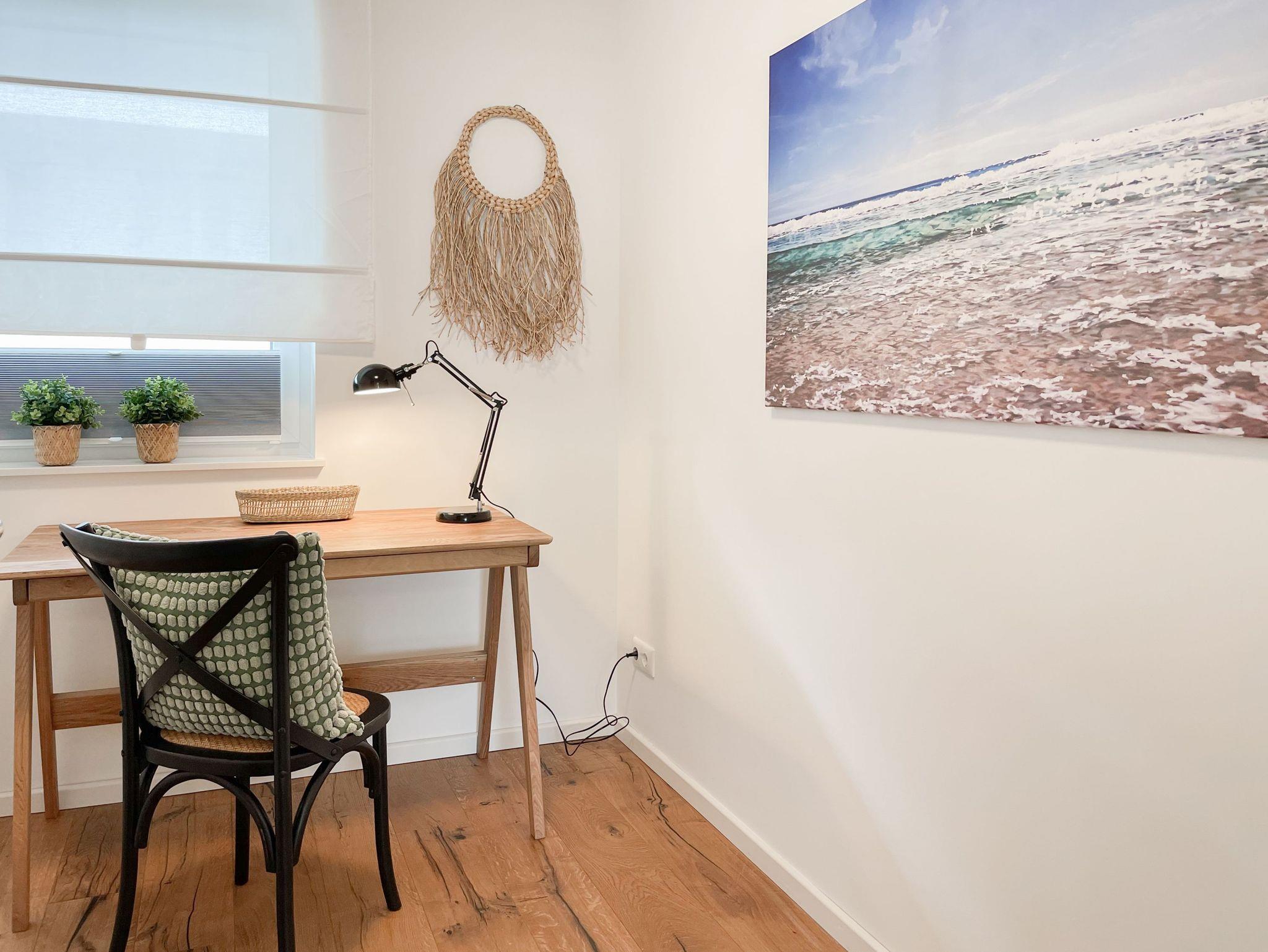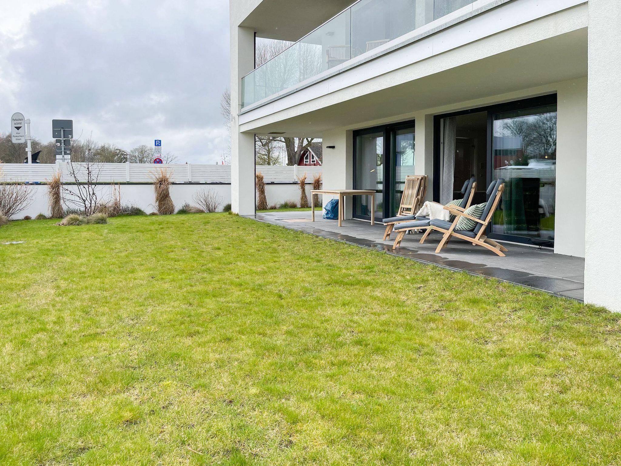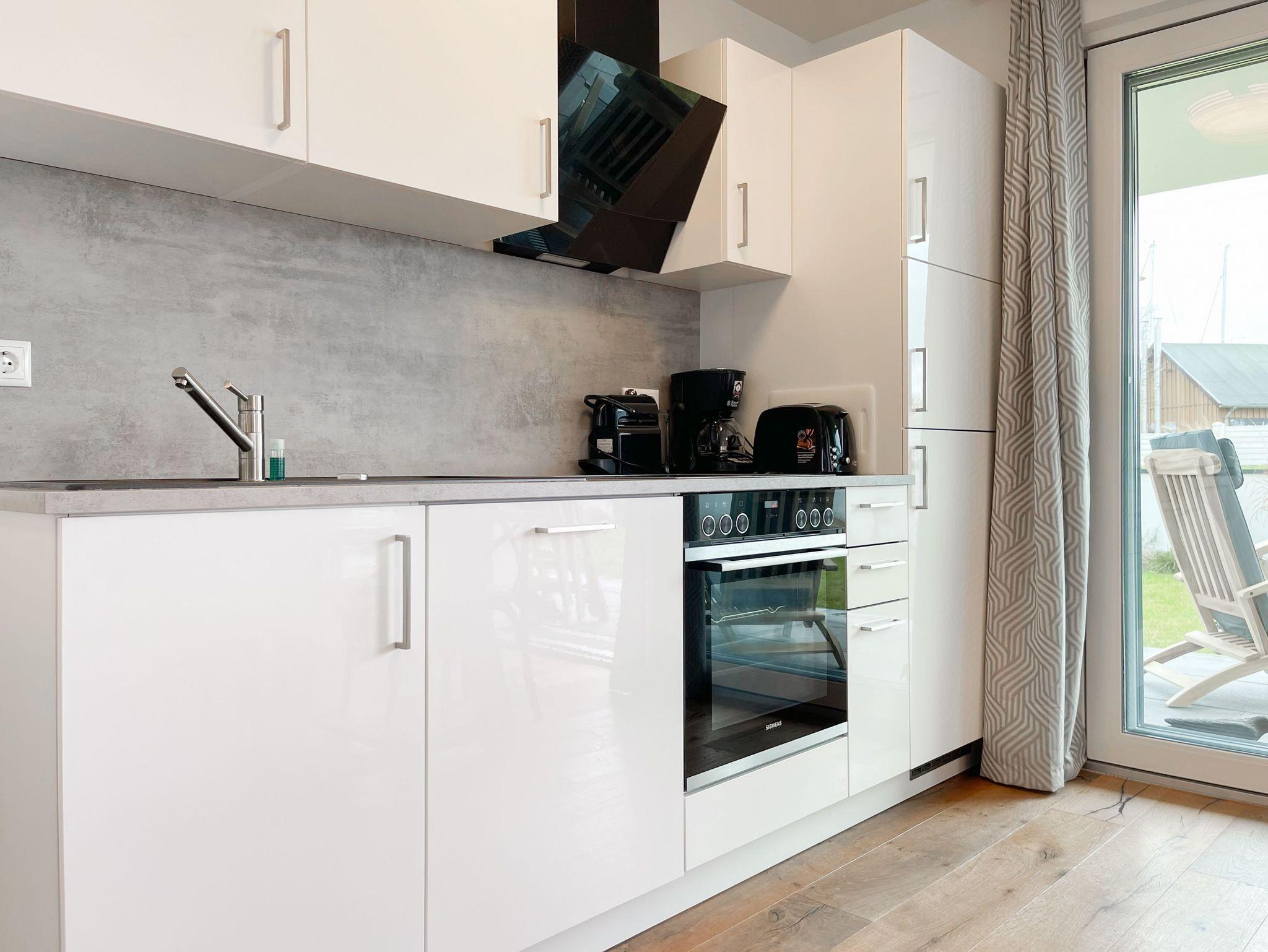 Die Ferienwohnung Hafendeck liegt im Erdgeschoss eines modernen Neubaus mit nur 3 Wohneinheiten und bietet auf 100 qm über 2 Wohnebenen ausreichend Raum für 5 Personen, um einen entspannten Urlaub in absoluter Strandnähe zu verleben. Das Herzstück der Wohnung bildet der lichtdurchflutete Wohn- und Essbereich mit[nbsp] bodentiefen Fensterelementen und einem schönen Blick auf die Holzterrasse und in den Garten, der ausschließlich von den Gästen des Hafendecks genutzt wird. Die großzügig angelegte Sonnenterrasse ist überdacht und sowohl zum Süden als auch zum Westen ausgerichtet. Gartenmöbel und 2 Deckchairs stehen zur Verfügung, um die Sonne von früh bis spät in besonderer Hafenatmosphäre zu genießen und sich an beeindruckenden Sonnenuntergängen bei einem Glas Wein zu erfreuen. Die offene Küche ist in den Wohnbereich integriert und bestens ausgestattet. Im EG befindet sich auch Schlafzimmer 1 mit einem Boxspringbett (160x200), geräumigem Kleiderschrank und Verdunkelungsplissees sowie ein kleines Bad mit Dusche, WC, Waschbecken und Fenster. Als Home Office dient ein weiterer abgeschlossener Raum, der mit einem Schreibtisch eingerichtet ist.