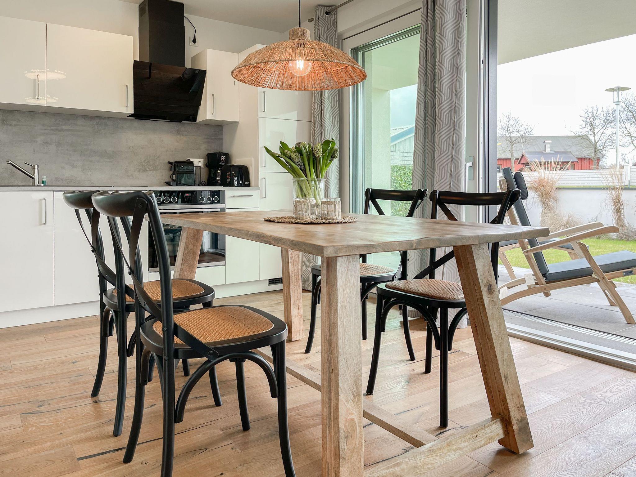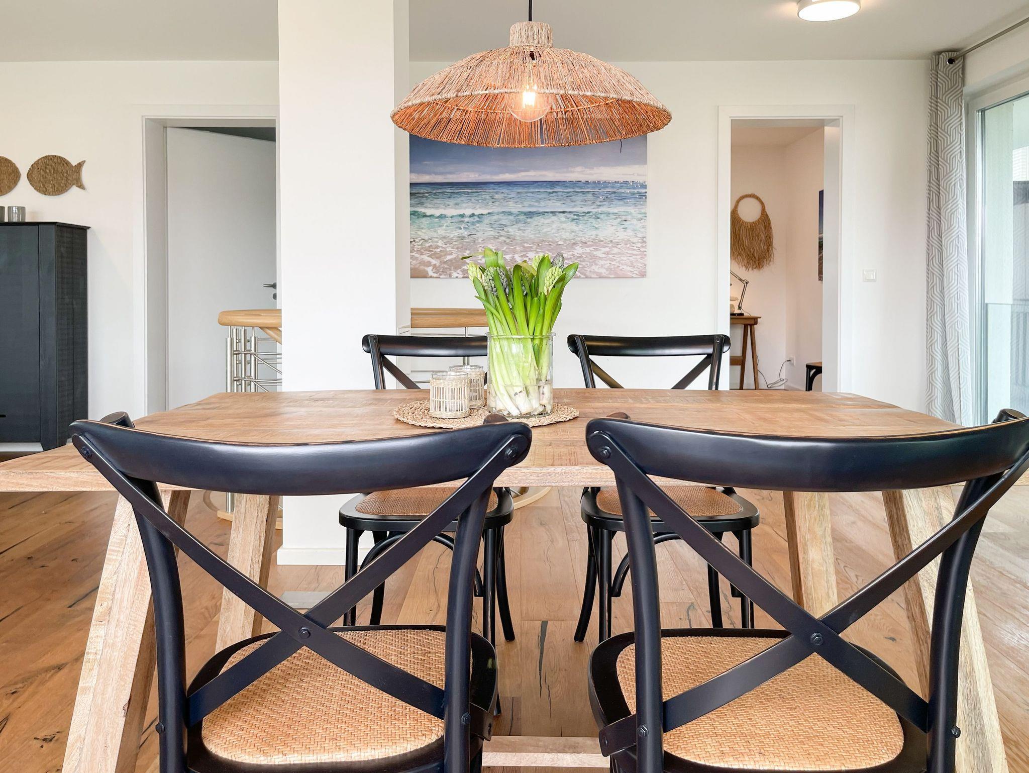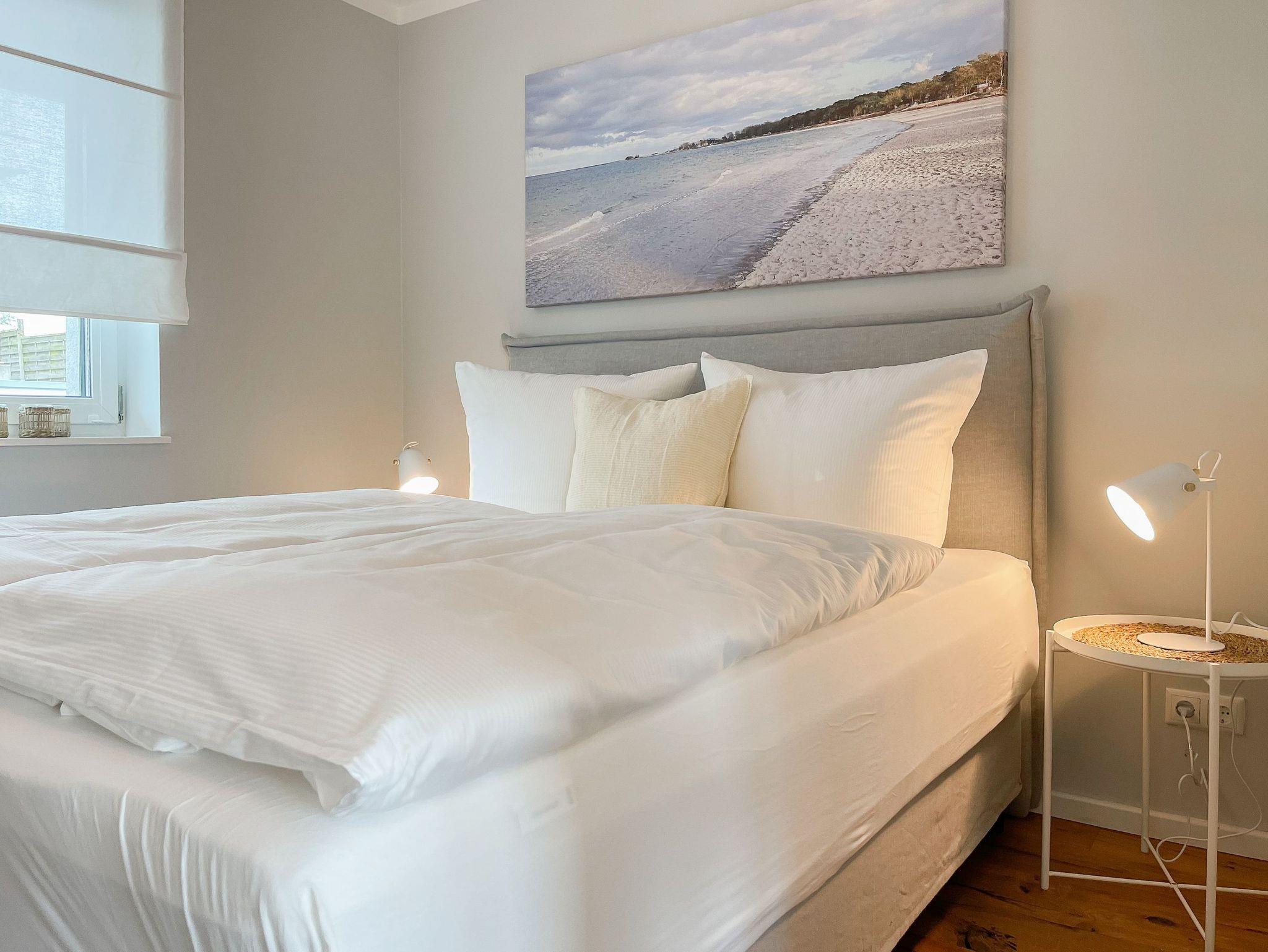 Die Ferienwohnung Hafendeck liegt im Erdgeschoss eines modernen Neubaus mit nur 3 Wohneinheiten und bietet auf 100 qm über 2 Wohnebenen ausreichend Raum für 5 Personen, um einen entspannten Urlaub in absoluter Strandnähe zu verleben. Das Herzstück der Wohnung bildet der lichtdurchflutete Wohn- und Essbereich mit[nbsp] bodentiefen Fensterelementen und einem schönen Blick auf die Holzterrasse und in den Garten, der ausschließlich von den Gästen des Hafendecks genutzt wird. Die großzügig angelegte Sonnenterrasse ist überdacht und sowohl zum Süden als auch zum Westen ausgerichtet. Gartenmöbel und 2 Deckchairs stehen zur Verfügung, um die Sonne von früh bis spät in besonderer Hafenatmosphäre zu genießen und sich an beeindruckenden Sonnenuntergängen bei einem Glas Wein zu erfreuen. Die offene Küche ist in den Wohnbereich integriert und bestens ausgestattet. Im EG befindet sich auch Schlafzimmer 1 mit einem Boxspringbett (160x200), geräumigem Kleiderschrank und Verdunkelungsplissees sowie ein kleines Bad mit Dusche, WC, Waschbecken und Fenster. Als Home Office dient ein weiterer abgeschlossener Raum, der mit einem Schreibtisch eingerichtet ist.