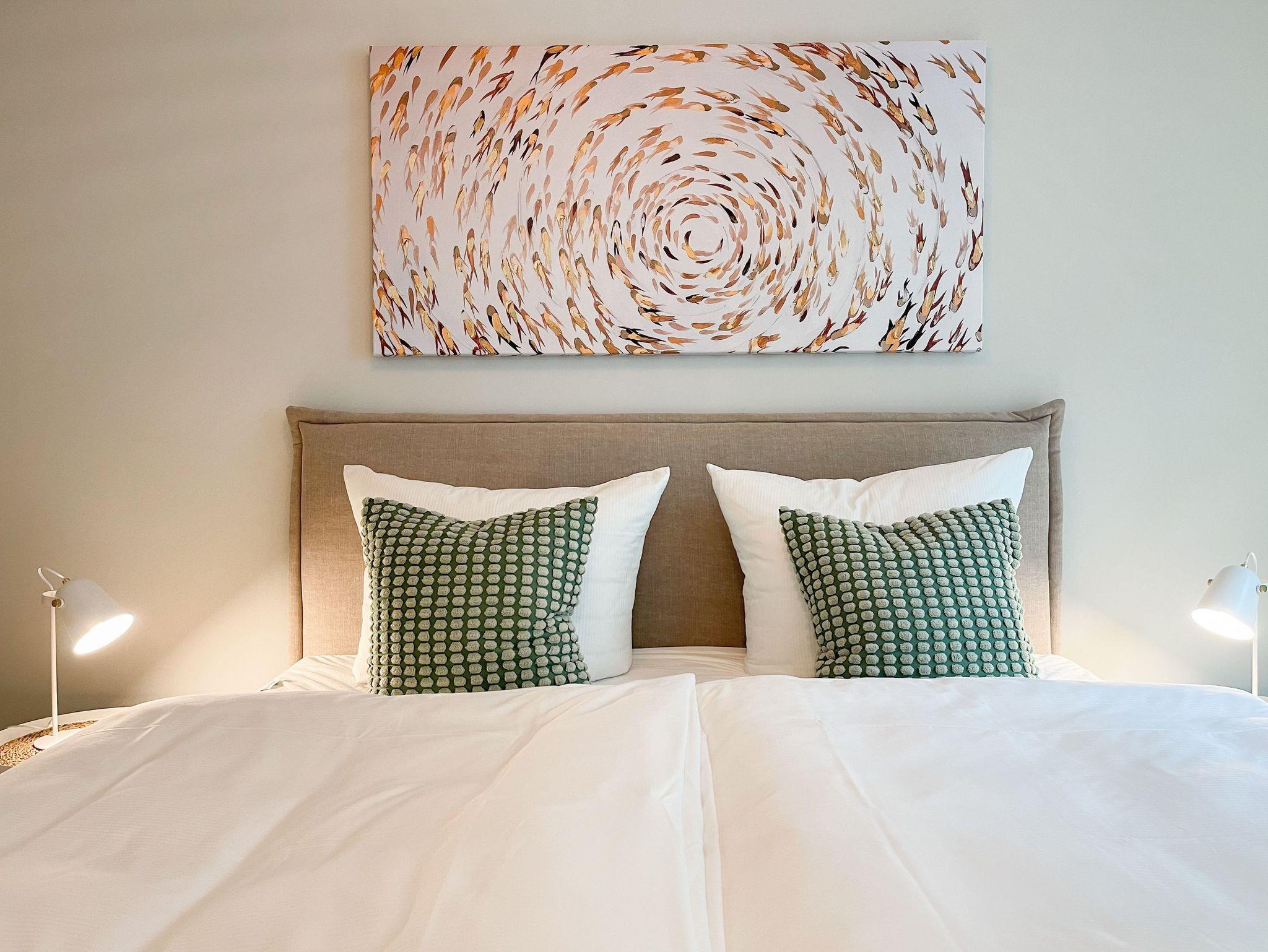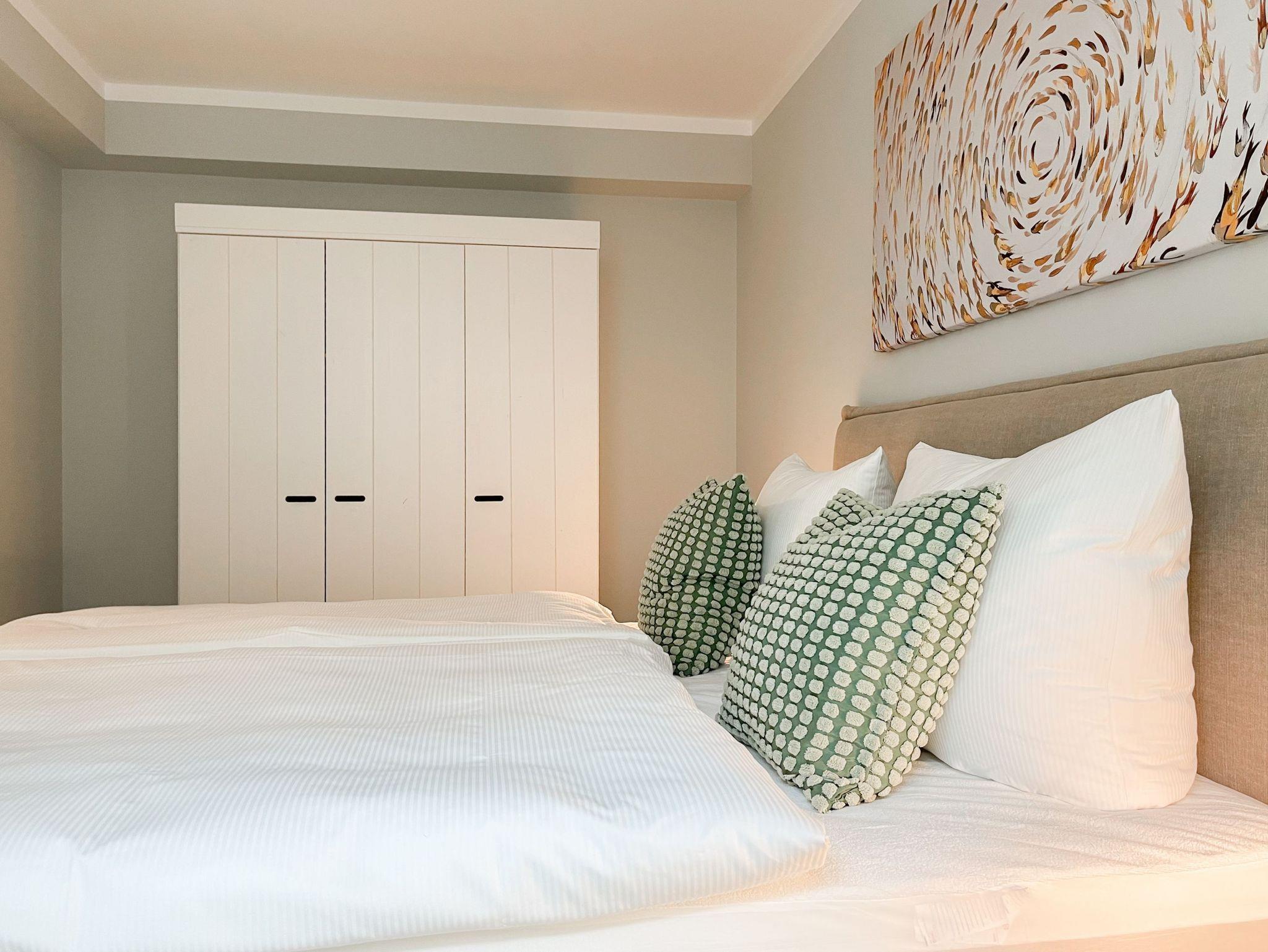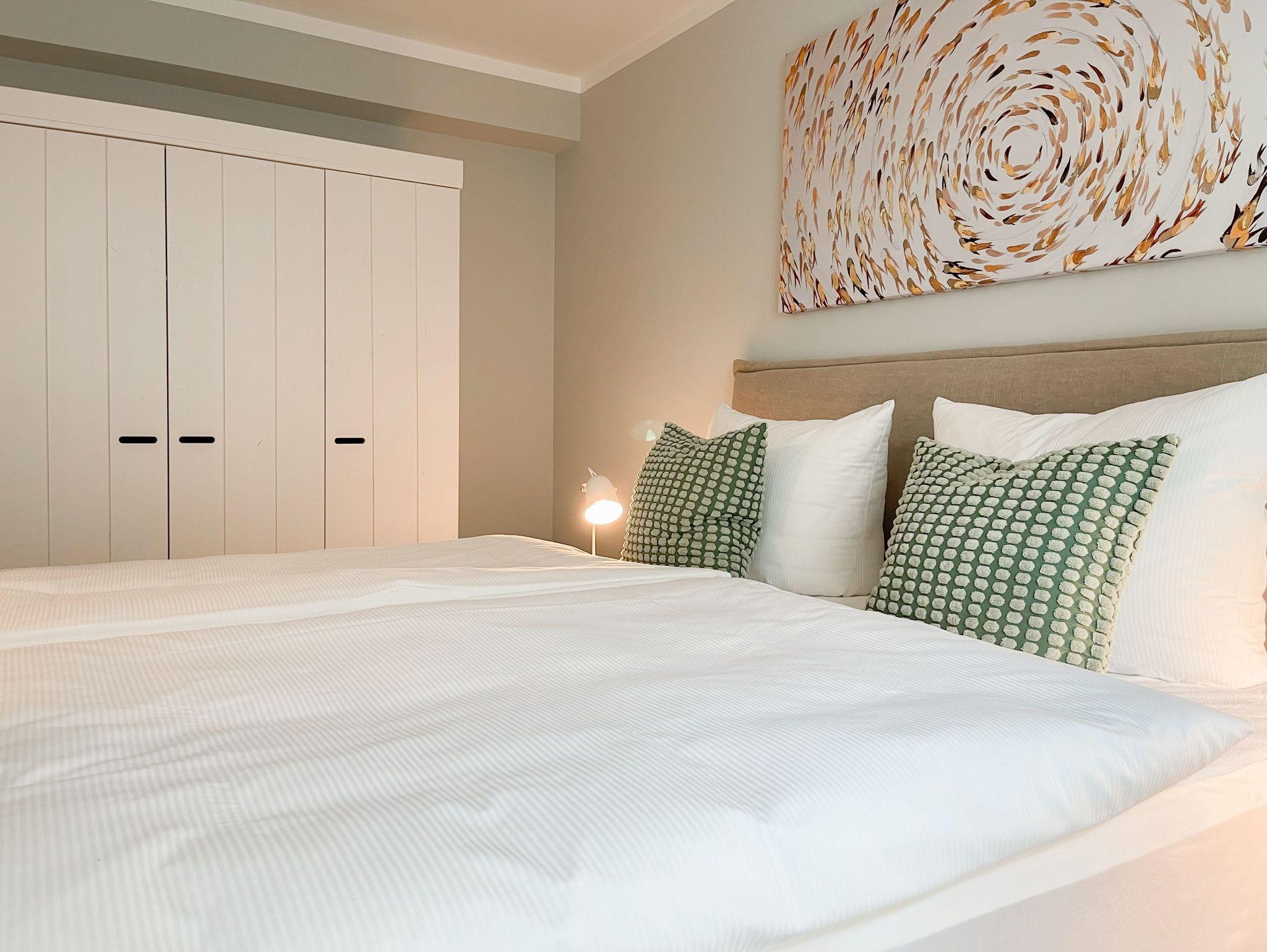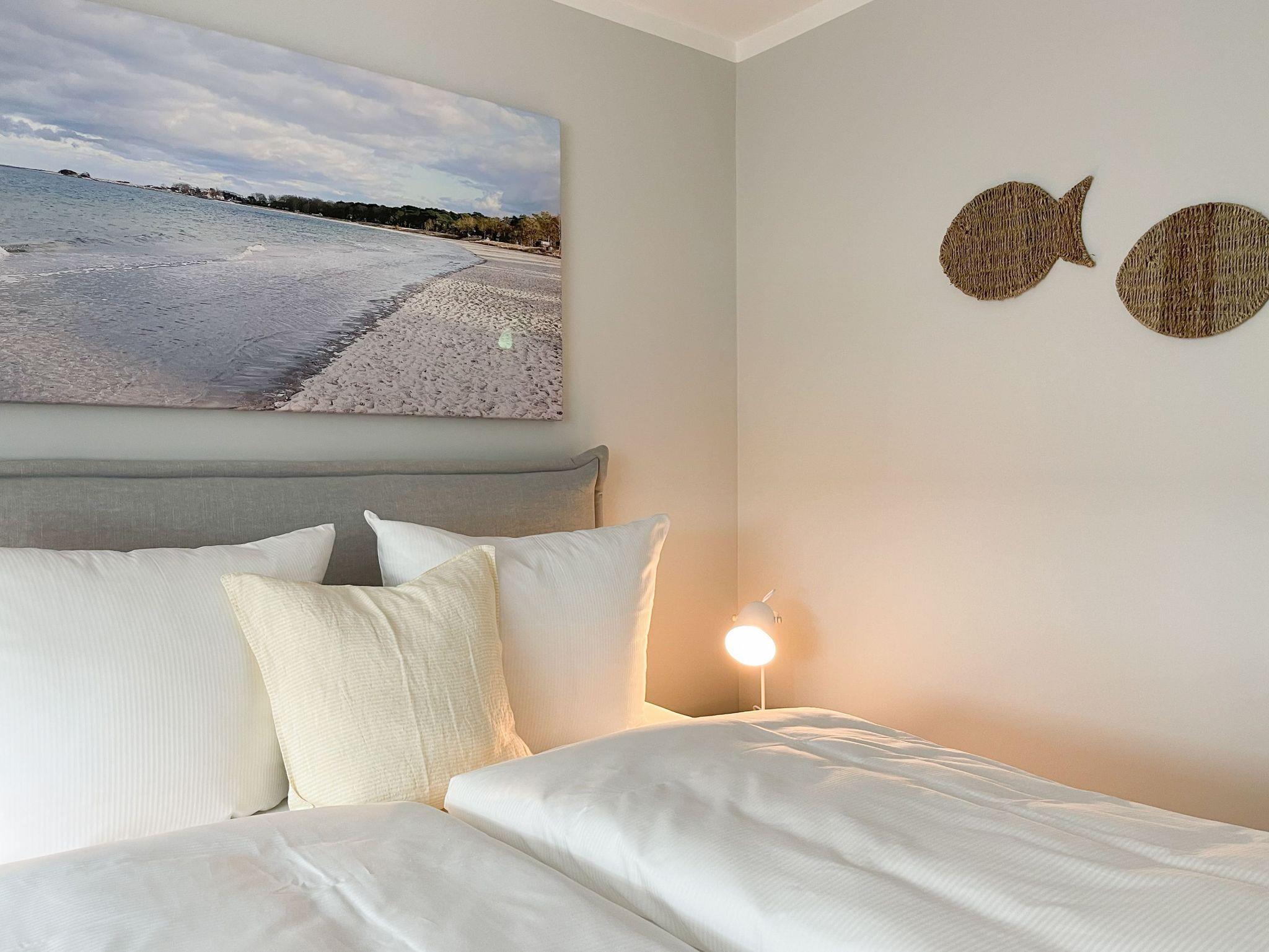 Die Ferienwohnung Hafendeck liegt im Erdgeschoss eines modernen Neubaus mit nur 3 Wohneinheiten und bietet auf 100 qm über 2 Wohnebenen ausreichend Raum für 5 Personen, um einen entspannten Urlaub in absoluter Strandnähe zu verleben. Das Herzstück der Wohnung bildet der lichtdurchflutete Wohn- und Essbereich mit[nbsp] bodentiefen Fensterelementen und einem schönen Blick auf die Holzterrasse und in den Garten, der ausschließlich von den Gästen des Hafendecks genutzt wird. Die großzügig angelegte Sonnenterrasse ist überdacht und sowohl zum Süden als auch zum Westen ausgerichtet. Gartenmöbel und 2 Deckchairs stehen zur Verfügung, um die Sonne von früh bis spät in besonderer Hafenatmosphäre zu genießen und sich an beeindruckenden Sonnenuntergängen bei einem Glas Wein zu erfreuen. Die offene Küche ist in den Wohnbereich integriert und bestens ausgestattet. Im EG befindet sich auch Schlafzimmer 1 mit einem Boxspringbett (160x200), geräumigem Kleiderschrank und Verdunkelungsplissees sowie ein kleines Bad mit Dusche, WC, Waschbecken und Fenster. Als Home Office dient ein weiterer abgeschlossener Raum, der mit einem Schreibtisch eingerichtet ist.