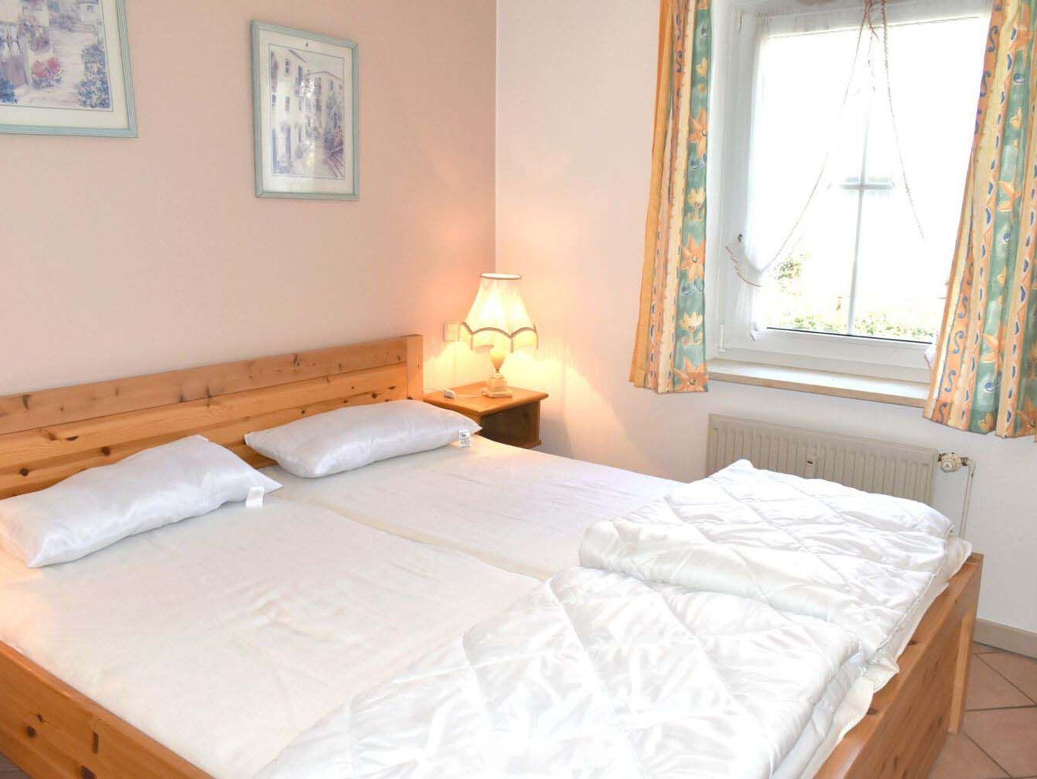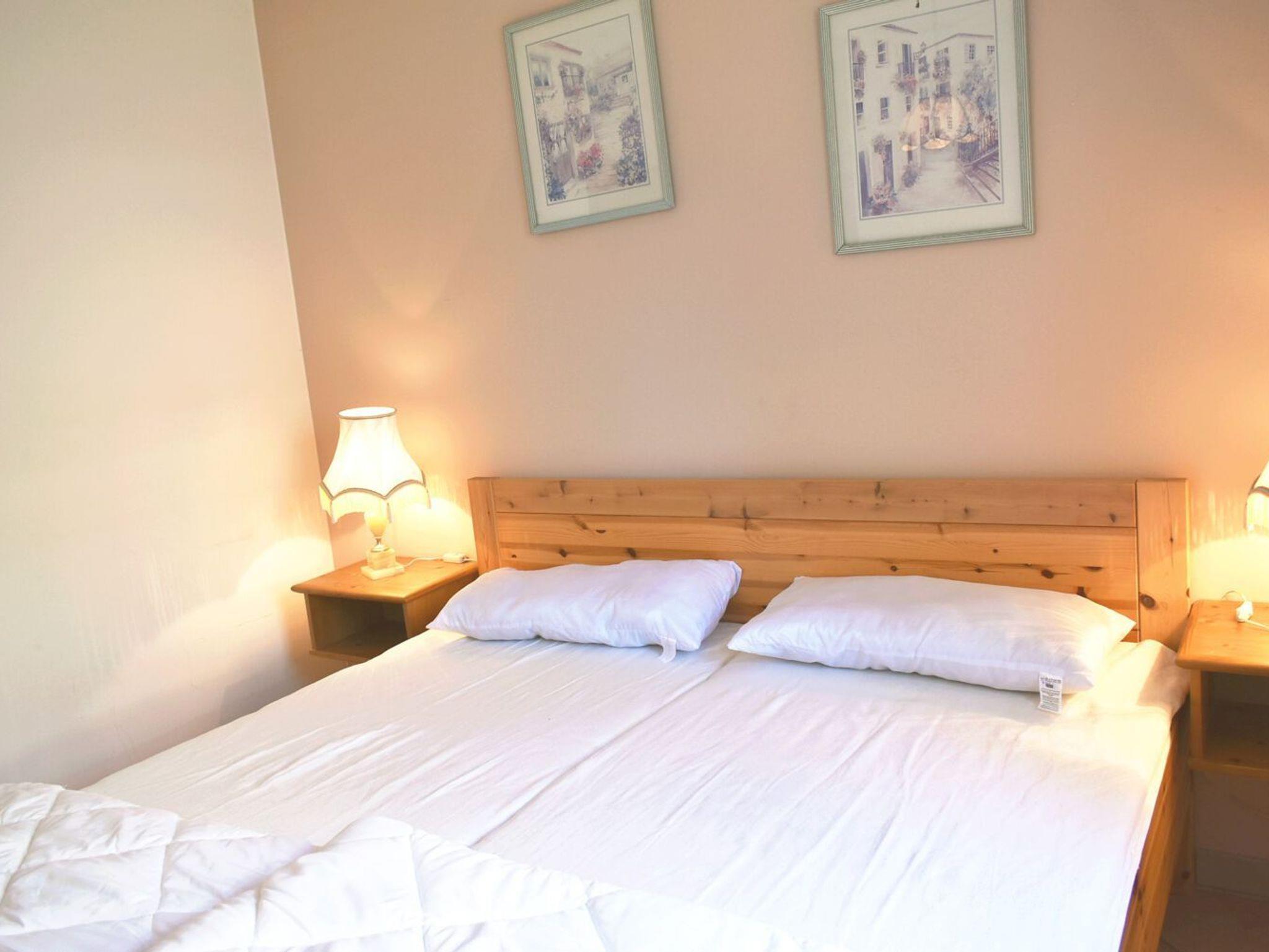 Schlafzimmer 1: 2 Ablagen, 2 Matratzen, 2 Nachttischlampen, Doppelbett, Hakenleiste, Hocker, Klappstuhl, Kleiderschrank, Spiegel, Verdunklungsrollo