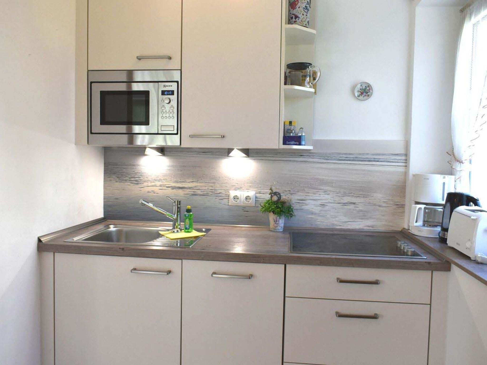 Küche: 4 Plattenherd mit Ceranfeld, Geschirr, Kaffeemaschine, Kochtöpfe, Küchenzeile, Kühlschrank, Mikrowelle, Spülmaschine, Teekanne, Toaster, Verdunklungsrollo, Wasserkocher
