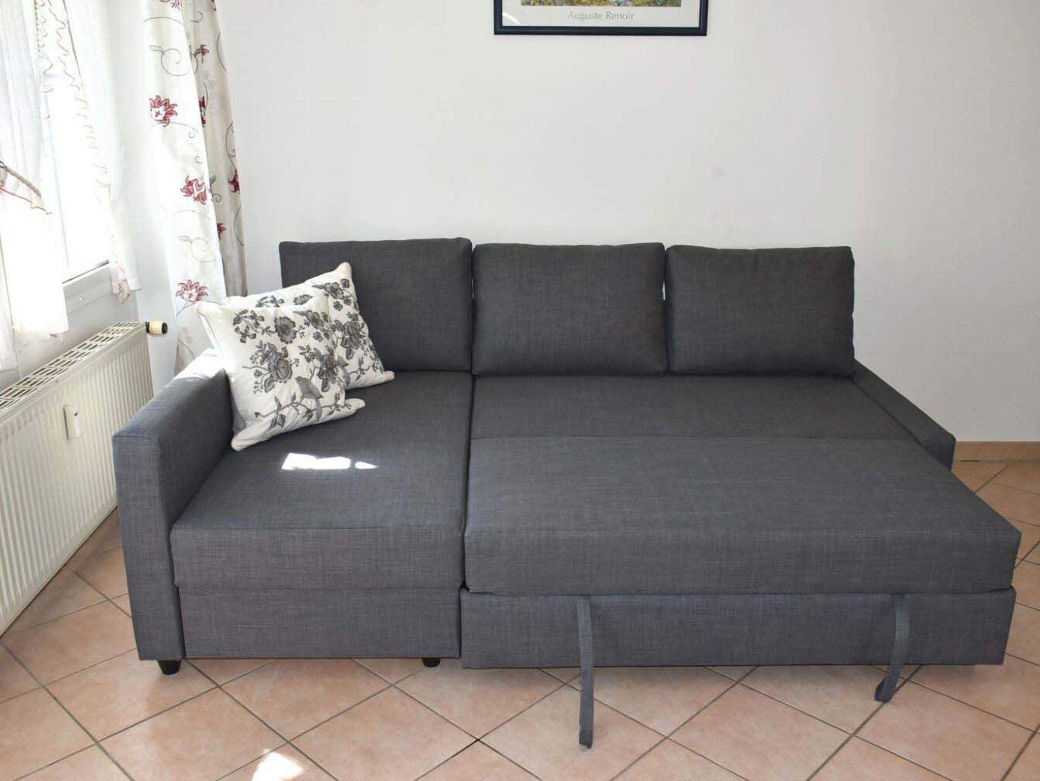 Wohnzimmer: 1 Schlafcouch 2,00 x 1,40 m, 2 Regale, 4 Stühle, Anrichte, Couchtisch, Esstisch, Kabel-TV, Kleiderschrank, Kofferradio, Staubsauger, Verdunklungsrollo