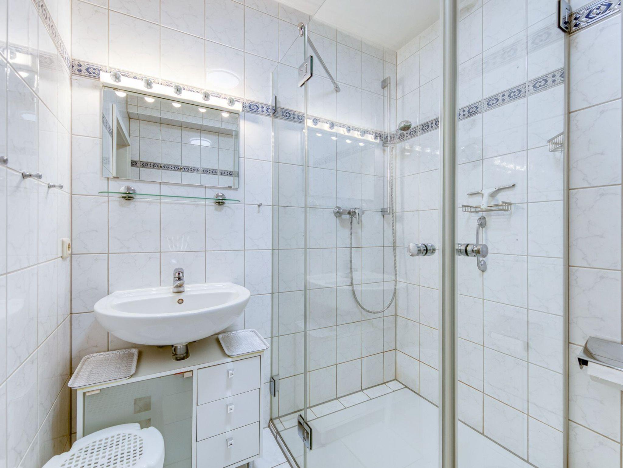 Das Badezimmer ist mit einer Dusche, einer Handtuchtrocknerheizung und einem Fön ausgestattet.