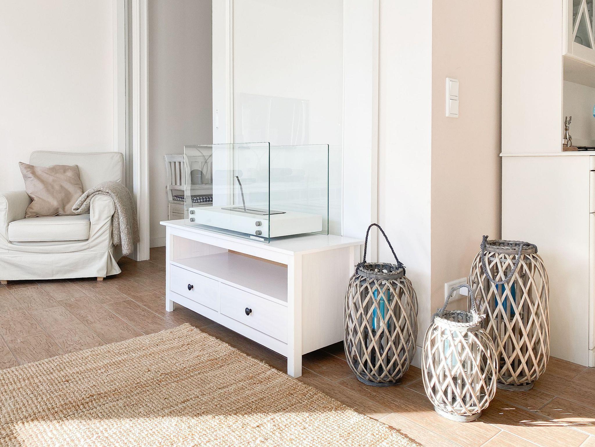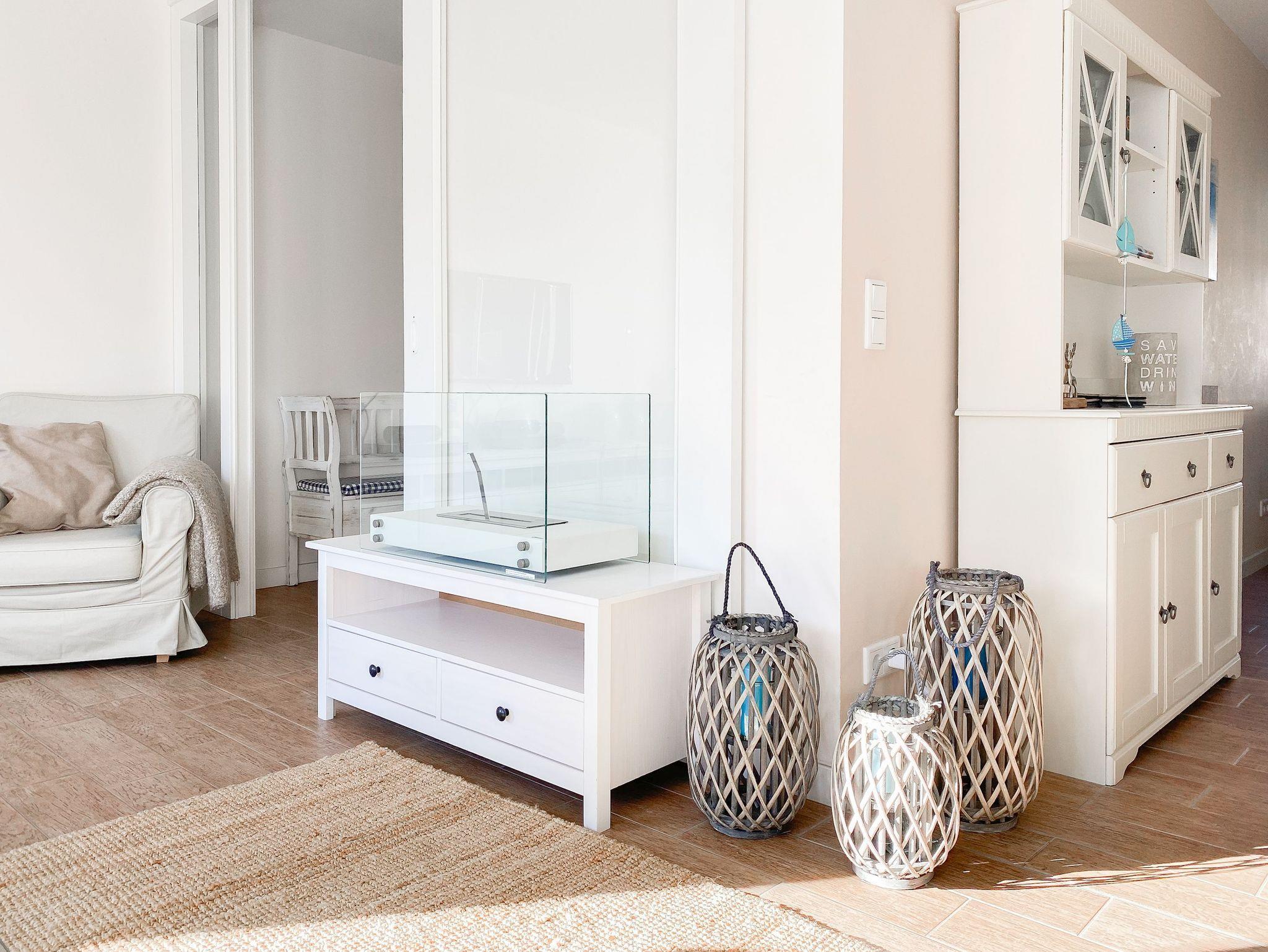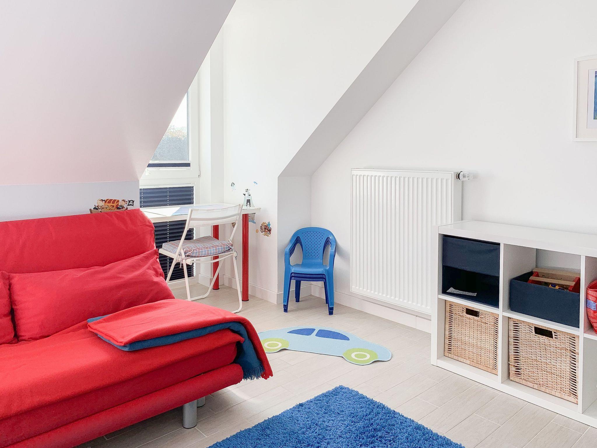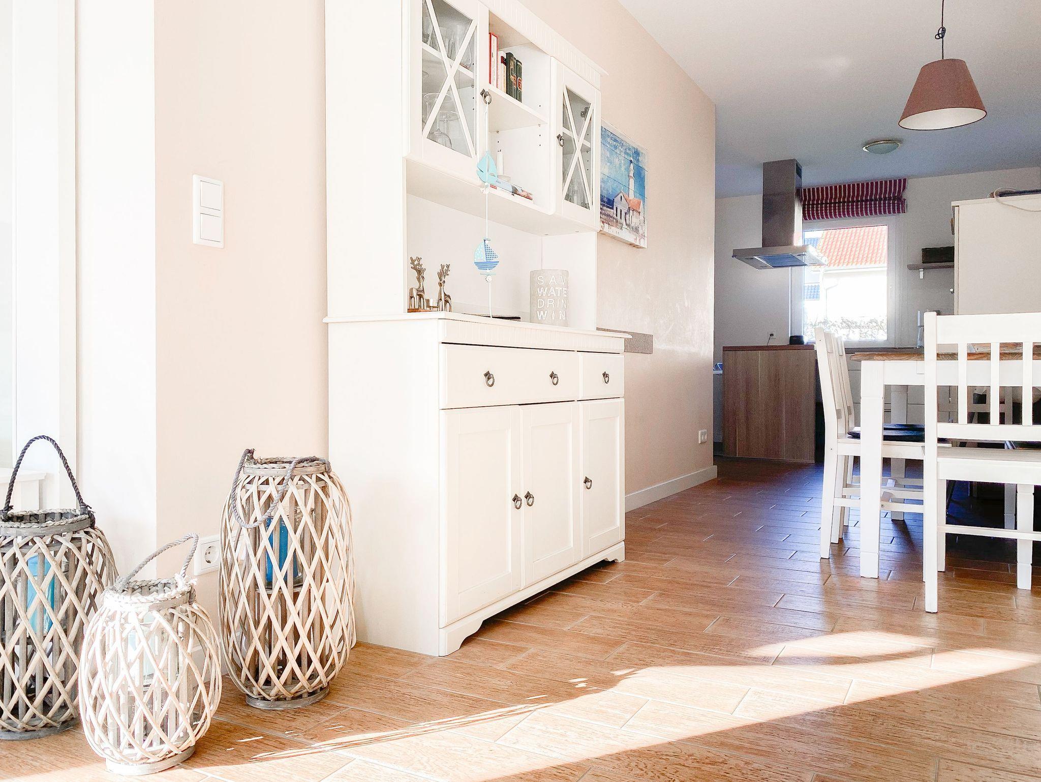 Im Erdgeschoß des Reihenhauses befindet sich der helle, freundliche Wohnraum mit 2 gemütlichen Sofas und Sesseln, die zum Lesen und Spielen einladen. Der Ethanolkamin sorgt für ein noch schöneres Ambiente, besonders in der dunklen Jahreszeit. Das Home-Entertainmentsystem umfasst LCD-TV, Kabel-TV, Radio. LTE-Internet steht Ihnen kostenlos zur Verfügung. Die offene Küche mit 2 Barhockern sowie die Essecke schließen sich an den Wohnbereich an. Induktionskochinsel, Backofen, Geschirrspüler, Kühlschrank mit Gefrierfach sowie eine umfassende Ausstattung lassen nichts vermissen. Der Flur mit Garderobe sowie das Gäste-WC und ein Abstellraum, in dem eine Waschmaschine untergebracht ist, vervollständigen das Erdgeschoss. Das 1. Obergeschoß verfügt über ein Schlafzimmer mit Doppelbett (160x200) und ein großes Kinderzimmer mit 2 Betten (80 x 200 cm) sowie Sofa und großem Spielbereich. Das geräumige Badezimmer ist mit einer Badewanne und Dusche ausgestattet. Im 2. Obergeschoß befindet sich ein Studio, das als Rückzugsort zum Lesen und Arbeiten sowie als weiteres Schlafzimmer, mit Boxspringbett (180x200), genutzt werden kann. Außerdem ist das Studio mit einem Schreibtisch und einem weiteren TV ausgestattet.