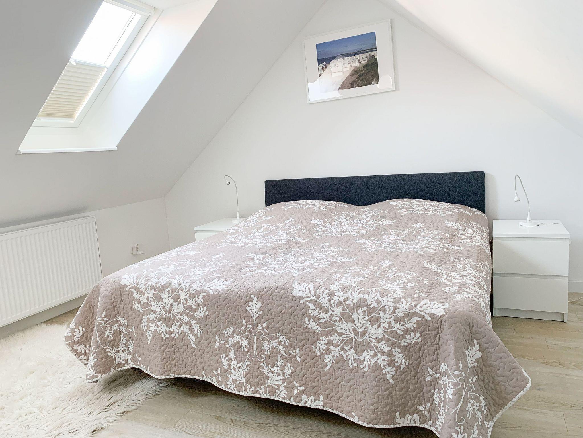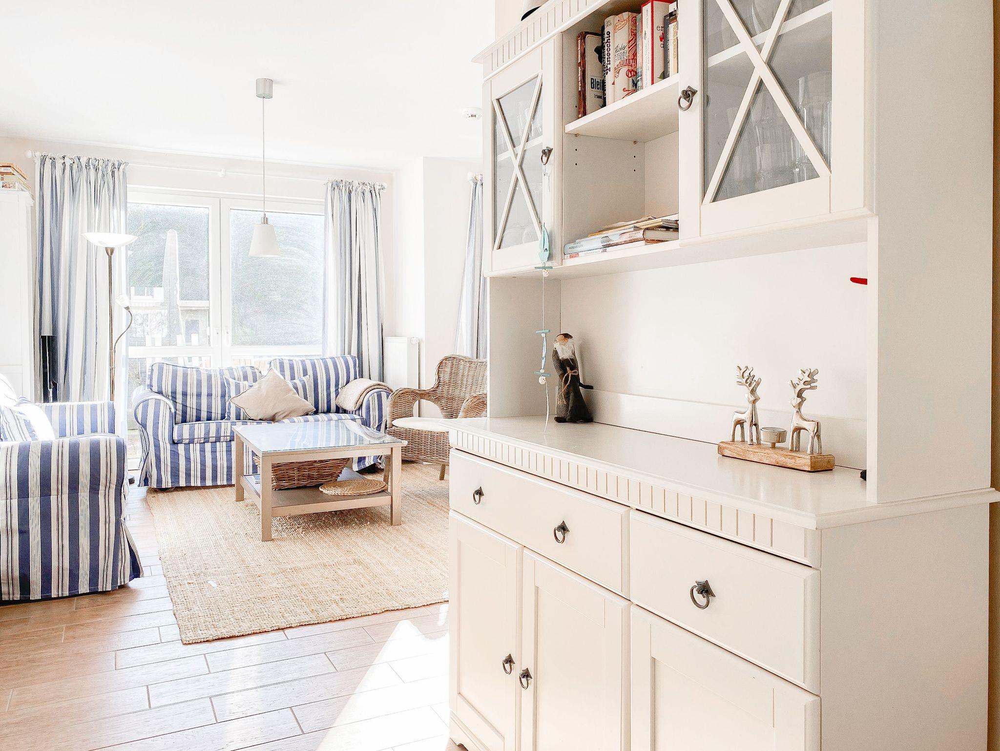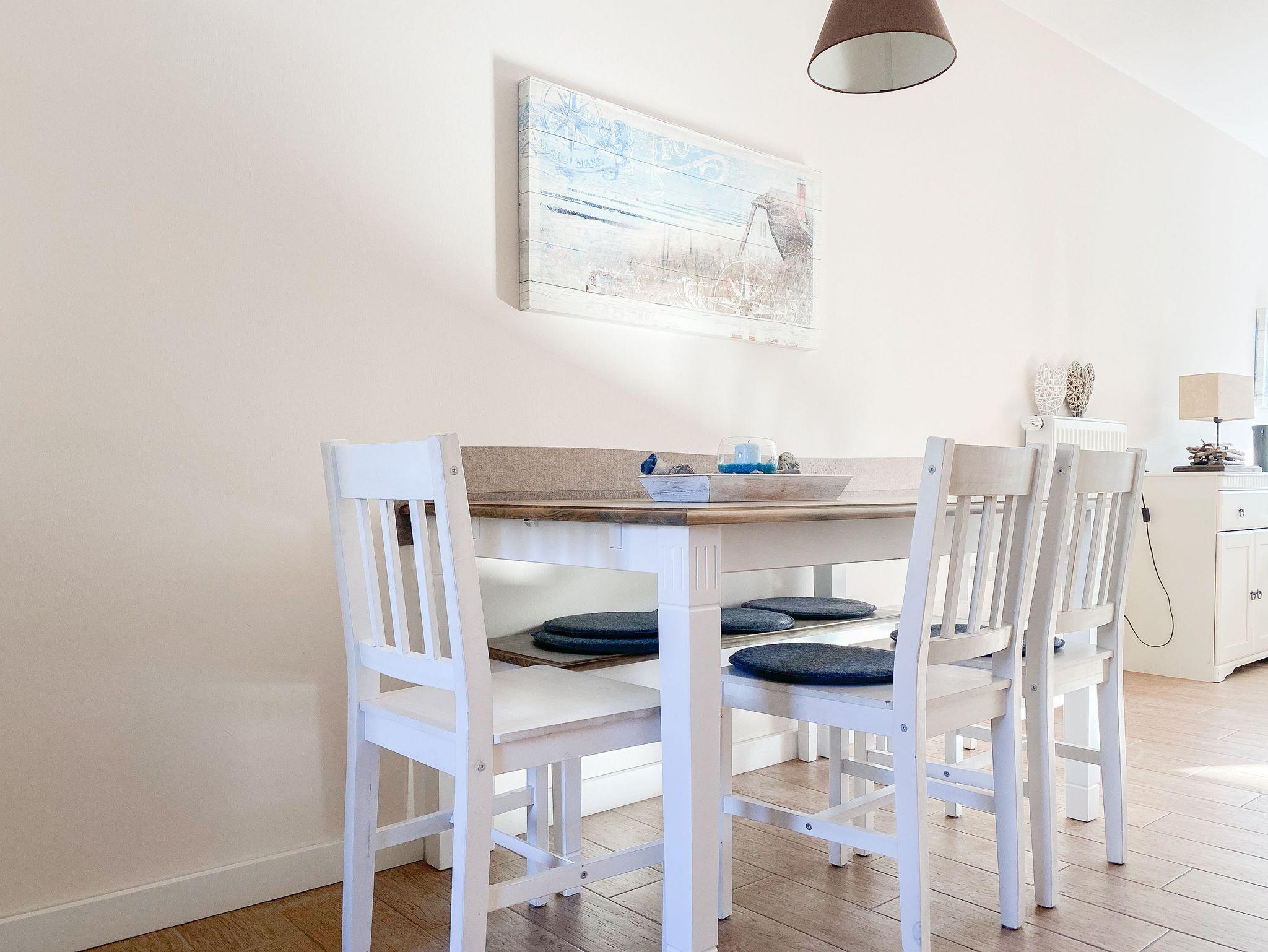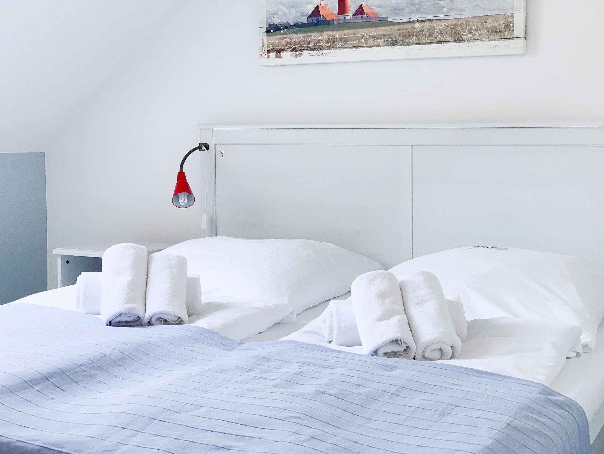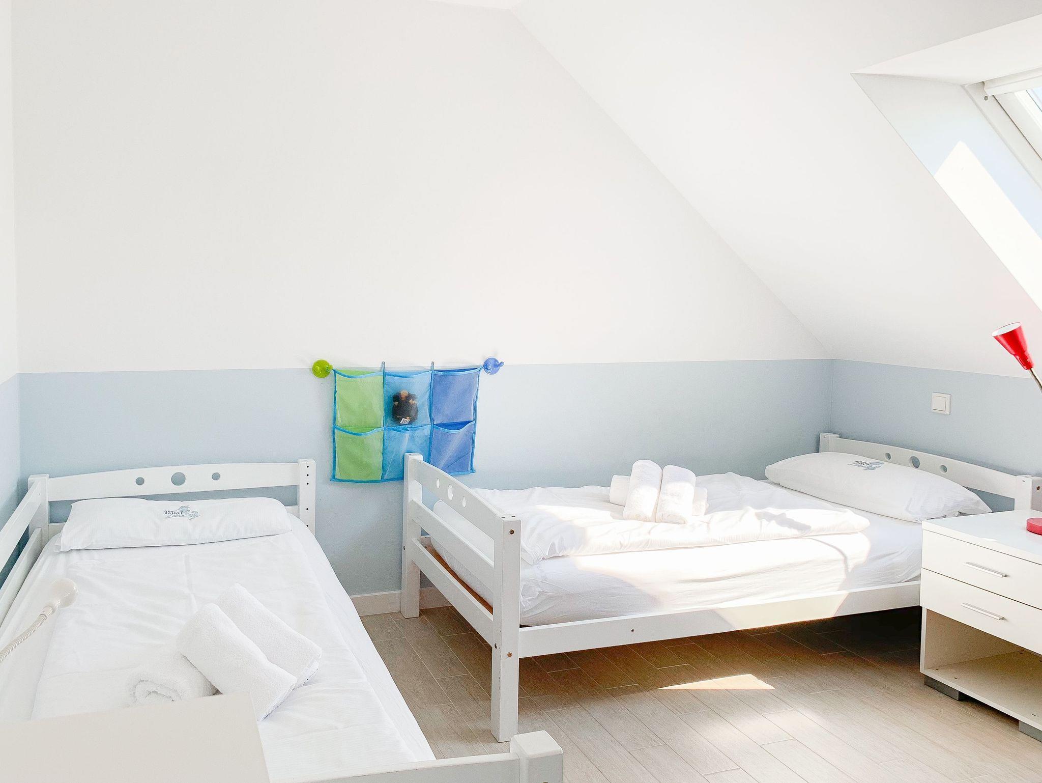 Im Erdgeschoß des Reihenhauses befindet sich der helle, freundliche Wohnraum mit 2 gemütlichen Sofas und Sesseln, die zum Lesen und Spielen einladen. Der Ethanolkamin sorgt für ein noch schöneres Ambiente, besonders in der dunklen Jahreszeit. Das Home-Entertainmentsystem umfasst LCD-TV, Kabel-TV, Radio. LTE-Internet steht Ihnen kostenlos zur Verfügung. Die offene Küche mit 2 Barhockern sowie die Essecke schließen sich an den Wohnbereich an. Induktionskochinsel, Backofen, Geschirrspüler, Kühlschrank mit Gefrierfach sowie eine umfassende Ausstattung lassen nichts vermissen. Der Flur mit Garderobe sowie das Gäste-WC und ein Abstellraum, in dem eine Waschmaschine untergebracht ist, vervollständigen das Erdgeschoss. Das 1. Obergeschoß verfügt über ein Schlafzimmer mit Doppelbett (160x200) und ein großes Kinderzimmer mit 2 Betten (80 x 200 cm) sowie Sofa und großem Spielbereich. Das geräumige Badezimmer ist mit einer Badewanne und Dusche ausgestattet. Im 2. Obergeschoß befindet sich ein Studio, das als Rückzugsort zum Lesen und Arbeiten sowie als weiteres Schlafzimmer, mit Boxspringbett (180x200), genutzt werden kann. Außerdem ist das Studio mit einem Schreibtisch und einem weiteren TV ausgestattet.