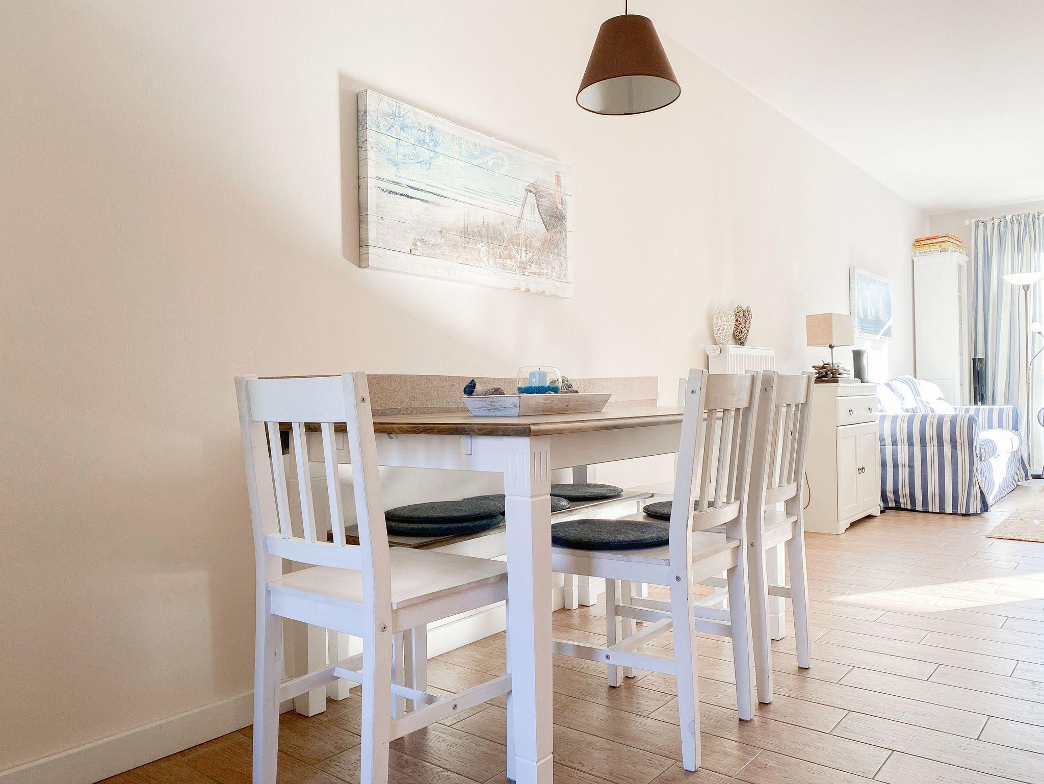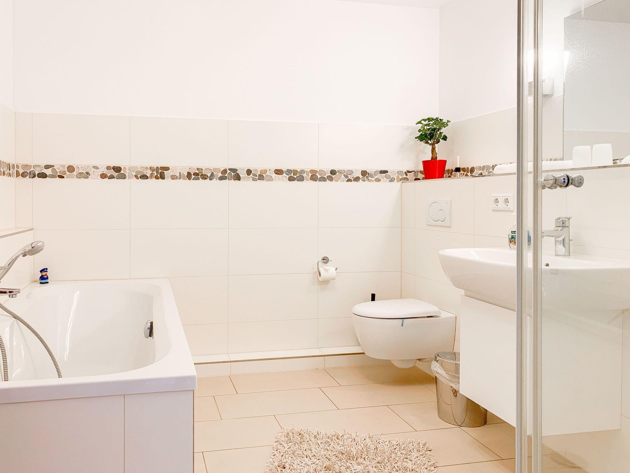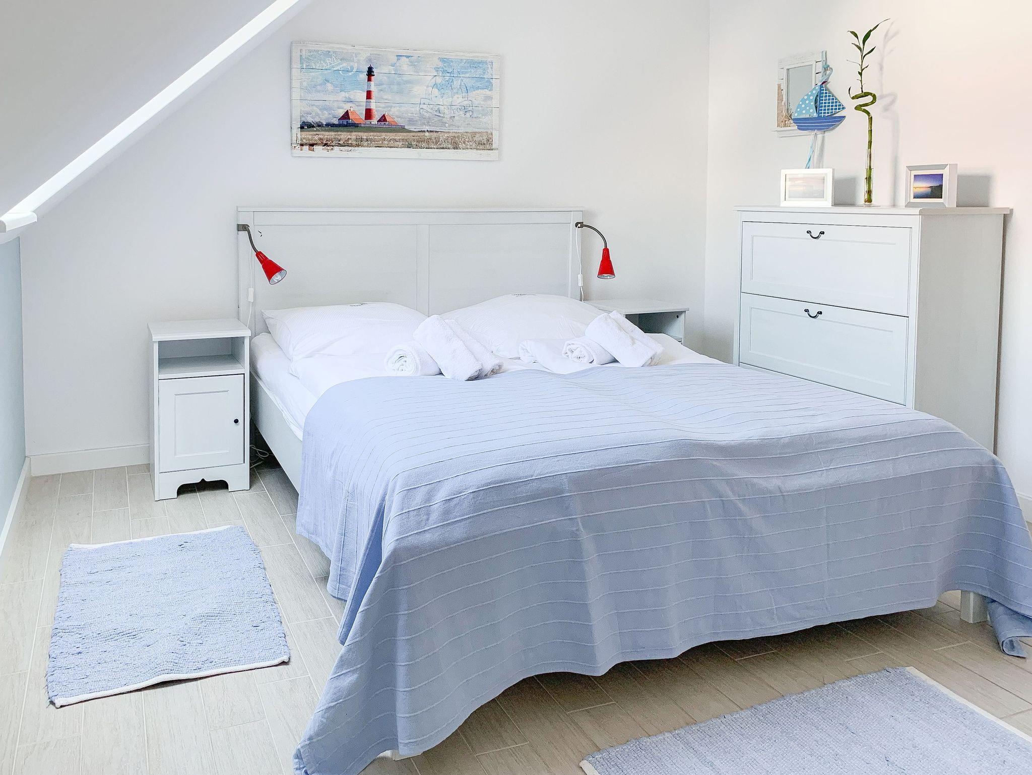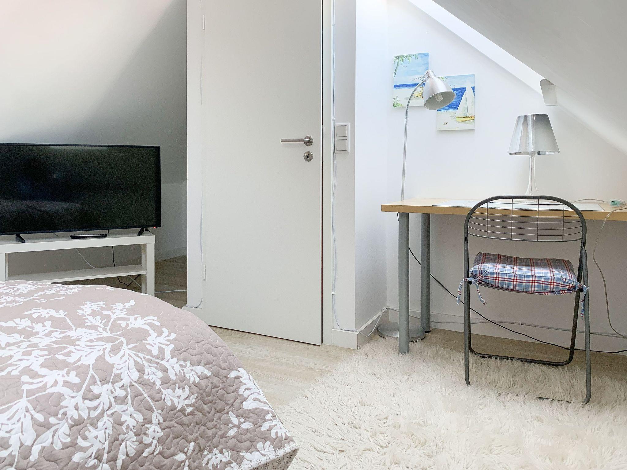 Im Erdgeschoß des Reihenhauses befindet sich der helle, freundliche Wohnraum mit 2 gemütlichen Sofas und Sesseln, die zum Lesen und Spielen einladen. Der Ethanolkamin sorgt für ein noch schöneres Ambiente, besonders in der dunklen Jahreszeit. Das Home-Entertainmentsystem umfasst LCD-TV, Kabel-TV, Radio. LTE-Internet steht Ihnen kostenlos zur Verfügung. Die offene Küche mit 2 Barhockern sowie die Essecke schließen sich an den Wohnbereich an. Induktionskochinsel, Backofen, Geschirrspüler, Kühlschrank mit Gefrierfach sowie eine umfassende Ausstattung lassen nichts vermissen. Der Flur mit Garderobe sowie das Gäste-WC und ein Abstellraum, in dem eine Waschmaschine untergebracht ist, vervollständigen das Erdgeschoss. Das 1. Obergeschoß verfügt über ein Schlafzimmer mit Doppelbett (160x200) und ein großes Kinderzimmer mit 2 Betten (80 x 200 cm) sowie Sofa und großem Spielbereich. Das geräumige Badezimmer ist mit einer Badewanne und Dusche ausgestattet. Im 2. Obergeschoß befindet sich ein Studio, das als Rückzugsort zum Lesen und Arbeiten sowie als weiteres Schlafzimmer, mit Boxspringbett (180x200), genutzt werden kann. Außerdem ist das Studio mit einem Schreibtisch und einem weiteren TV ausgestattet.
