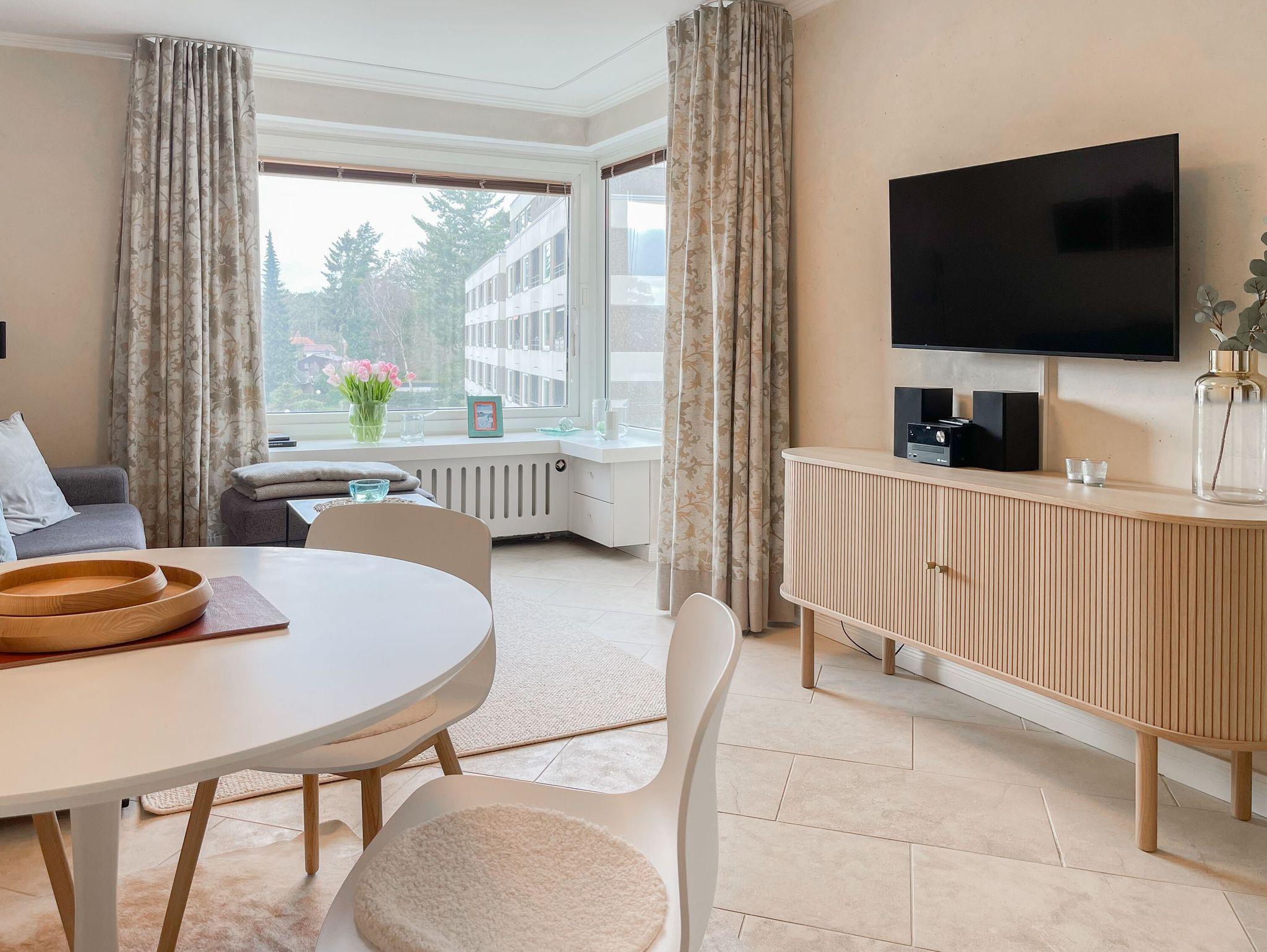 Schöne Ferienwohnung mit Teilmeerblick aus dem Wohnzimmer und vom Balkon, wo man die Ostsee durch die Bäume blitzen sehen kann. Die Ferienwohnung Heimathafen befindet sich in hervorragender Lage, keine 100 Meter vom Ostseestrand und der Promenade entfernt und ganz nah am urigen Niendorfer Hafen mit seinem lebhaftem Treiben und den leckersten Fischbrötchen weit und breit. In direkter Nachbarschaft gibt es alles was das Urlauberherz begehrt, ob Restaurants oder Cafés, Kiosk oder Kaffeerösterei, Fahrradverleih oder Abenteuerspielplatz, Schiffsrundfahrten oder Sommerkino am Freistrand. Frische Brötchen zum Frühstück gibt es beim Bäcker um die Ecke und die legendäre Strandbude 8 liegt fast vor der Tür.