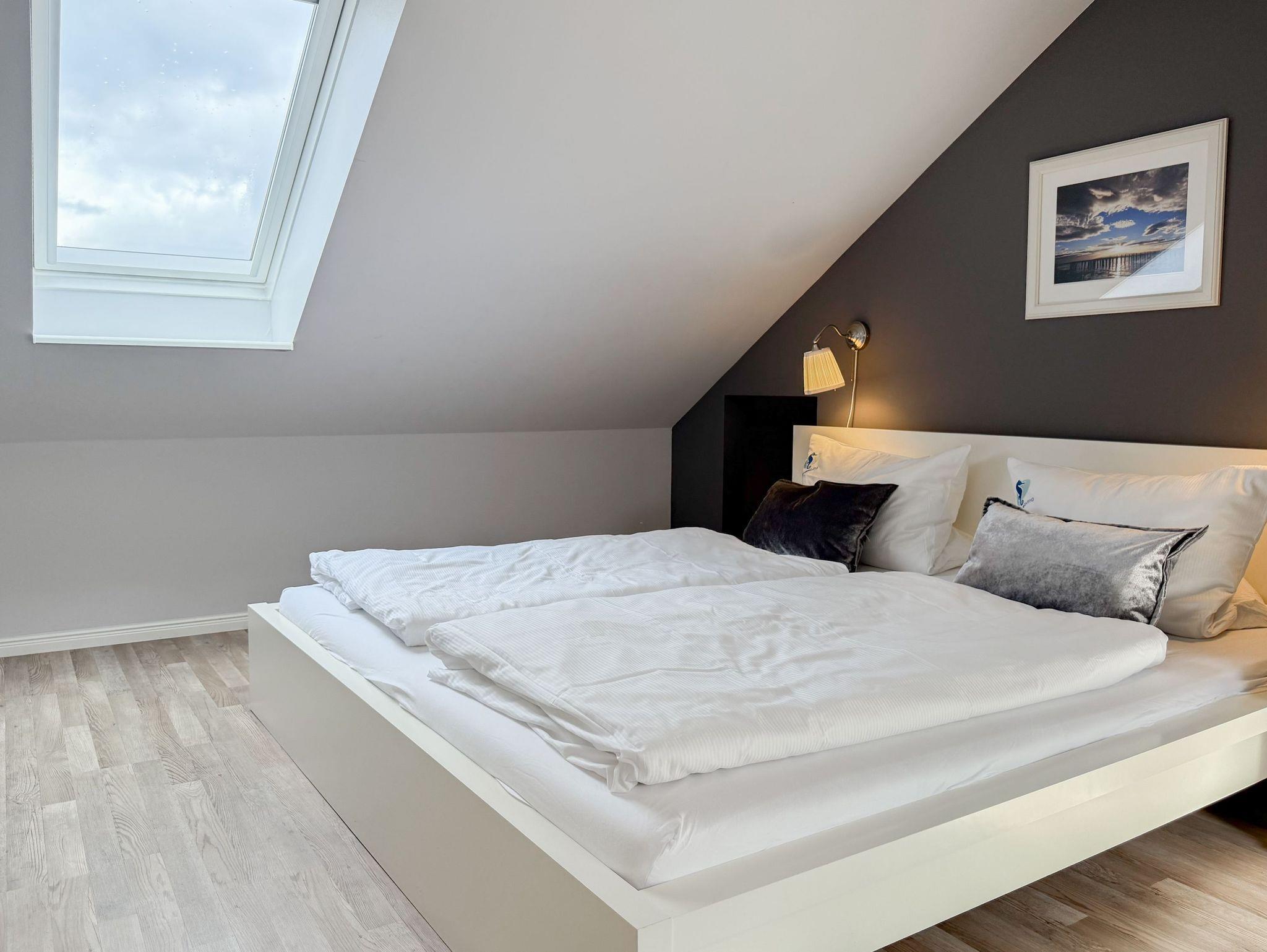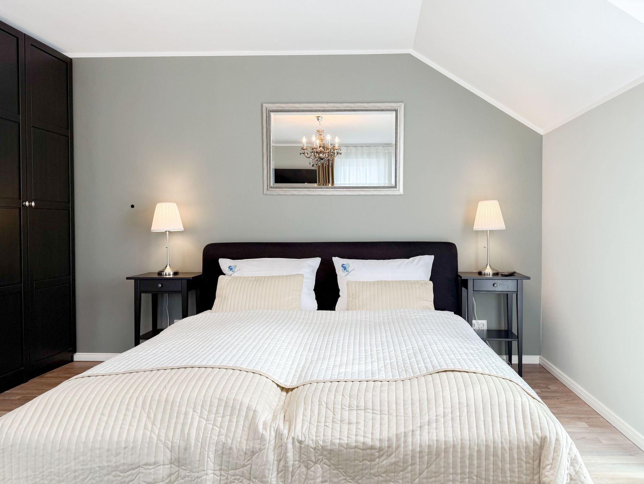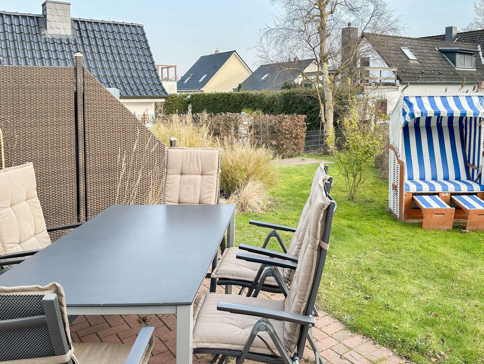 Es erwartet Sie ein tolles Doppelhaus mit 3 separaten Schlafzimmern und 2 Duschbädern. Sonnige Räumlichkeiten auf über 100 qm Wohnfläche und die geschmackvolle Einrichtung mit liebevollen Details schaffen ein behagliches Ambiente für 6 Personen. Im Erdgeschoss erwartet Sie ein großzügiger Wohnbereich, der mit einem gemütlichen Ecksofa und TV eingerichtet ist. Die vorgelagerte Sonnenterrasse in Südausrichtung garantiert erholsame Urlaubszeit. Die großzügige Einbauküche ist bestens ausgestattet und lädt zum gemeinsamen Kochen ein. Der anschließende Essbereich, mit großem Esstisch und gemütlichen Sesseln, bietet ausreichend Platz für gemeinsame Mahlzeiten und geselliges Beisammensein. Im Eingangsbereich befindet sich eine Garderobe und ein neuwertiges Tageslichtbad mit Dusche, Waschbecken und WC. Eine Waschmaschine ist im separaten Abstellraum untergebracht, ebenfalls im Erdgeschoss. Im Obergeschoss befindet sich ein weiteres Duschbad mit Doppelwaschtisch und Fenster sowie 2 separate Schlafzimmer. Schlafzimmer 1 ist äußerst großzügig und mit einem Doppelbett, einer Sitzecke mit TV und einem Schreibtisch für das Home Office eingerichtet. Schlafzimmer 2 verfügt über 2 Einzelbetten und einen gemütlichen Relaxsessel. Im Dachgeschoss befindet sich das 3. Schlafzimmer mit einem Doppelbett (180x200), Kleiderschrank und Sessel. Die Dachflächenfenster lassen sich über ein Rollo verdunkeln, alle anderen Fenster des Hauses sind mit elektrischen Außenjalousien versehen. WLAN steht selbstverständlich kostenlos zur Verfügung. Vor dem Haus befinden sich zwei Parkplätze. (1 Carport und 1 Außenstellplatz). Fahrräder können sicher und trocken im Schuppen am Haus untergestellt werden. [nbsp]