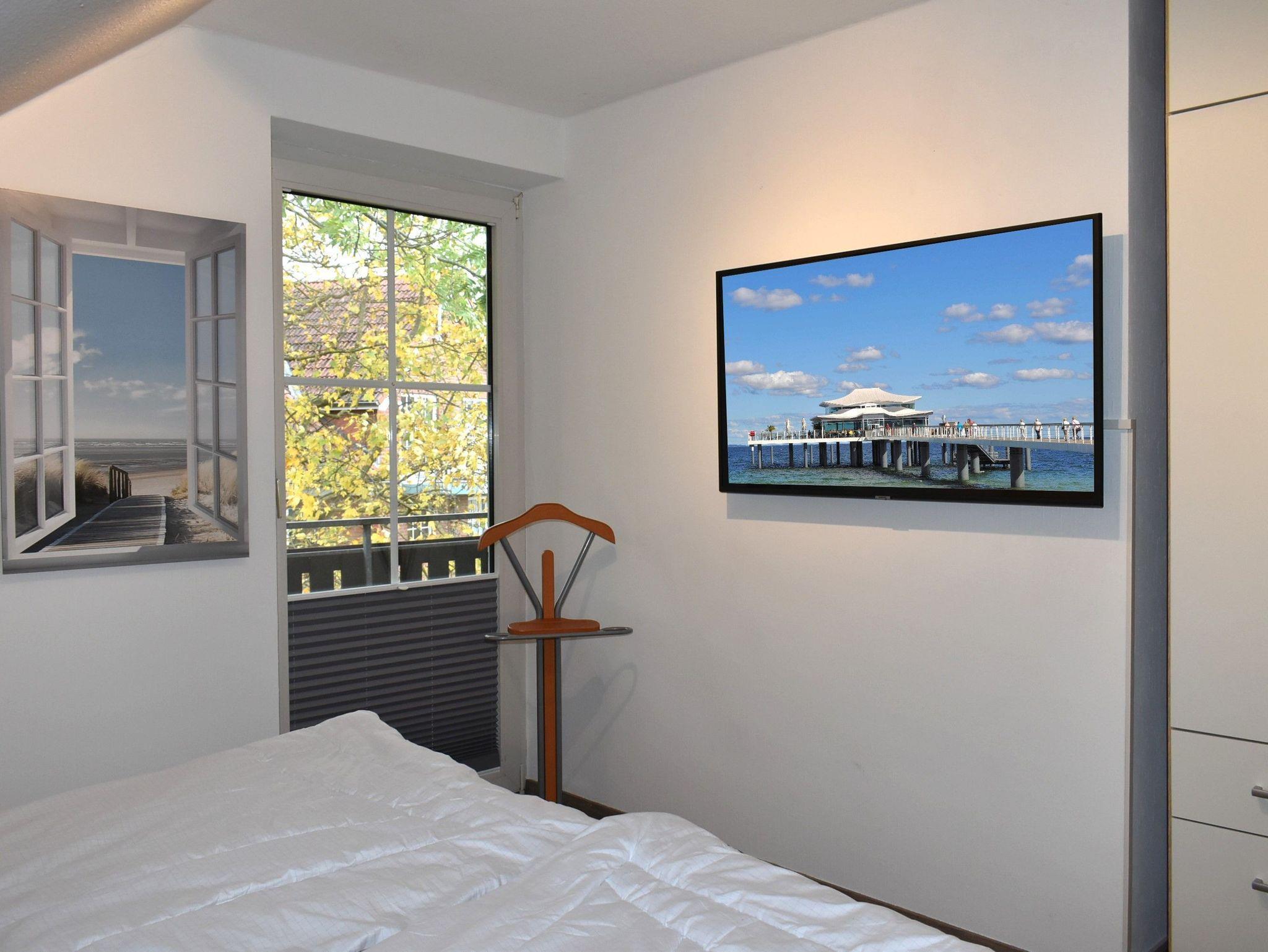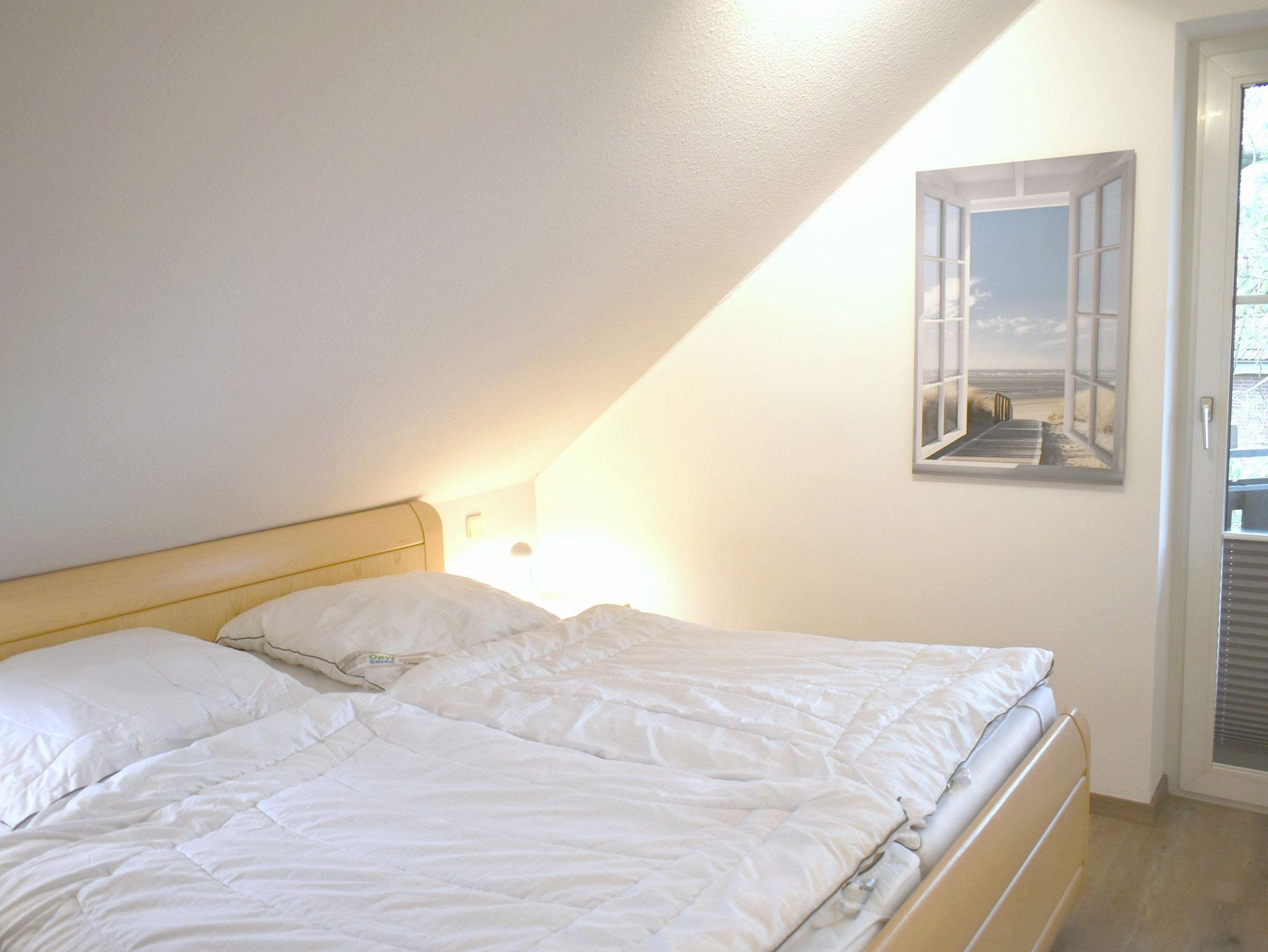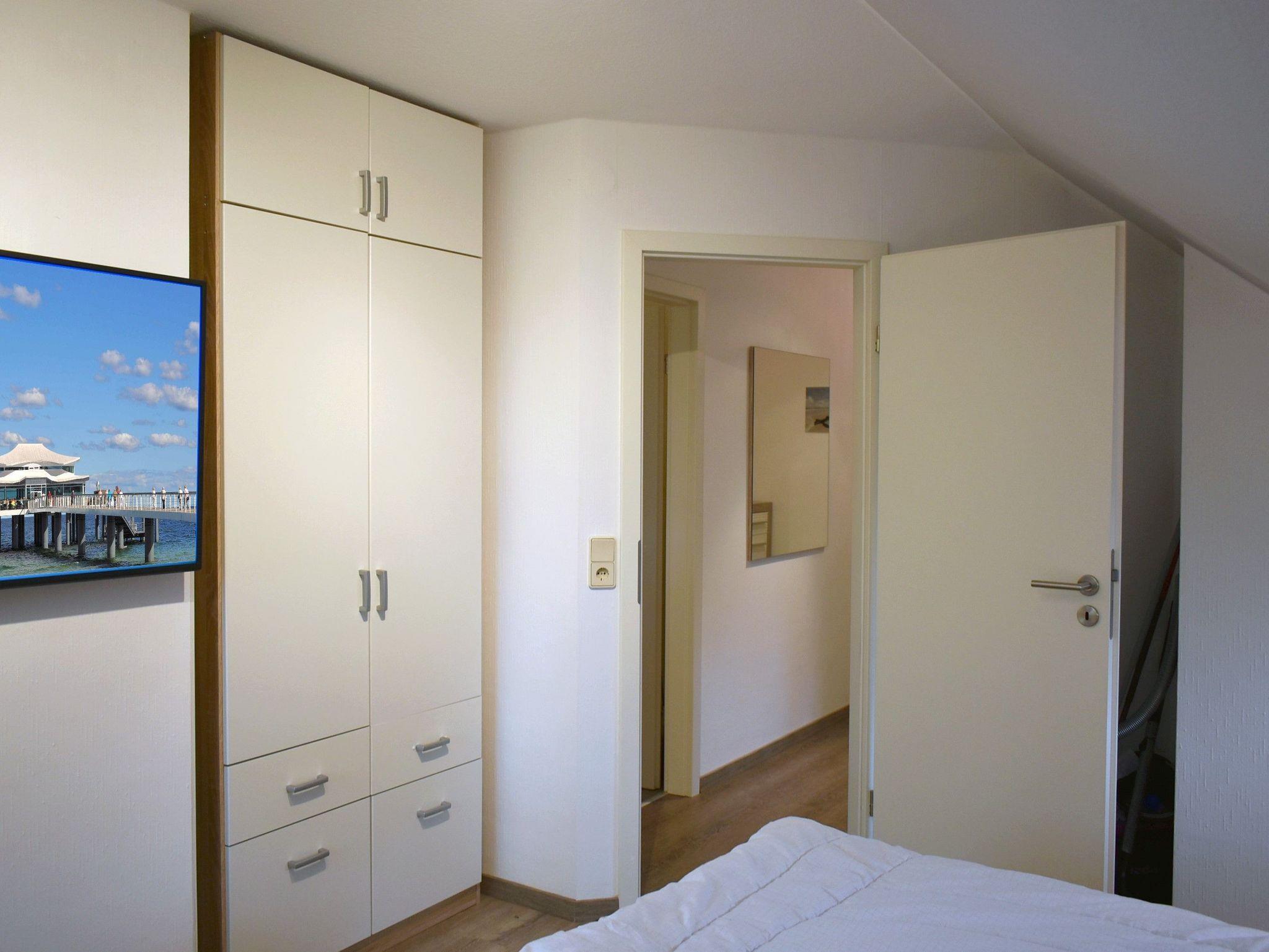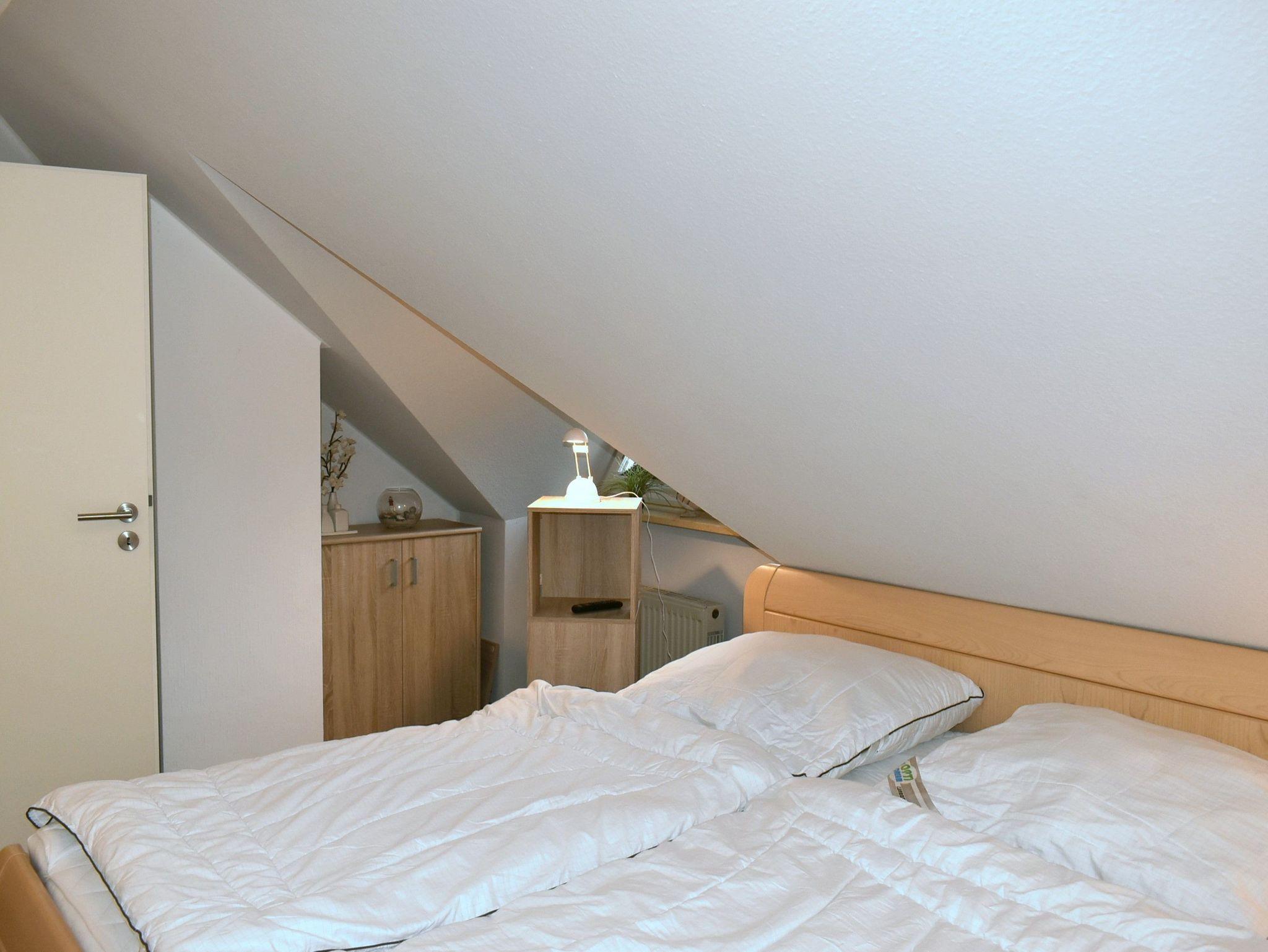 Schlafzimmer 1: 2 Matratzen, 2 Nachttische, 2 Nachttischlampen, Besen, Doppelbett 2,00 x 1,80 m, Flachbildschirm, Kabel-TV, Kleiderschrank, Kommode, Staubsauger, Stummerdiener, Verdunklungsplissee, Wischer mit Eimer