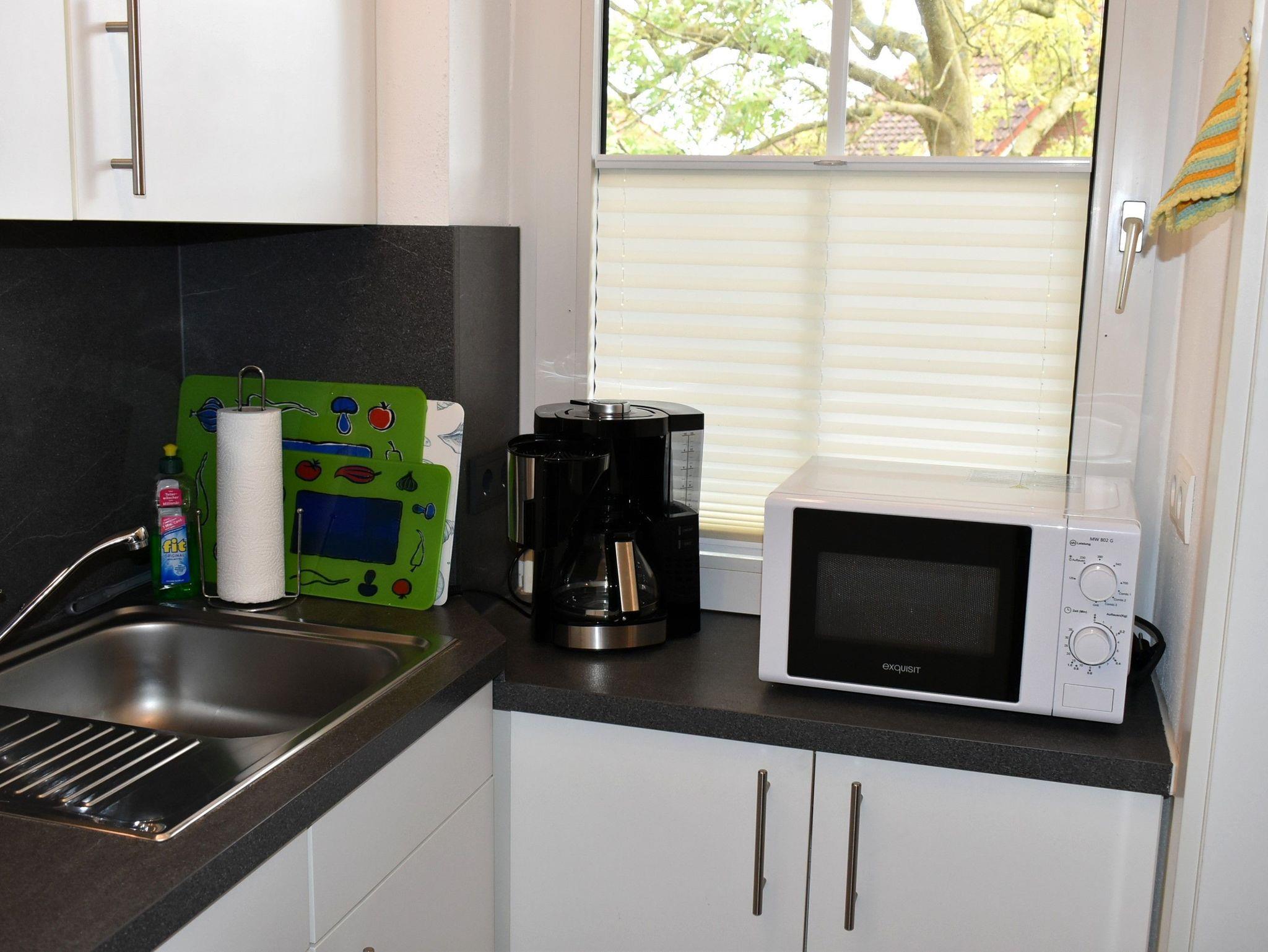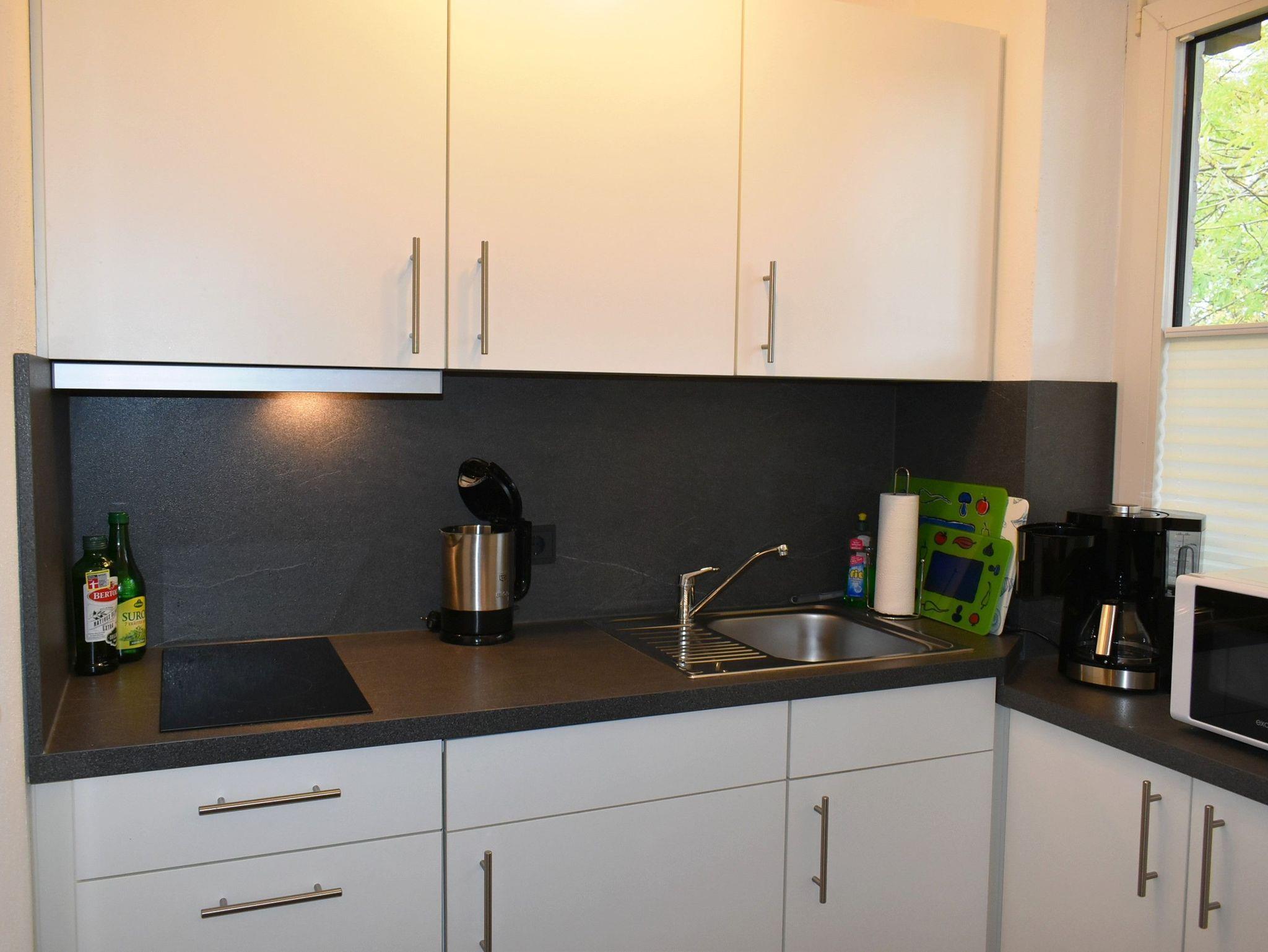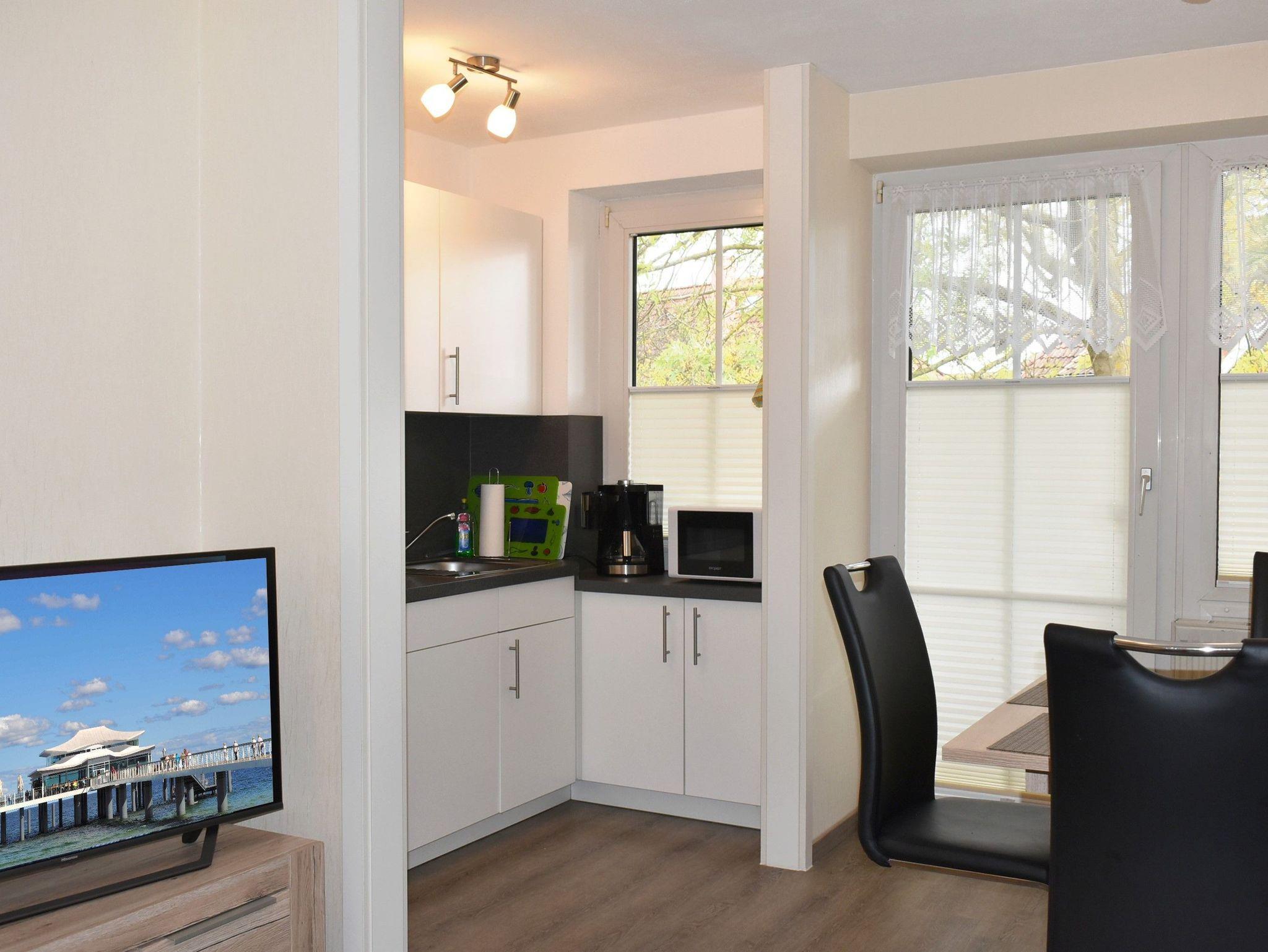 Wohnzimmer: 2 Plattenherd mit Ceranfeld, 5 Stühle, Couchtisch, Dunstabzugshaube, Eckschlafcouch, Esstisch, Flachbildschirm, Geschirr, Kabel-TV, Kaffeemaschine, Kochtöpfe, Kommode, Küchenzeile, Kühlschrank, Mikrowelle, Stereoanlage mit CD-Player, Toaster, TV-Unterschrank, Wasserkocher