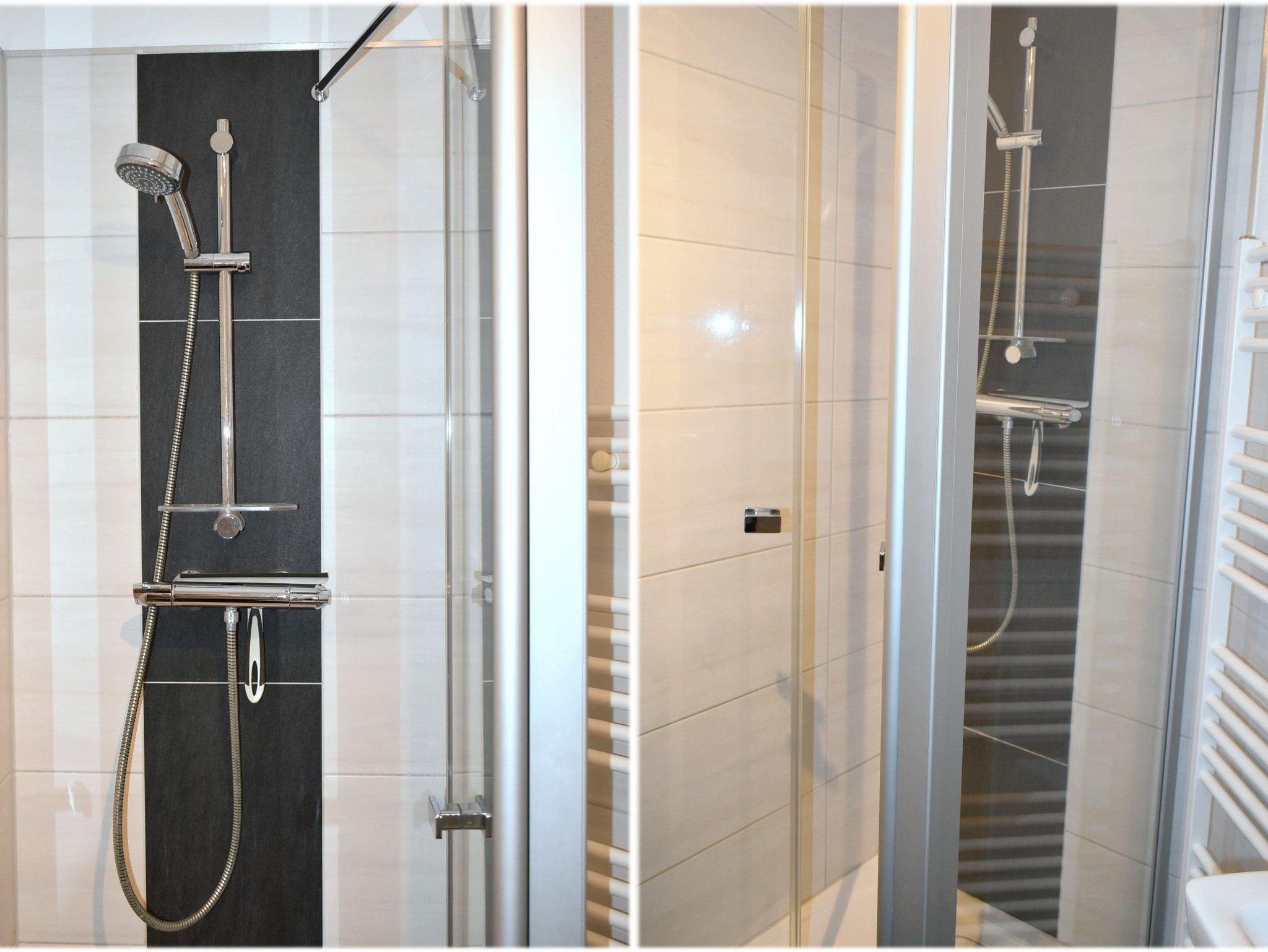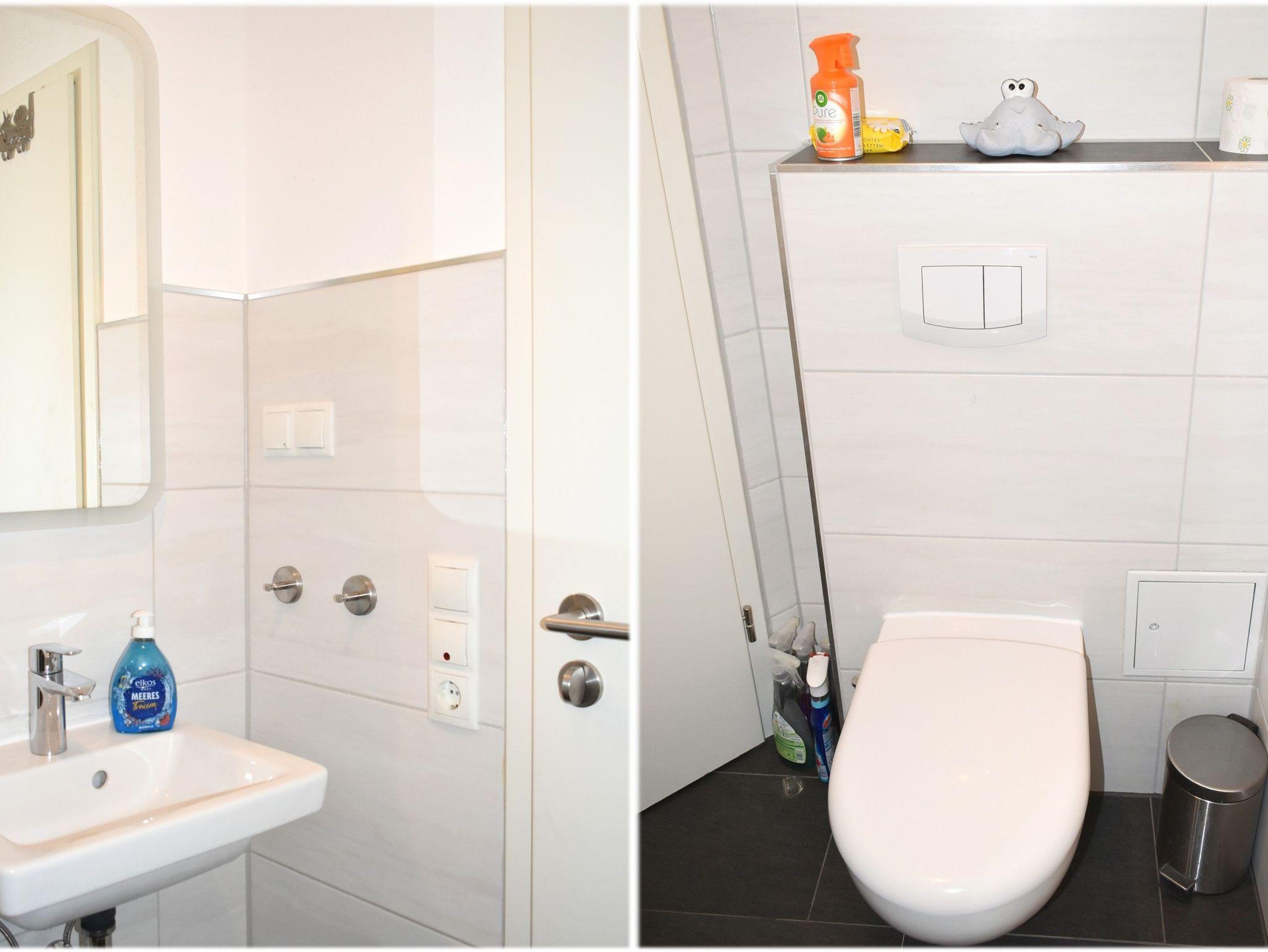 Bad 1: Dusche, Fön, Handtuchheizung, Spiegel, Waschbecken, WC