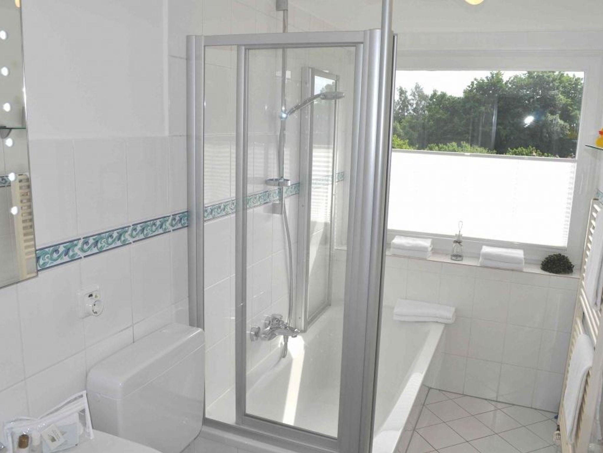 Bad 1: 1 Sichtschutzplissee, Badewanne, Duschkabine, Handtuchheizung, Spiegel mit LED-Beleuchtung und Digital-Uhr, Waschbecken, Wäscheständer, WC