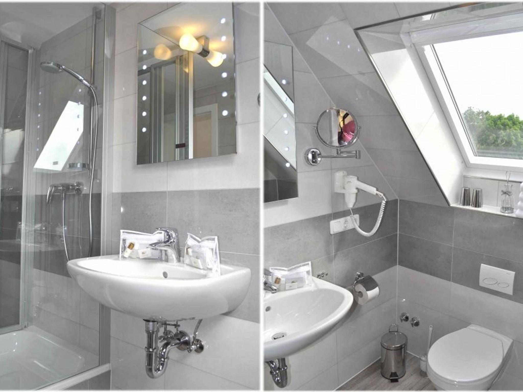 Bad 2: Dusche, Duschkabine, Fön, Handtuchheizung, Kosmetikspiegel, Spiegel mit LED-Beleuchtung und Digital-Uhr, Waschbecken, WC