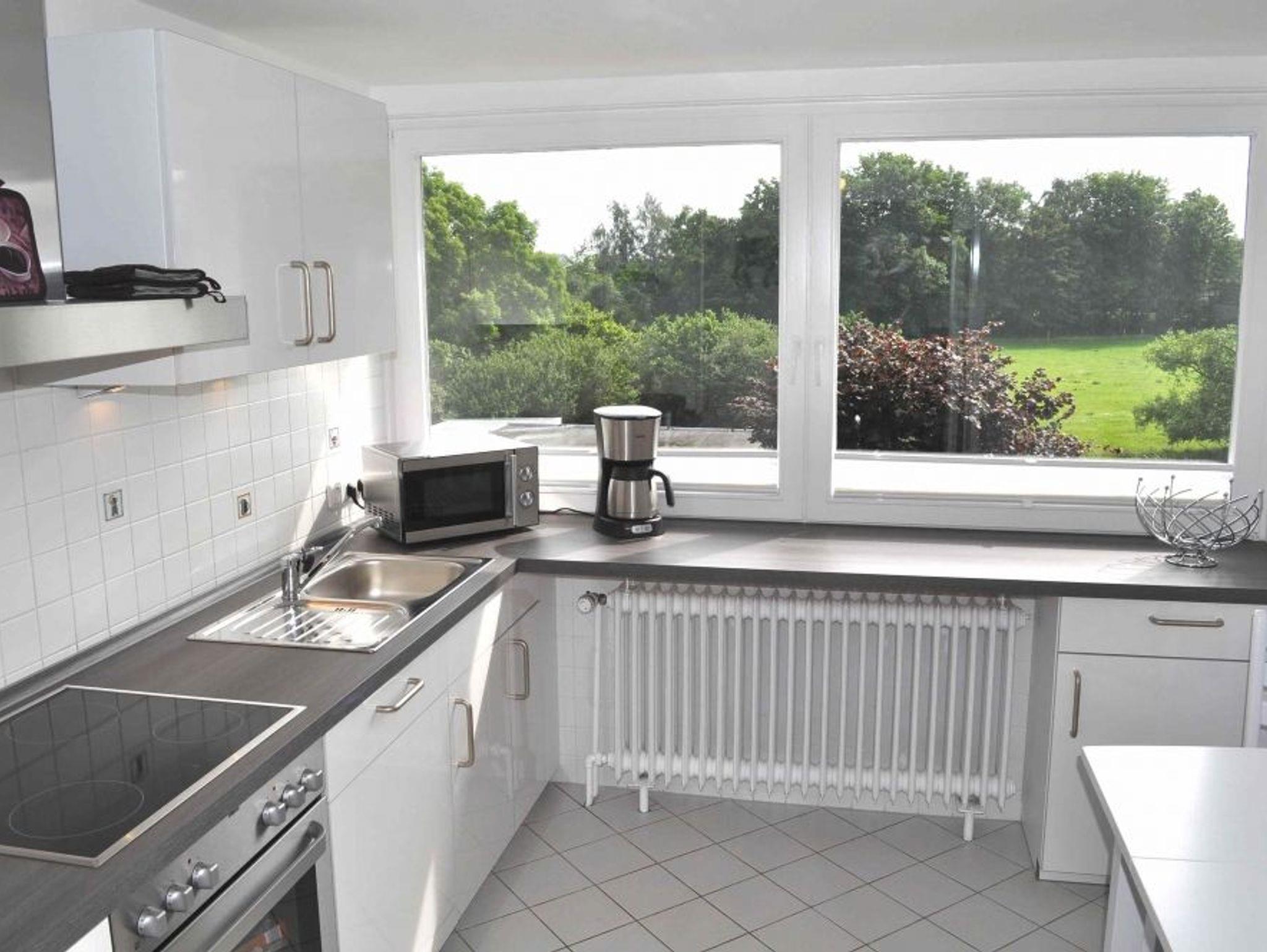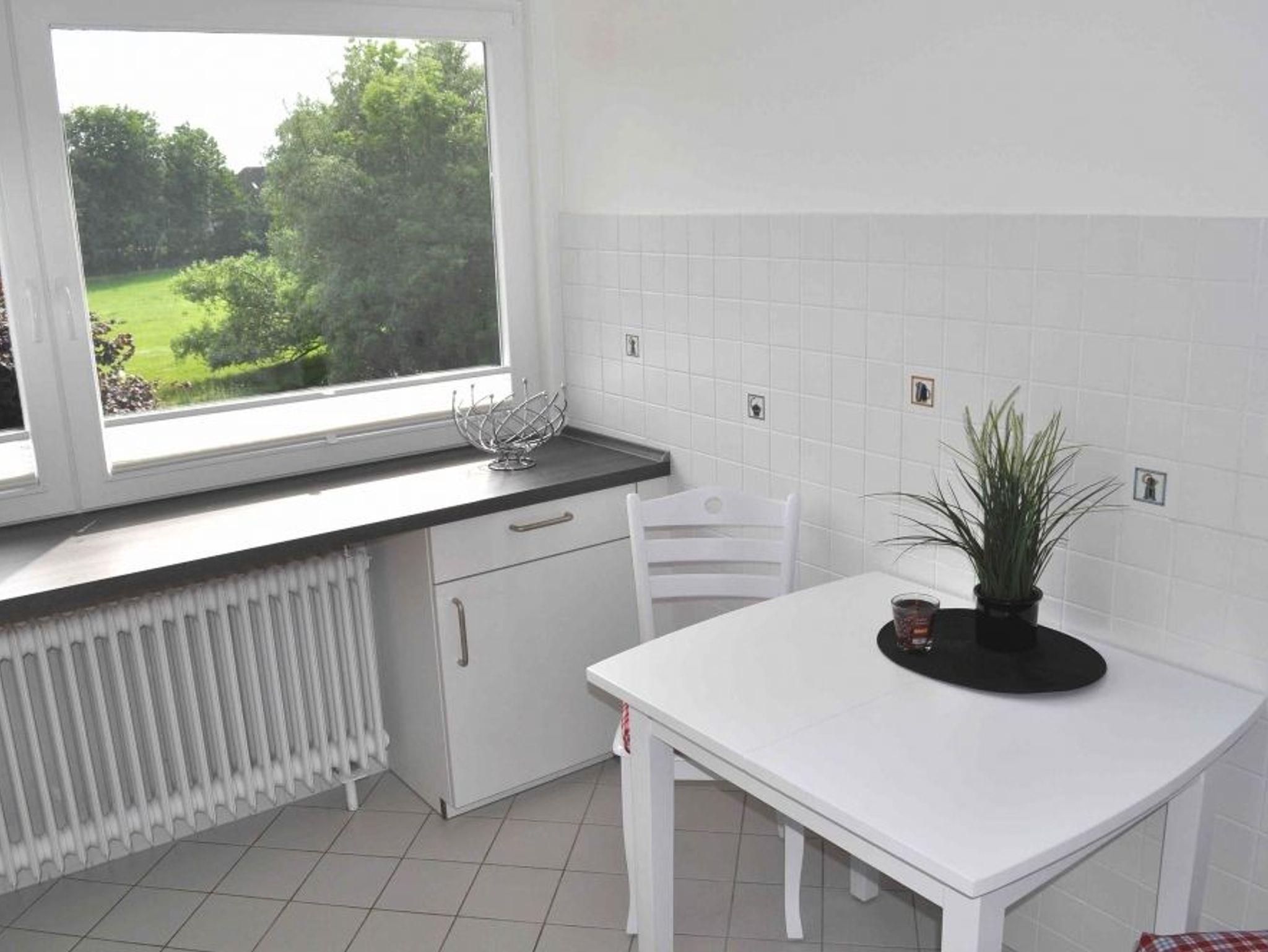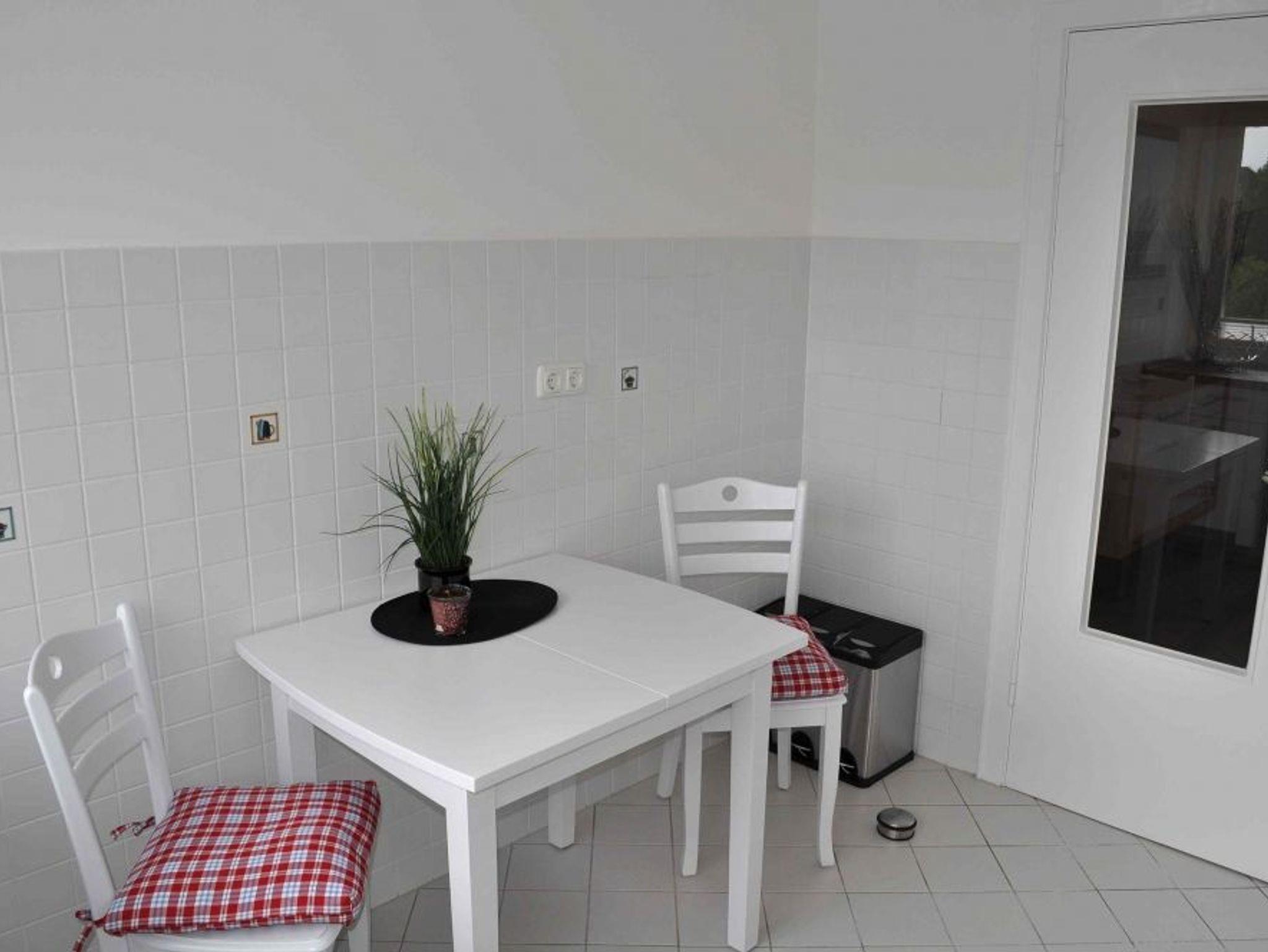 Küche: 2 Stühle, 4 Plattenherd mit Ceranfeld und Backofen, Dunstabzugshaube, Eierkocher, Einbauküche, Esstisch, Geschirr, Handmixer, Kaffeemaschine, Kochtöpfe, Kühlschrank mit Gefrierfach, Mikrowelle, Nespresso Maschine, Spülmaschine, Toaster, Wasserkocher