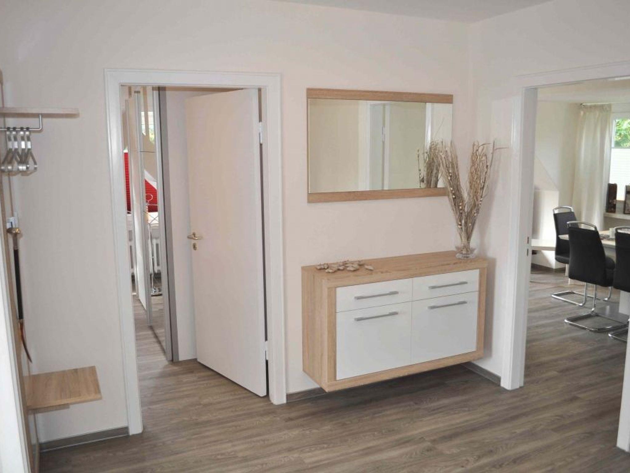 Flur 2: Treppe nach unten, Verdunklungsplissee, Garderobe, Golfschuhanzieher, Handfeger und Schaufel, Schuhsideboard, Spiegel, Staubsauger, Wischer mit Eimer
