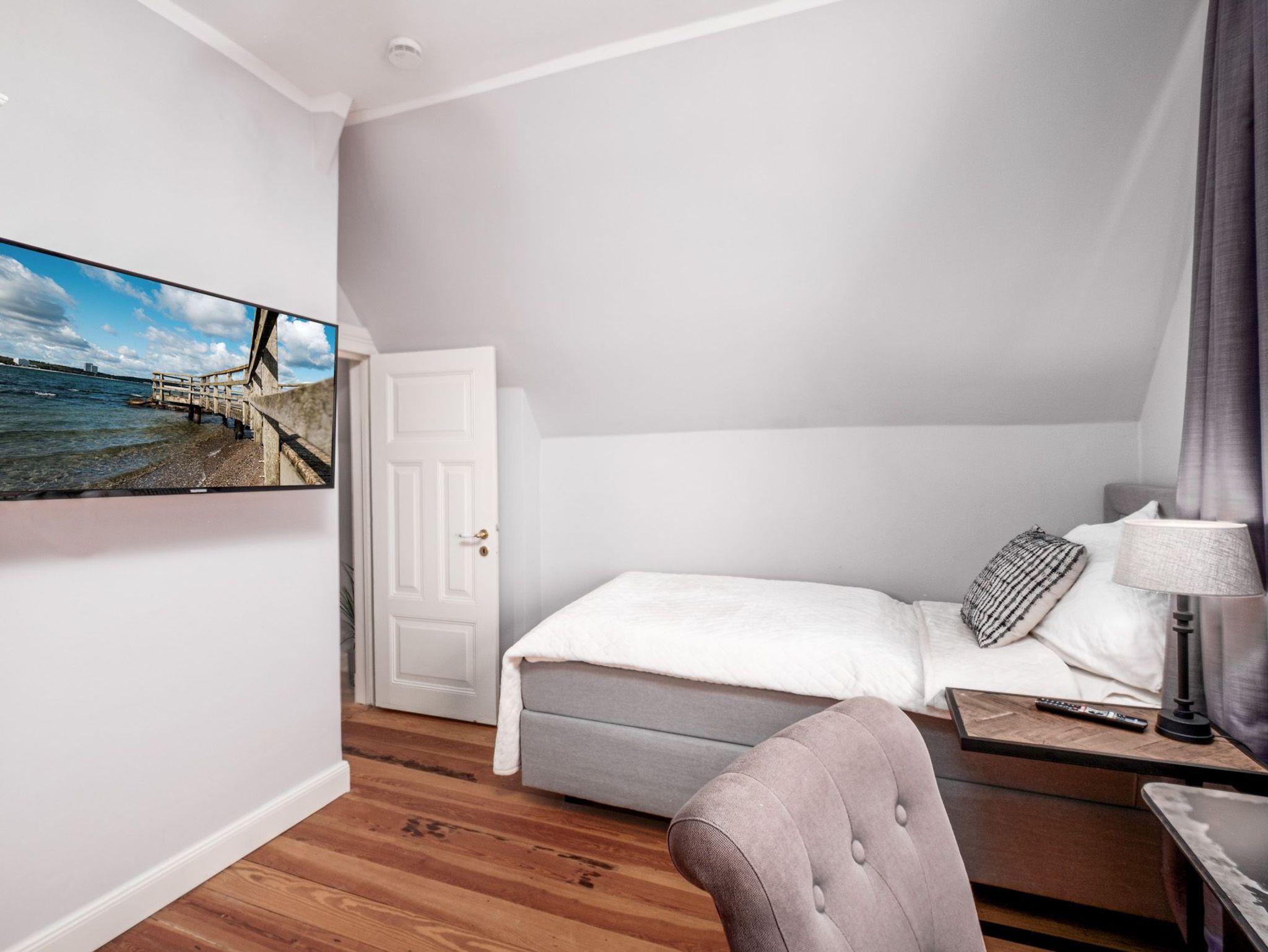Zusätzlich verfügt diese schöne Niendorf Ferienwohnung mit Meerblick über 3 Schlafzimmer mit komfortablen Boxspringbetten und weiteren Digital-TVs - eines mit einem bequemen Einzelbett (90 cm x 200 cm), das Zweite mit komfortablen Doppelbett (1 x 180 cm x 200 cm) und das dritte Schlafzimmer mit 2 Einzelbetten (je 90 cm x 200 cm).
