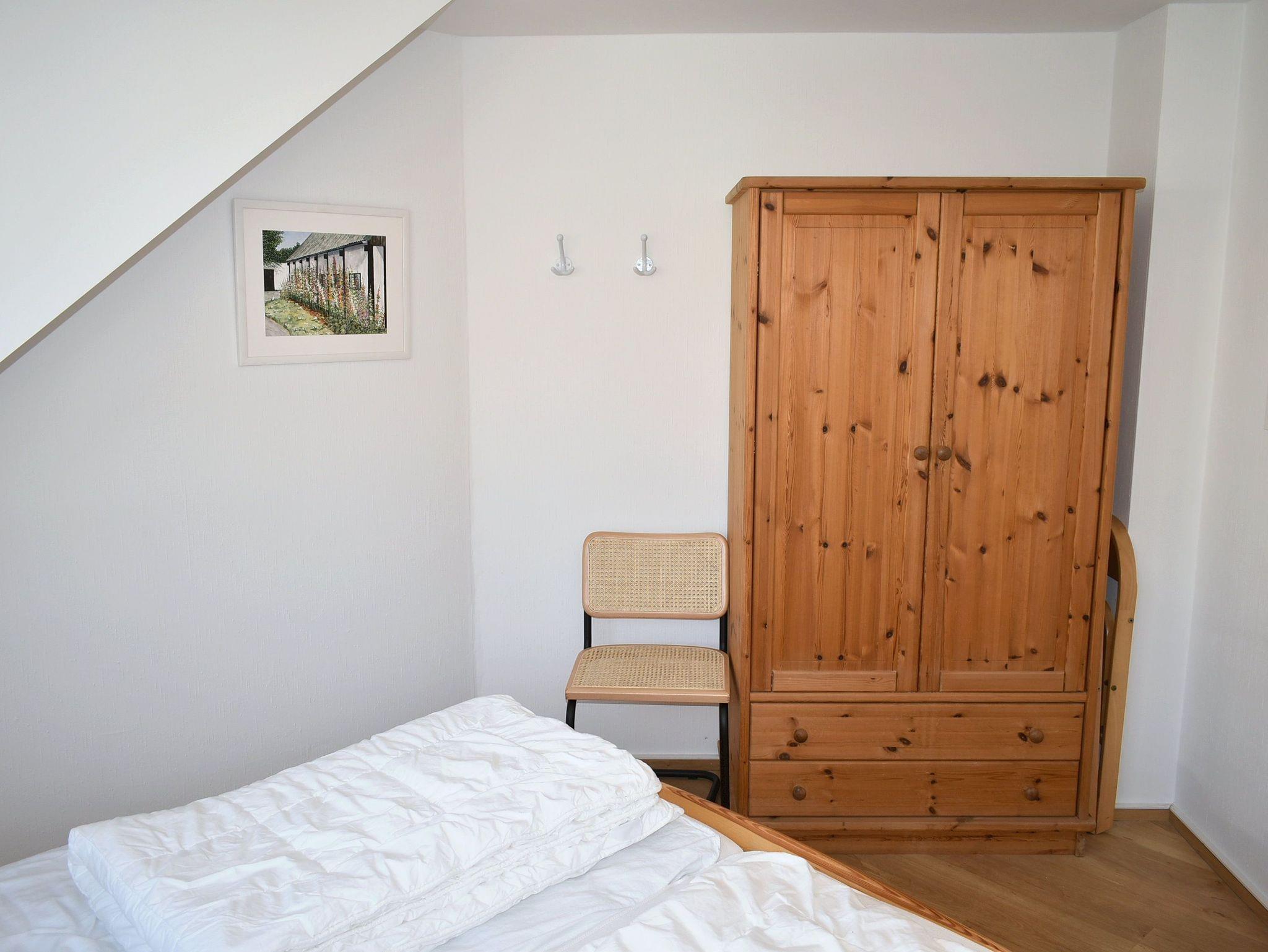 Schlafzimmer 1: 2 Klappstühle, 2 Nachttische, Doppelbett, Garderobe, Radiowecker, Schrank, Tisch, Wäscheständer, elektrische Aussenrollladen