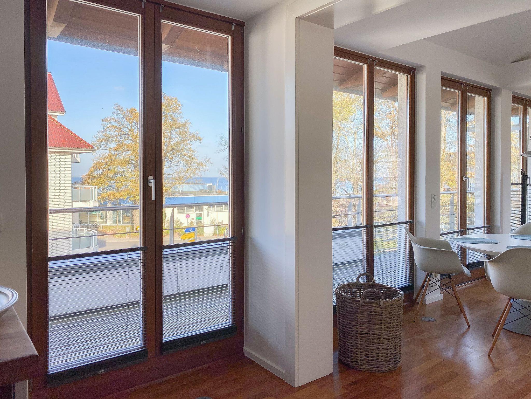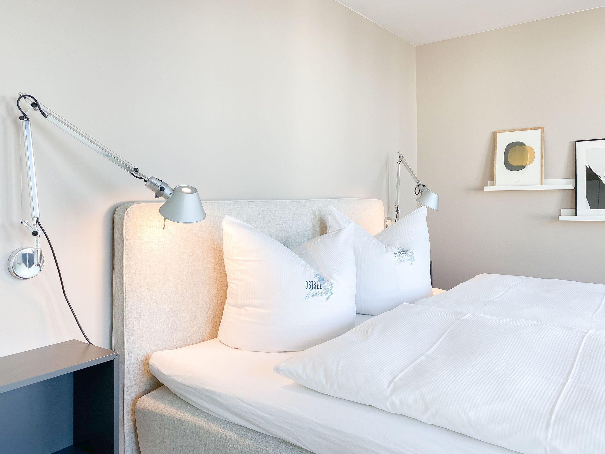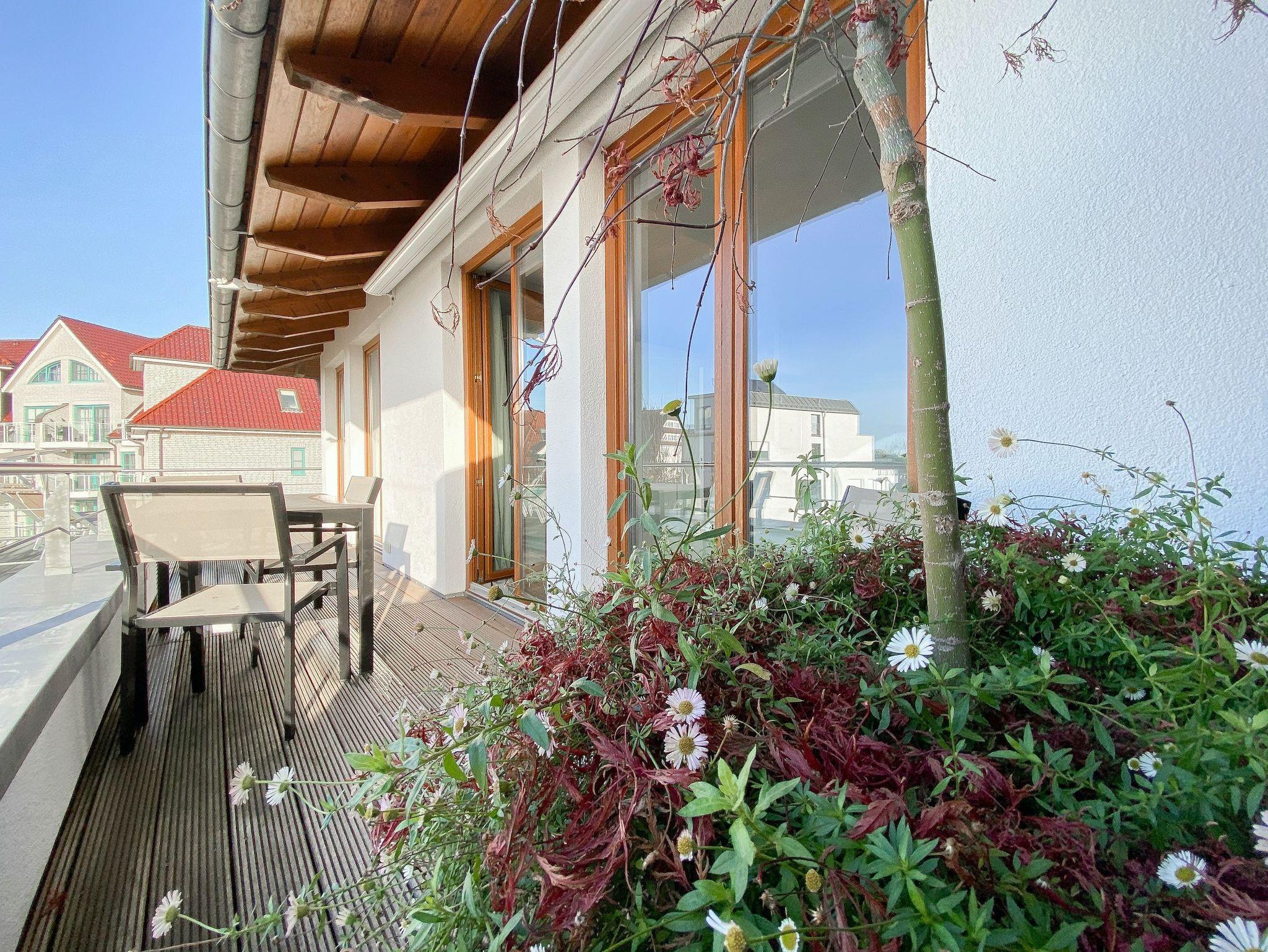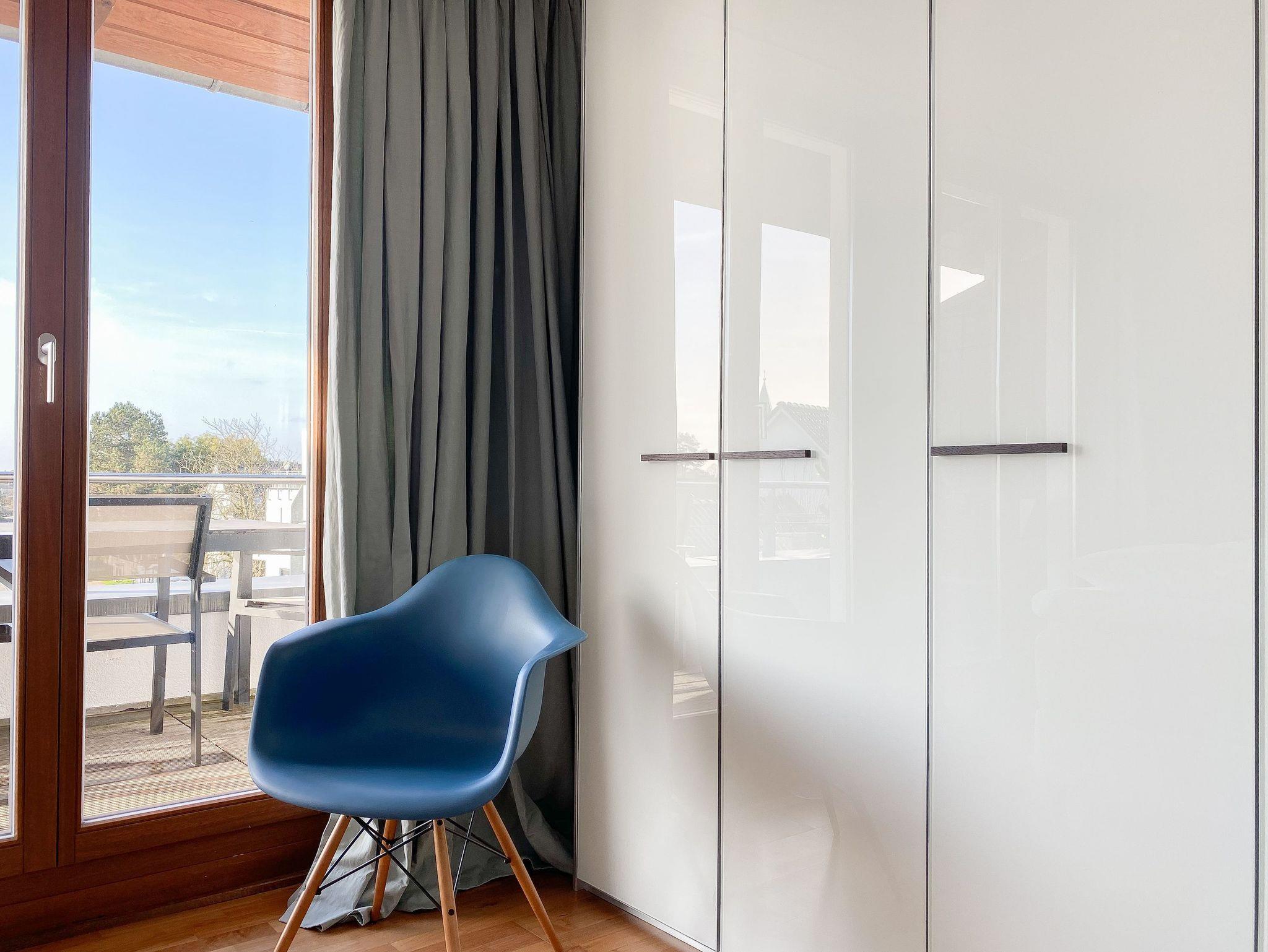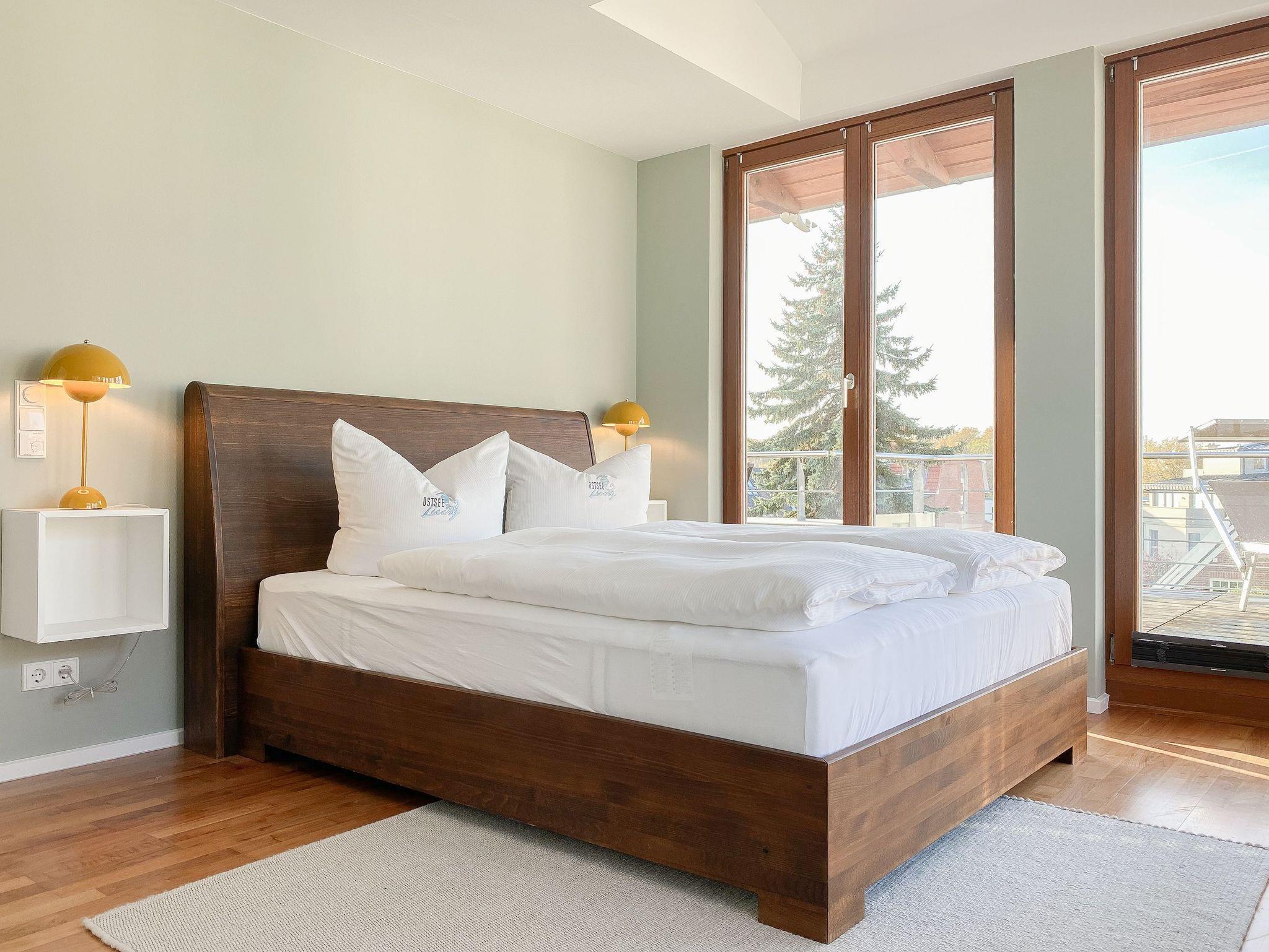 Es erwarten Sie lichtdurchflutete, großzügige Räumlichkeiten auf über 100 qm Wohnfläche und eine riesige, umlaufende Dachterrasse, die von allen Räumen zugänglich ist und mit einem Strandkorb, Gartenmöbeln und Sonnenliegen ausgestattet ist. Genießen Sie die herrliche Aussicht bis auf die Ostsee und Sonne oder Schatten je nach Belieben. Durch die Kombination von anspruchsvollem Design, hochwertigen Materialien und warmen Farben ist es gelungen, eine angenehme Atmosphäre in herrlichem Ambiente zu schaffen. Im 2. Obergeschoss erwartet Sie ein großzügiger Wohn- Essbereich mit Kamin und Ostseeblick. Die anschließende, halb offene Küche ist bestens ausgestattet und verfügt neben einer Frühstücksbar über reichlich Platz für gemeinsames Kochen. Es gibt 2 separate Schlafzimmer mit Doppelbetten (180x200 und 160x200), eines mit großem Kleiderschrank und Verdunkelungsvorhängen, das andere mit einer Kommode, Kleiderständer und Verdunkelungsjalousien sowie 2 hochwertige Bäder. WLAN steht selbstverständlich zur kostenlosen Nutzung zur Verfügung. Ein Fahrstuhl ist vorhanden.