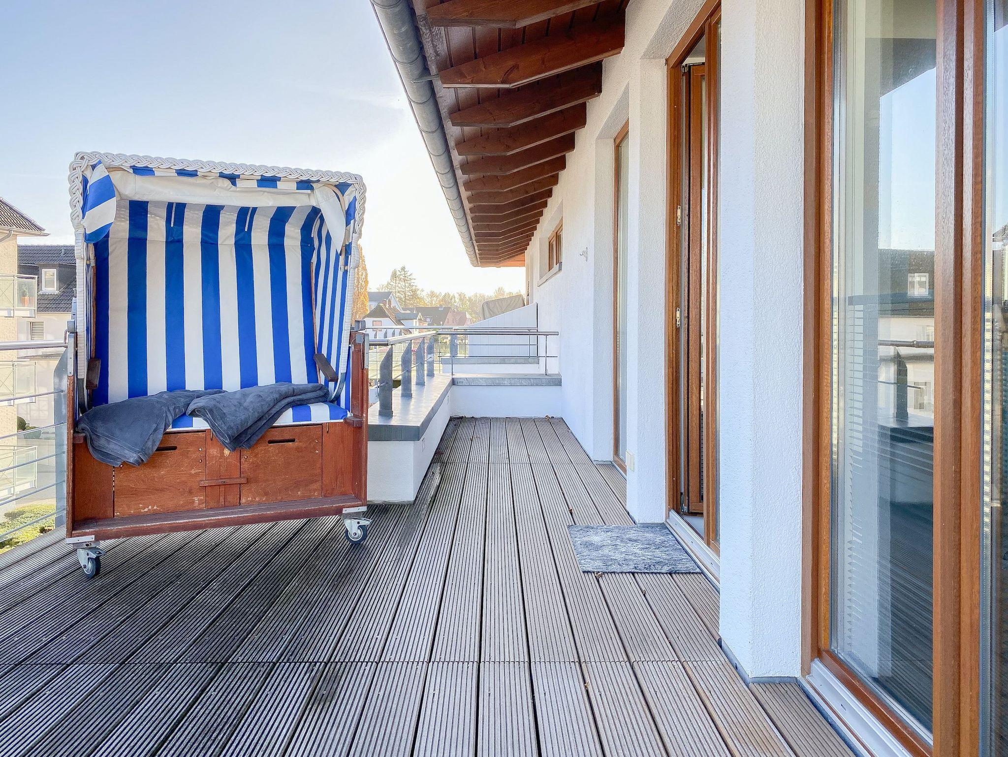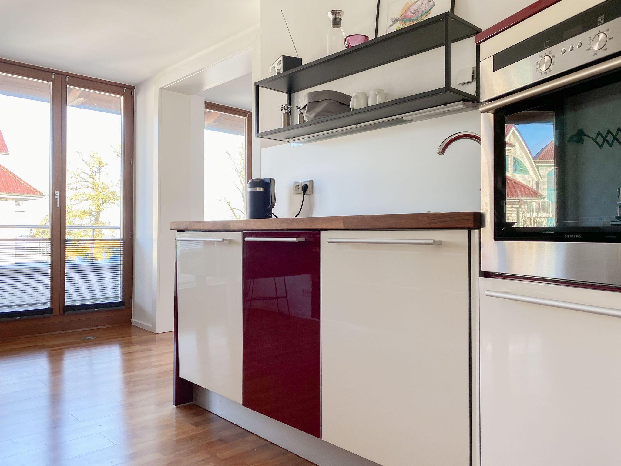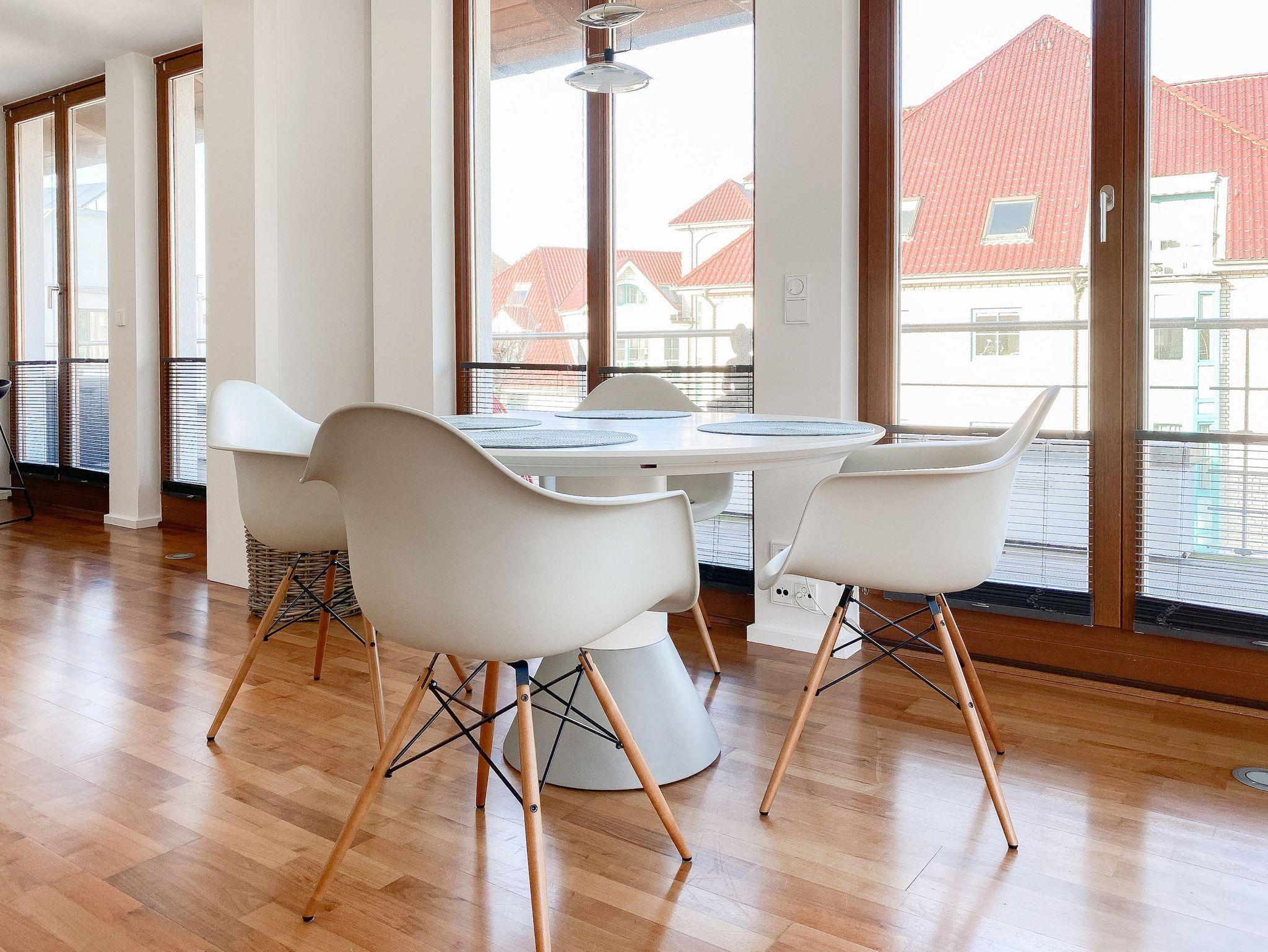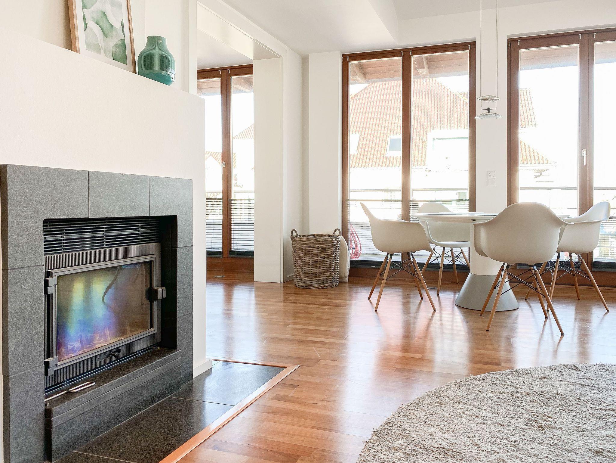 Es erwarten Sie lichtdurchflutete, großzügige Räumlichkeiten auf über 100 qm Wohnfläche und eine riesige, umlaufende Dachterrasse, die von allen Räumen zugänglich ist und mit einem Strandkorb, Gartenmöbeln und Sonnenliegen ausgestattet ist. Genießen Sie die herrliche Aussicht bis auf die Ostsee und Sonne oder Schatten je nach Belieben. Durch die Kombination von anspruchsvollem Design, hochwertigen Materialien und warmen Farben ist es gelungen, eine angenehme Atmosphäre in herrlichem Ambiente zu schaffen. Im 2. Obergeschoss erwartet Sie ein großzügiger Wohn- Essbereich mit Kamin und Ostseeblick. Die anschließende, halb offene Küche ist bestens ausgestattet und verfügt neben einer Frühstücksbar über reichlich Platz für gemeinsames Kochen. Es gibt 2 separate Schlafzimmer mit Doppelbetten (180x200 und 160x200), eines mit großem Kleiderschrank und Verdunkelungsvorhängen, das andere mit einer Kommode, Kleiderständer und Verdunkelungsjalousien sowie 2 hochwertige Bäder. WLAN steht selbstverständlich zur kostenlosen Nutzung zur Verfügung. Ein Fahrstuhl ist vorhanden.