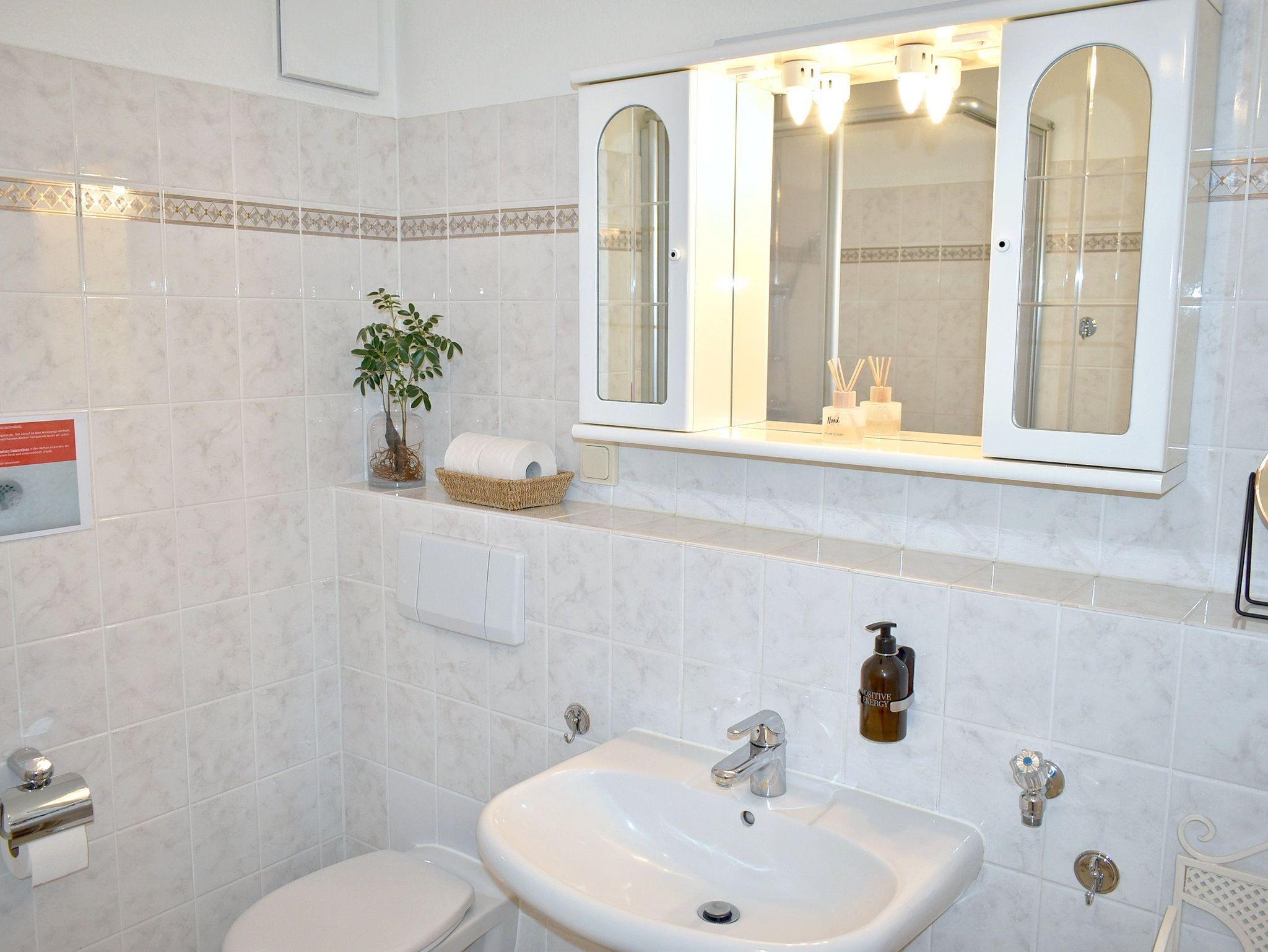 Bad 1: Dusche, Duschkabine, Fön, Kosmetikspiegel, Regal, Spiegelschrank, Waschbecken, WC