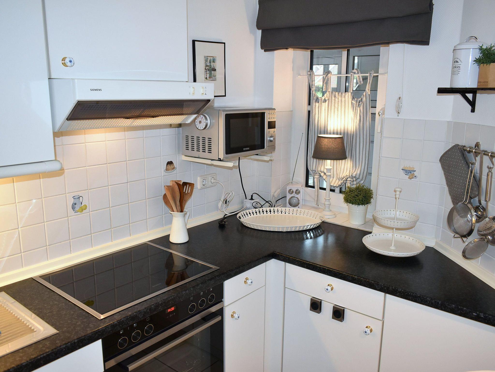 Küche: 2 Stühle, 4 Plattenherd mit Ceranfeld und Backofen, Einbauküche, Geschirr, Handmixer, Kaffeemaschine, Klapptisch, Kochtöpfe, Kühlschrank mit 3* Gefrierfach, Mikrowelle, Radio, Spülmaschine, Toaster, Wasserkocher