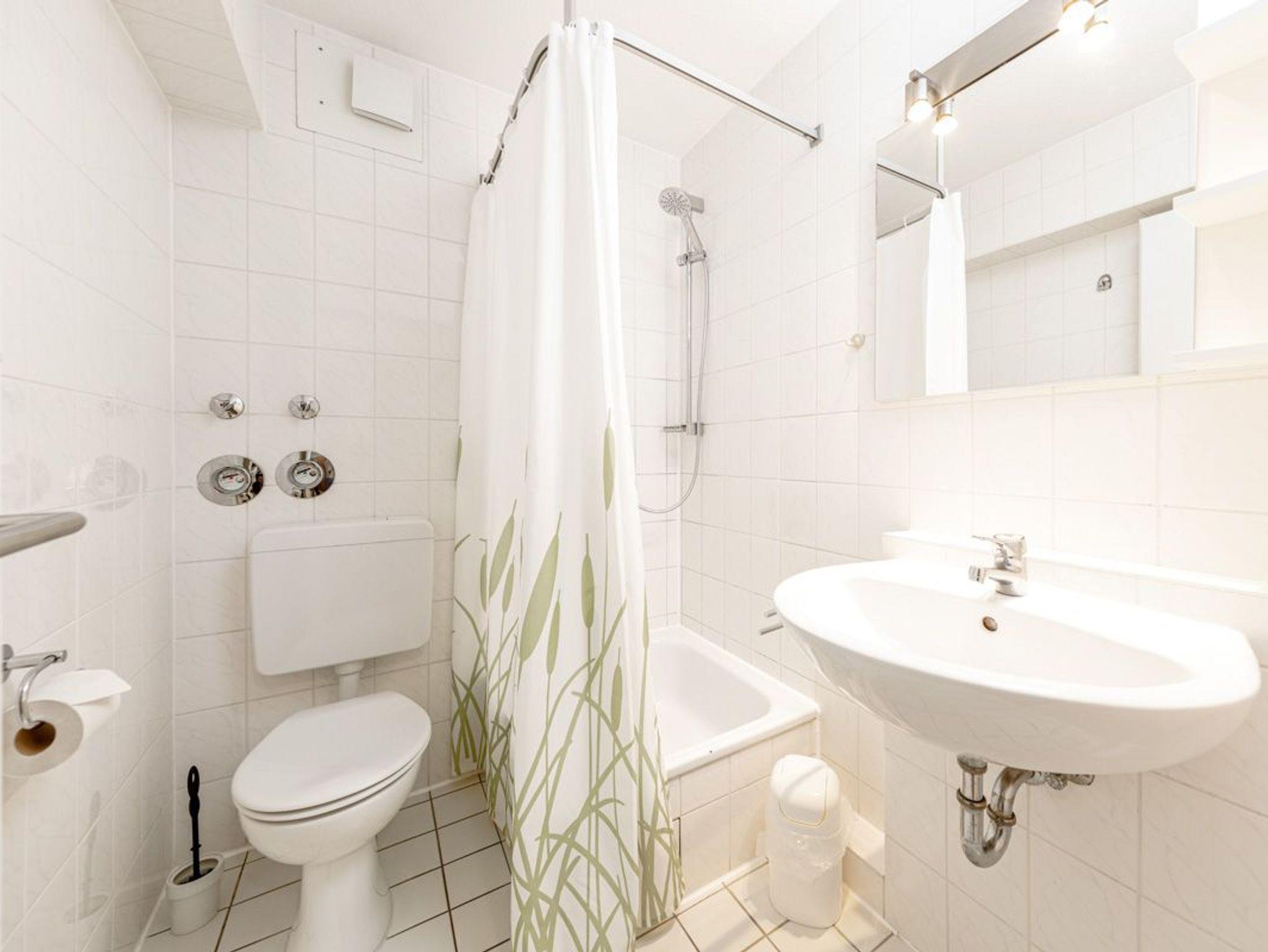 Das Badezimmer ist hell gefliest und ist mit einer Dusche, WC und einem Fön eingerichtet. Hier können Sie sich nach einem entspannten Tag am Strand erfrischen.