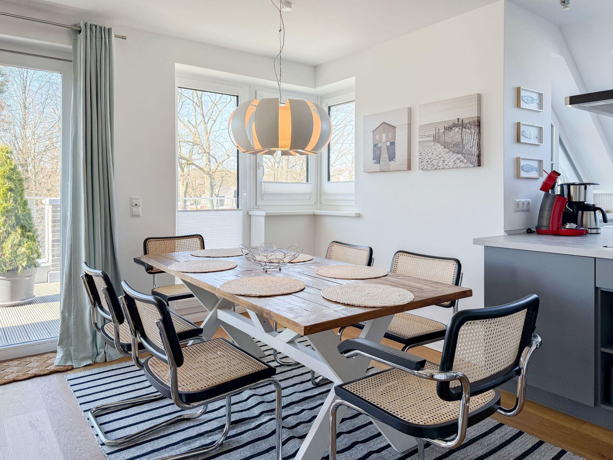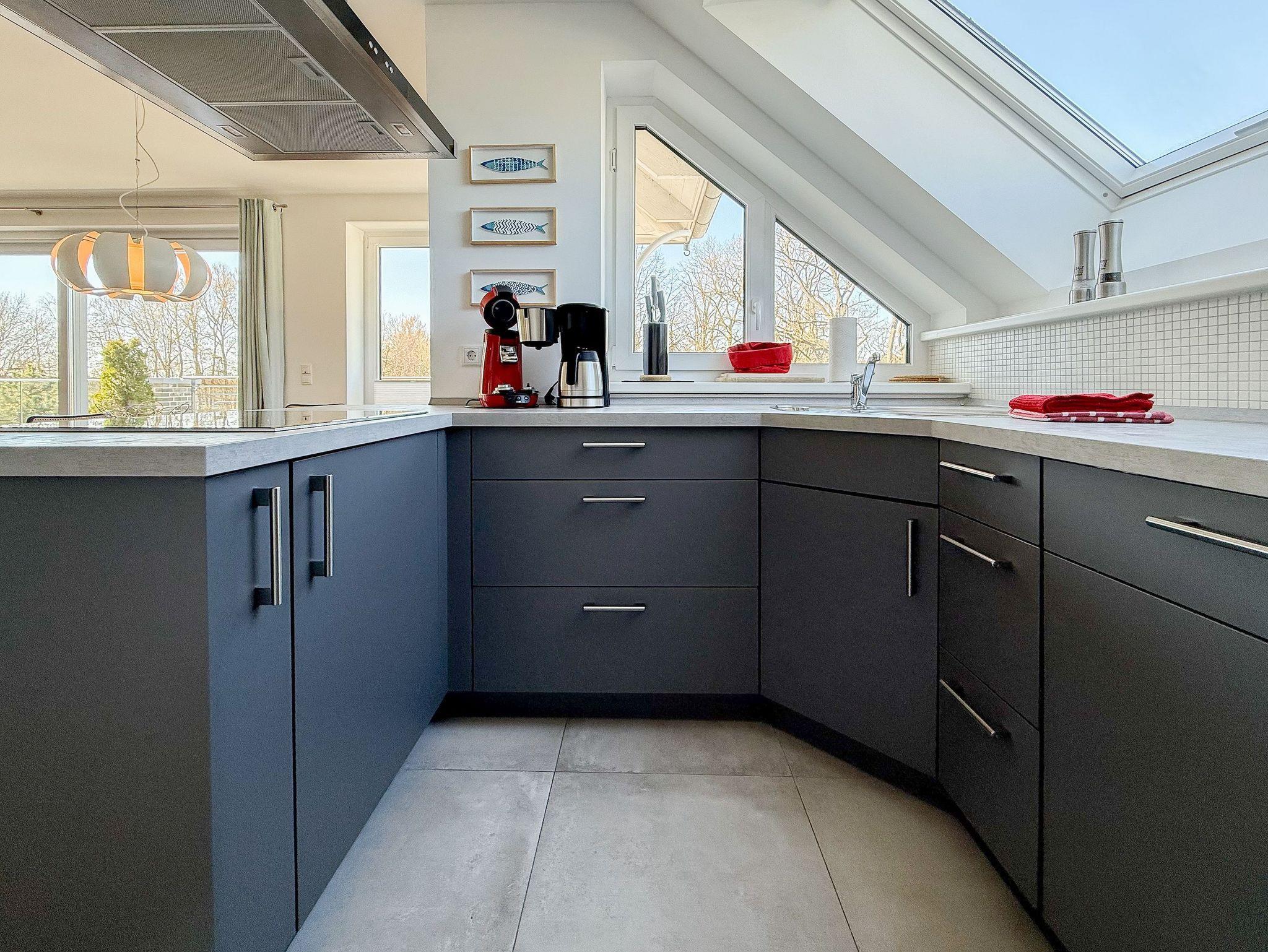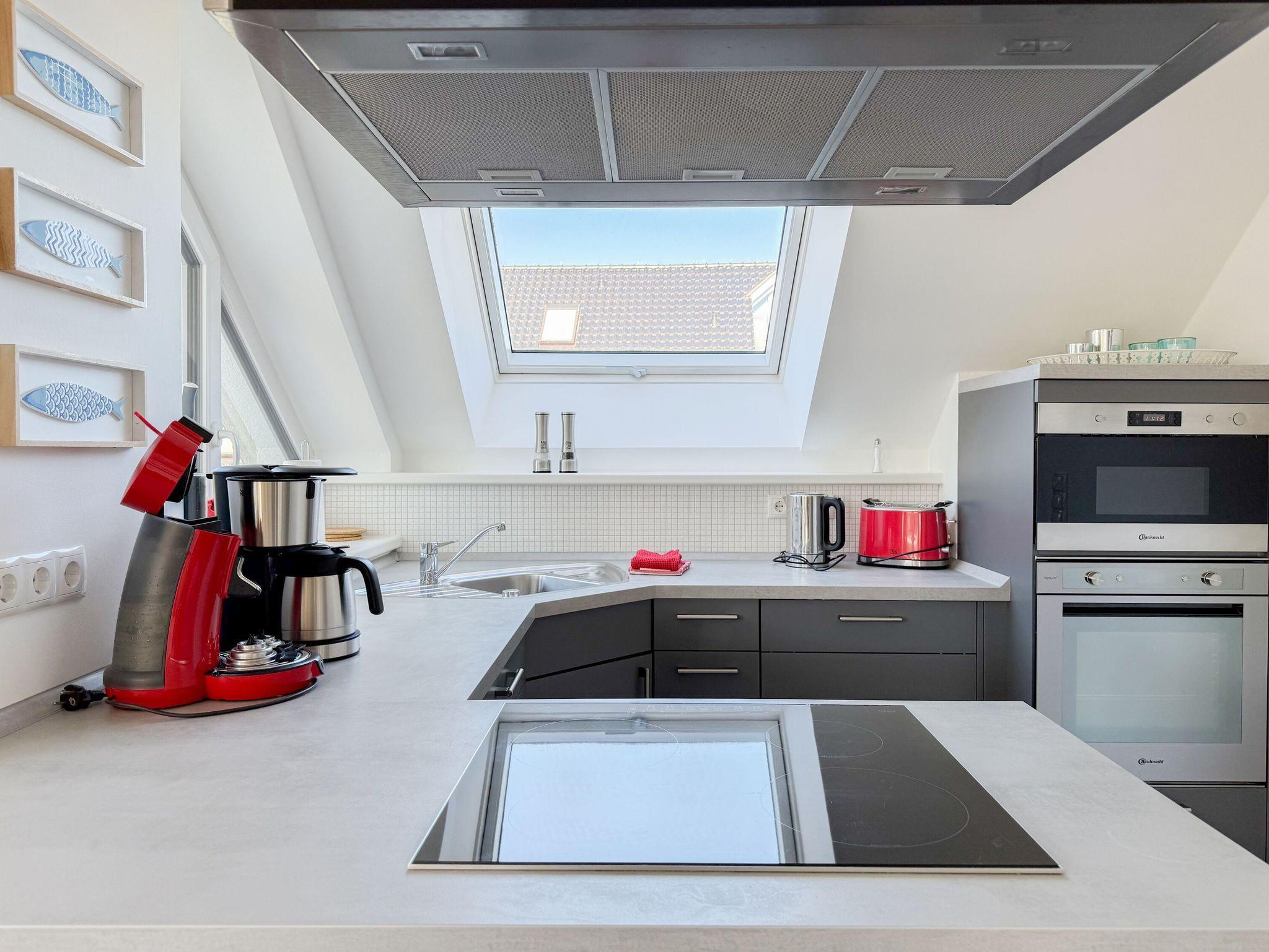 Das Penthouse ist hochwertig eingerichtet und bestens ausgestattet. Große, bodentiefe Fensterflächen durchfluten die Räumlichkeiten mit Tageslicht und sorgen für ein angenehmes Wohlfühlambiente ? ideal für einen entspannten Ostseeurlaub. Ein besonderes Highlight ist die großzügige, über 50 m² große Dachterrasse in Südwestausrichtung. Hier lassen sich die frische Meeresluft und den Hafenblick genießen ? ob auf den Sonnenliegen, an den Gartenmöbeln oder im Schatten der elektrischen Markise. Der offene Wohn- und Essbereich bietet viel Platz für gesellige Stunden. Ein Kaminofen (Holz nicht inklusive) sorgt für eine gemütliche Atmosphäre, und die moderne Einbauküche mit Kochinsel ist mit allen wichtigen Geräten ausgestattet ? perfekt für alle, die gerne gemeinsam kochen. Auf der unteren Wohnebene befindet sich eines der beiden stilvollen Bäder mit Dusche und Waschtisch sowie eine Sauna mit Blick ins Grüne. Die obere Ebene beherbergt zwei separate Schlafzimmer mit Doppelbetten (180x200 und 140x200 plus Schlafsessel), Verdunkelungsvorhängen und TV. Das kleine Schlafzimmer punktet mit einem tollen Blick auf den Hafen. Ein weiteres Badezimmer mit Badewanne rundet den Komfort ab. Das Penthouse bietet auf über 100 m² einen herrlichen Rückzugsort für 2-4 Personen mit der ganz besonderen Atmosphäre des Hafens.