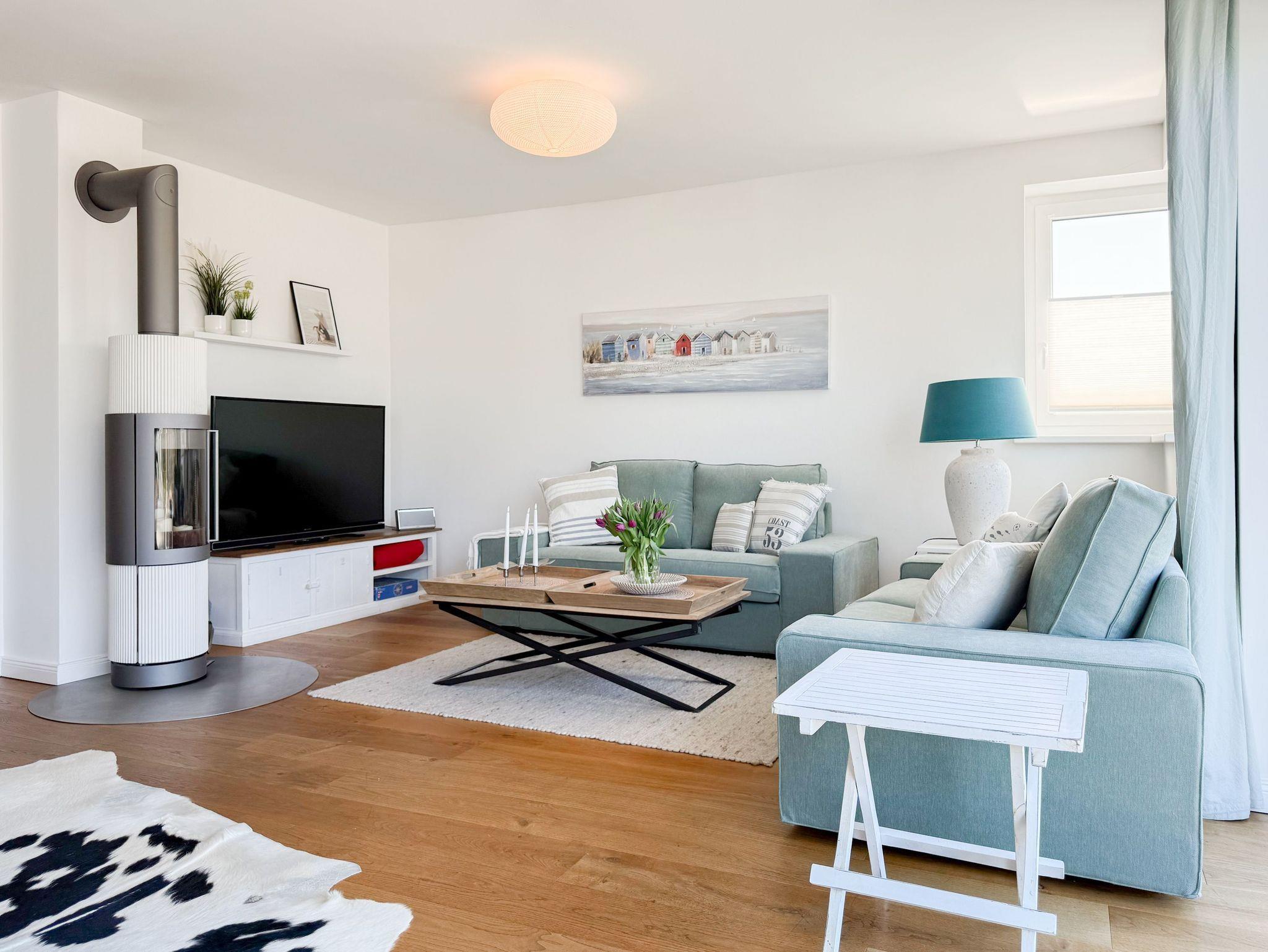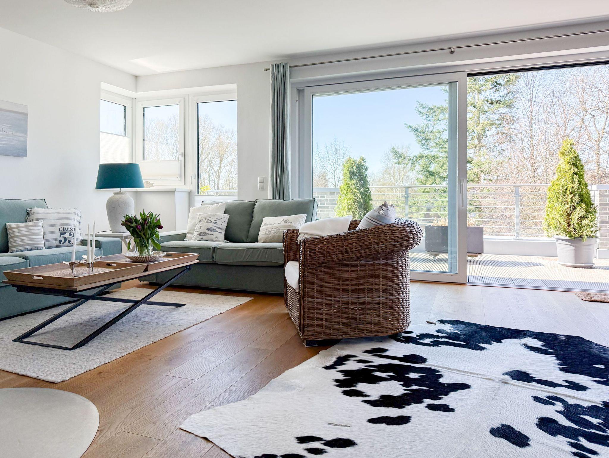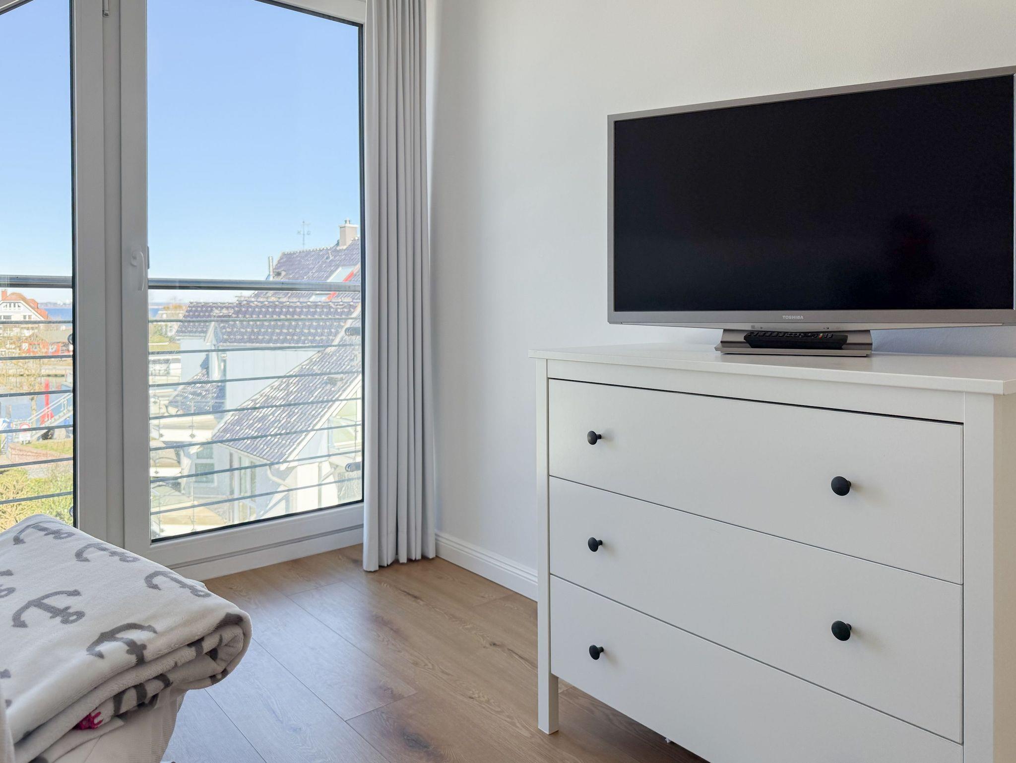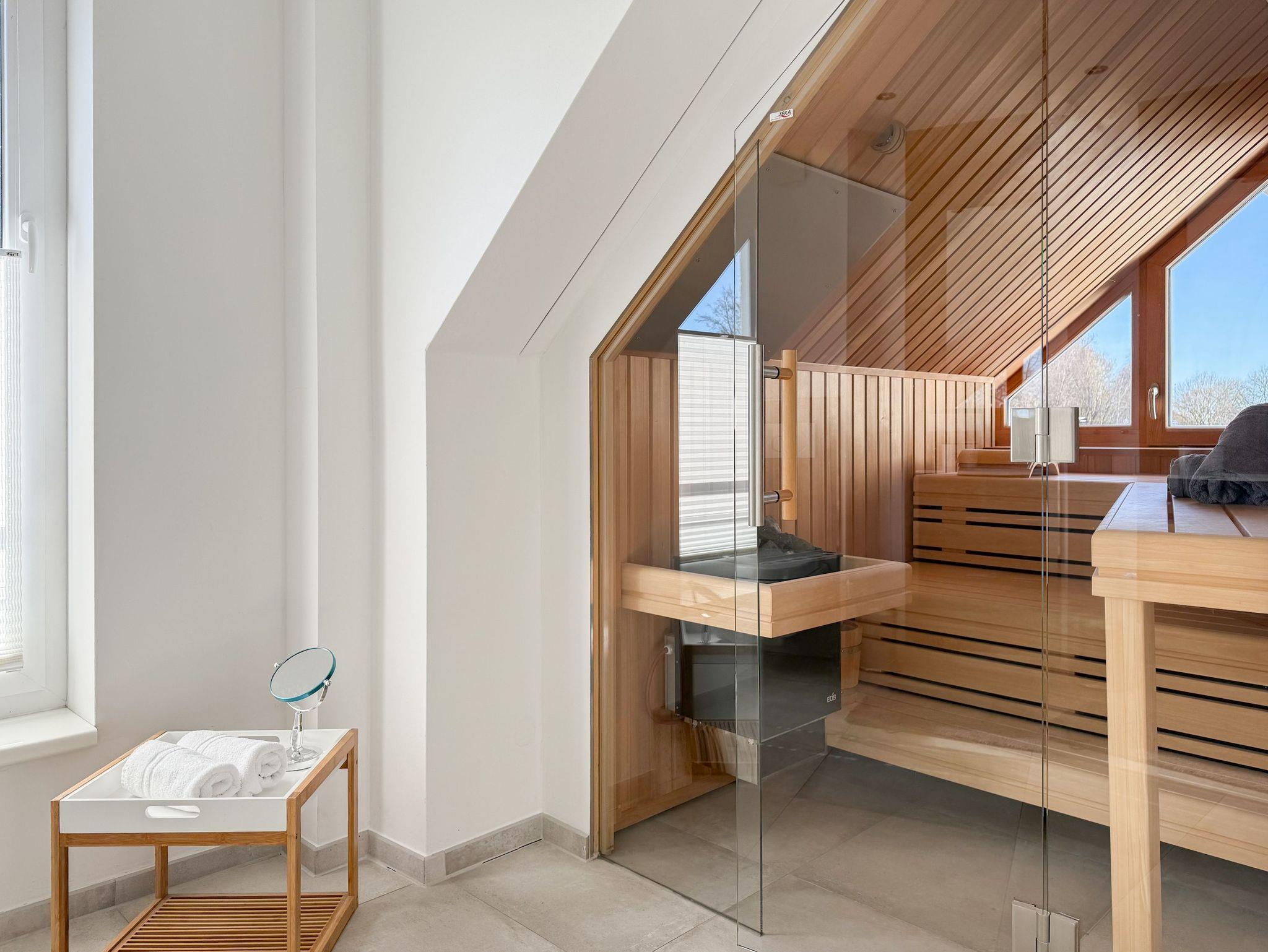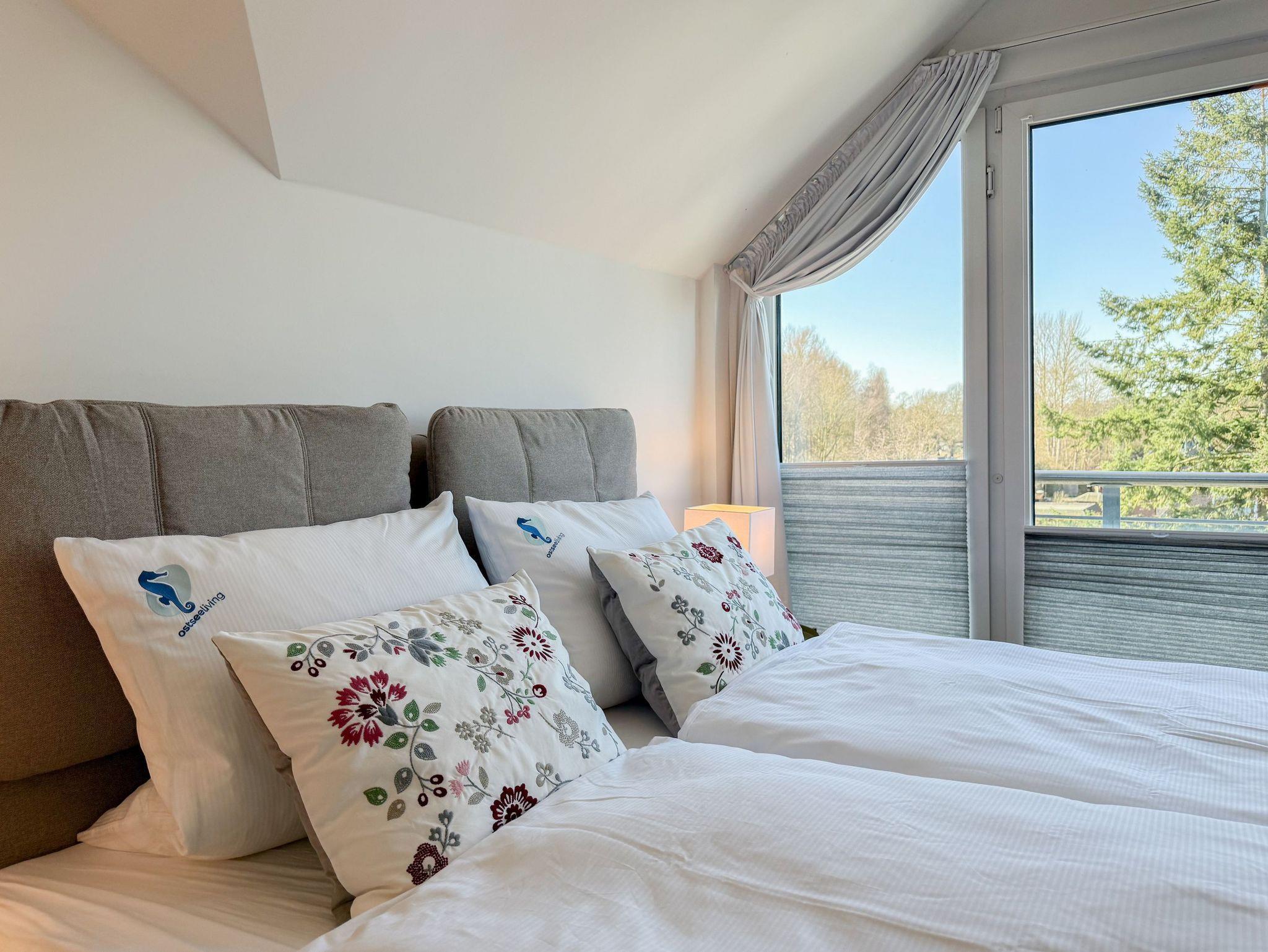 Das Penthouse ist hochwertig eingerichtet und bestens ausgestattet. Große, bodentiefe Fensterflächen durchfluten die Räumlichkeiten mit Tageslicht und sorgen für ein angenehmes Wohlfühlambiente ideal für einen entspannten Ostseeurlaub. Ein besonderes Highlight ist die großzügige, über 50 m² große Dachterrasse in Südwestausrichtung. Hier lassen sich die frische Meeresluft und den Hafenblick genießen ob auf den Sonnenliegen, an den Gartenmöbeln oder im Schatten der elektrischen Markise. Der offene Wohn- und Essbereich bietet viel Platz für gesellige Stunden. Ein Kaminofen (Holz nicht inklusive) sorgt für eine gemütliche Atmosphäre, und die moderne Einbauküche mit Kochinsel ist mit allen wichtigen Geräten ausgestattet perfekt für alle, die gerne gemeinsam kochen. Auf der unteren Wohnebene befindet sich eines der beiden stilvollen Bäder mit Dusche und Waschtisch sowie eine Sauna mit Blick ins Grüne. Die obere Ebene beherbergt zwei separate Schlafzimmer mit Doppelbetten (180x200 und 140x200 plus Schlafsessel), Verdunkelungsvorhängen und TV. Das kleine Schlafzimmer punktet mit einem tollen Blick auf den Hafen. Ein weiteres Badezimmer mit Badewanne rundet den Komfort ab. Das Penthouse bietet auf über 100 m² einen herrlichen Rückzugsort für 2-4 Personen mit der ganz besonderen Atmosphäre des Hafens.