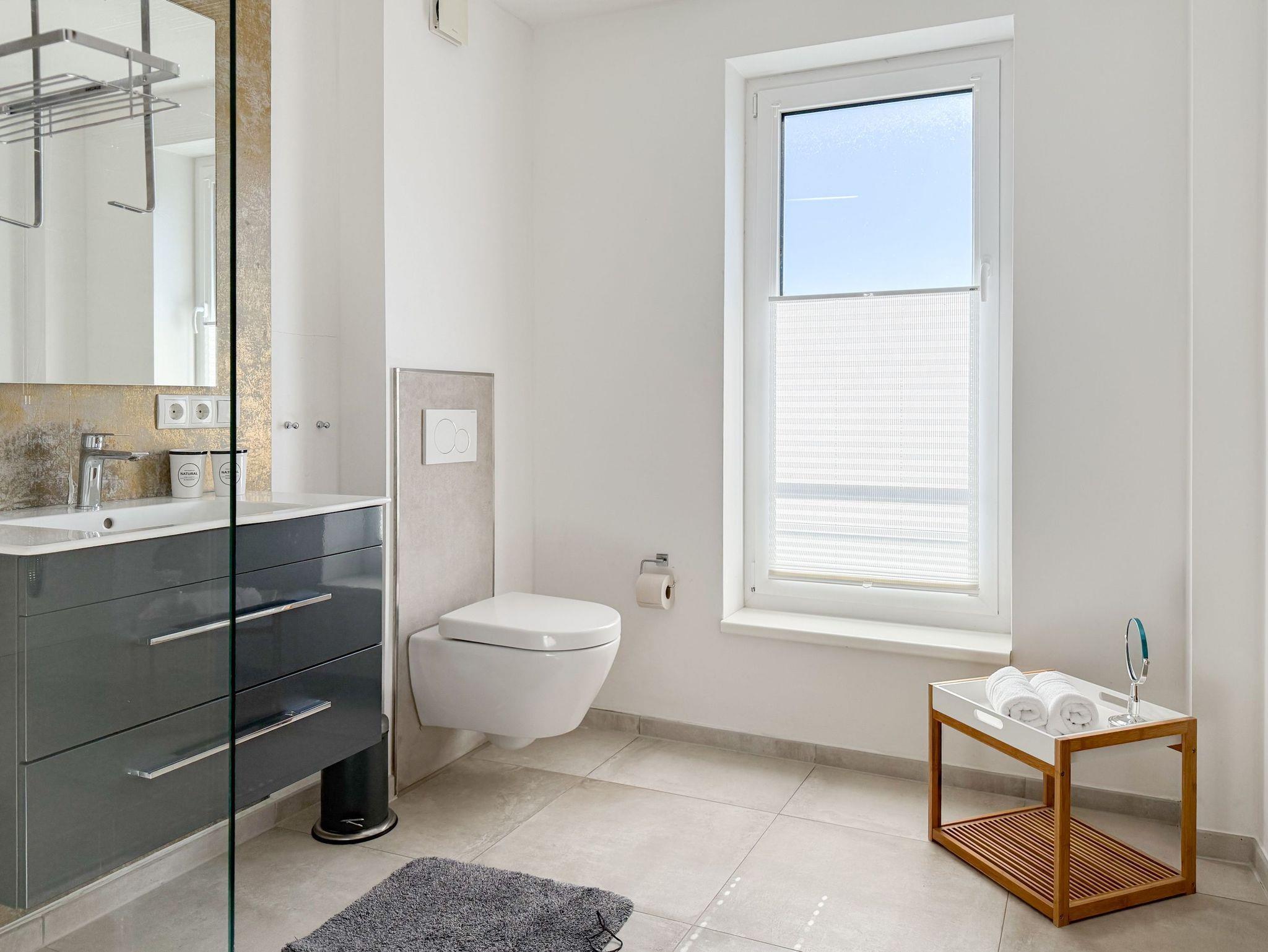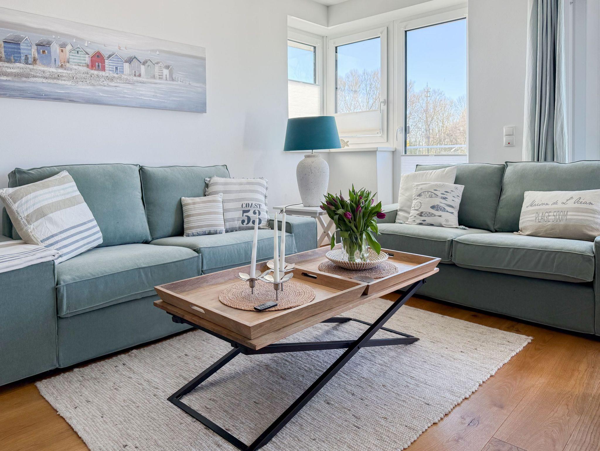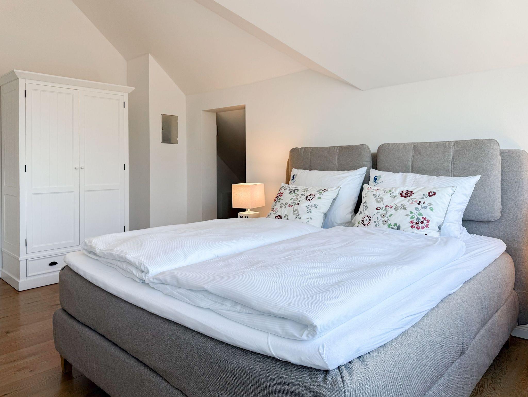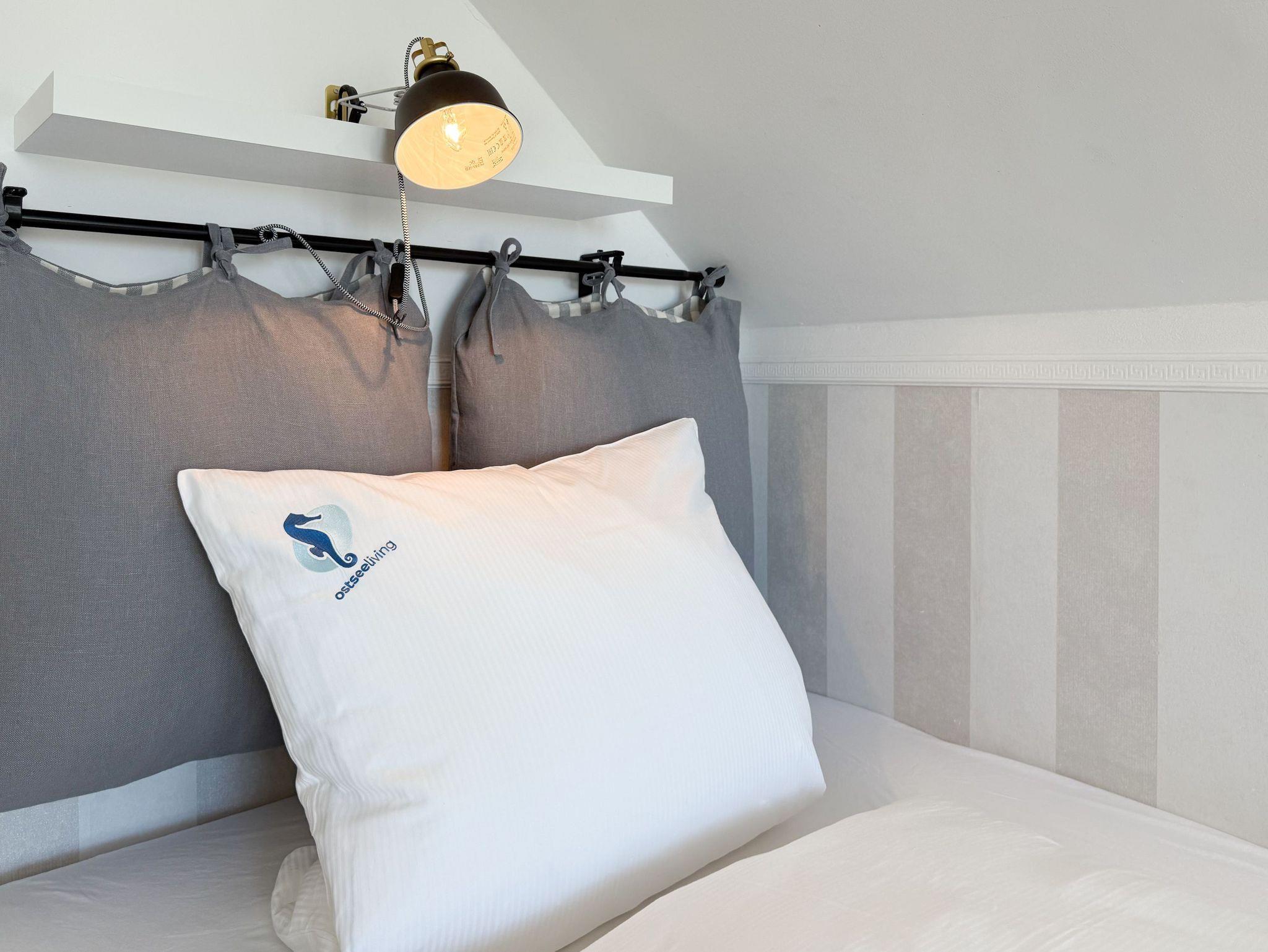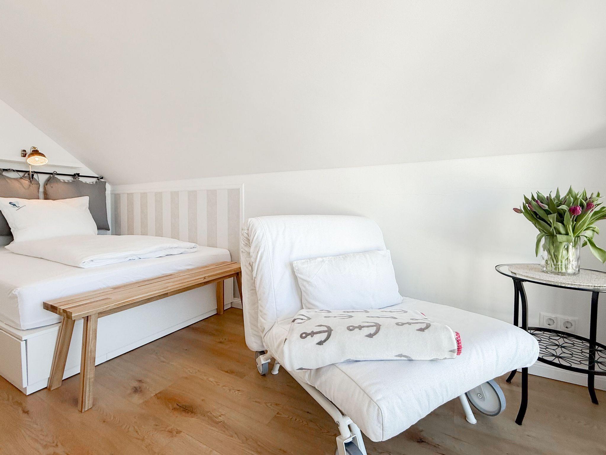 Das Penthouse ist hochwertig eingerichtet und bestens ausgestattet. Große, bodentiefe Fensterflächen durchfluten die Räumlichkeiten mit Tageslicht und sorgen für ein angenehmes Wohlfühlambiente ideal für einen entspannten Ostseeurlaub. Ein besonderes Highlight ist die großzügige, über 50 m² große Dachterrasse in Südwestausrichtung. Hier lassen sich die frische Meeresluft und den Hafenblick genießen ob auf den Sonnenliegen, an den Gartenmöbeln oder im Schatten der elektrischen Markise. Der offene Wohn- und Essbereich bietet viel Platz für gesellige Stunden. Ein Kaminofen (Holz nicht inklusive) sorgt für eine gemütliche Atmosphäre, und die moderne Einbauküche mit Kochinsel ist mit allen wichtigen Geräten ausgestattet perfekt für alle, die gerne gemeinsam kochen. Auf der unteren Wohnebene befindet sich eines der beiden stilvollen Bäder mit Dusche und Waschtisch sowie eine Sauna mit Blick ins Grüne. Die obere Ebene beherbergt zwei separate Schlafzimmer mit Doppelbetten (180x200 und 140x200 plus Schlafsessel), Verdunkelungsvorhängen und TV. Das kleine Schlafzimmer punktet mit einem tollen Blick auf den Hafen. Ein weiteres Badezimmer mit Badewanne rundet den Komfort ab. Das Penthouse bietet auf über 100 m² einen herrlichen Rückzugsort für 2-4 Personen mit der ganz besonderen Atmosphäre des Hafens.