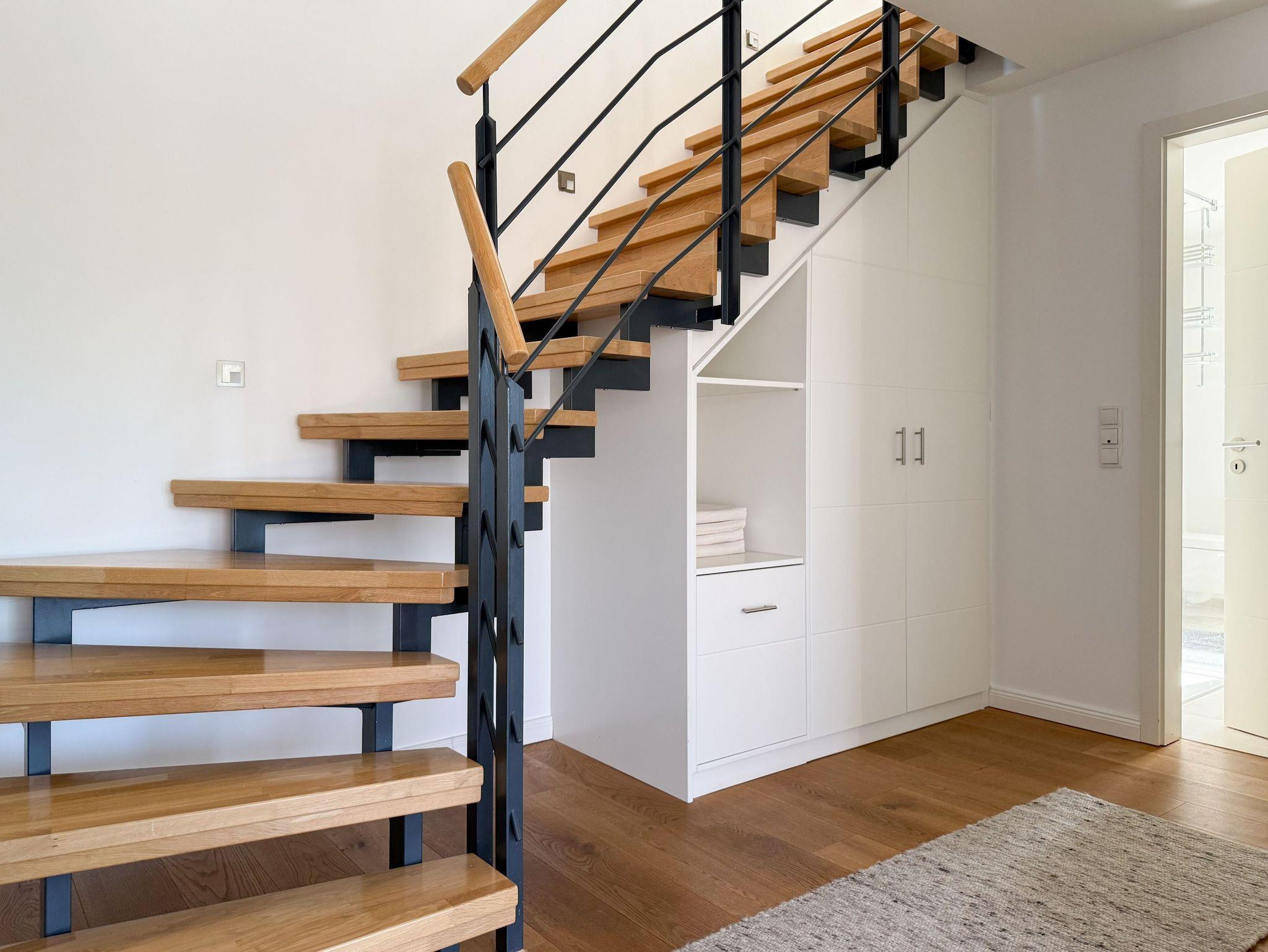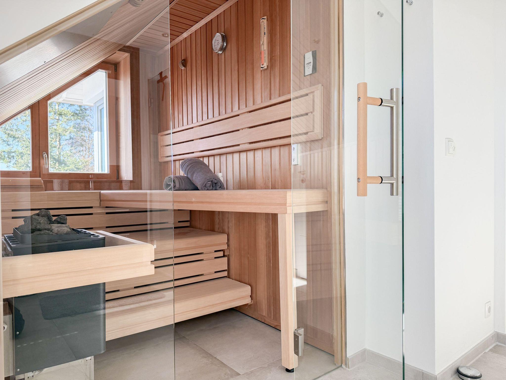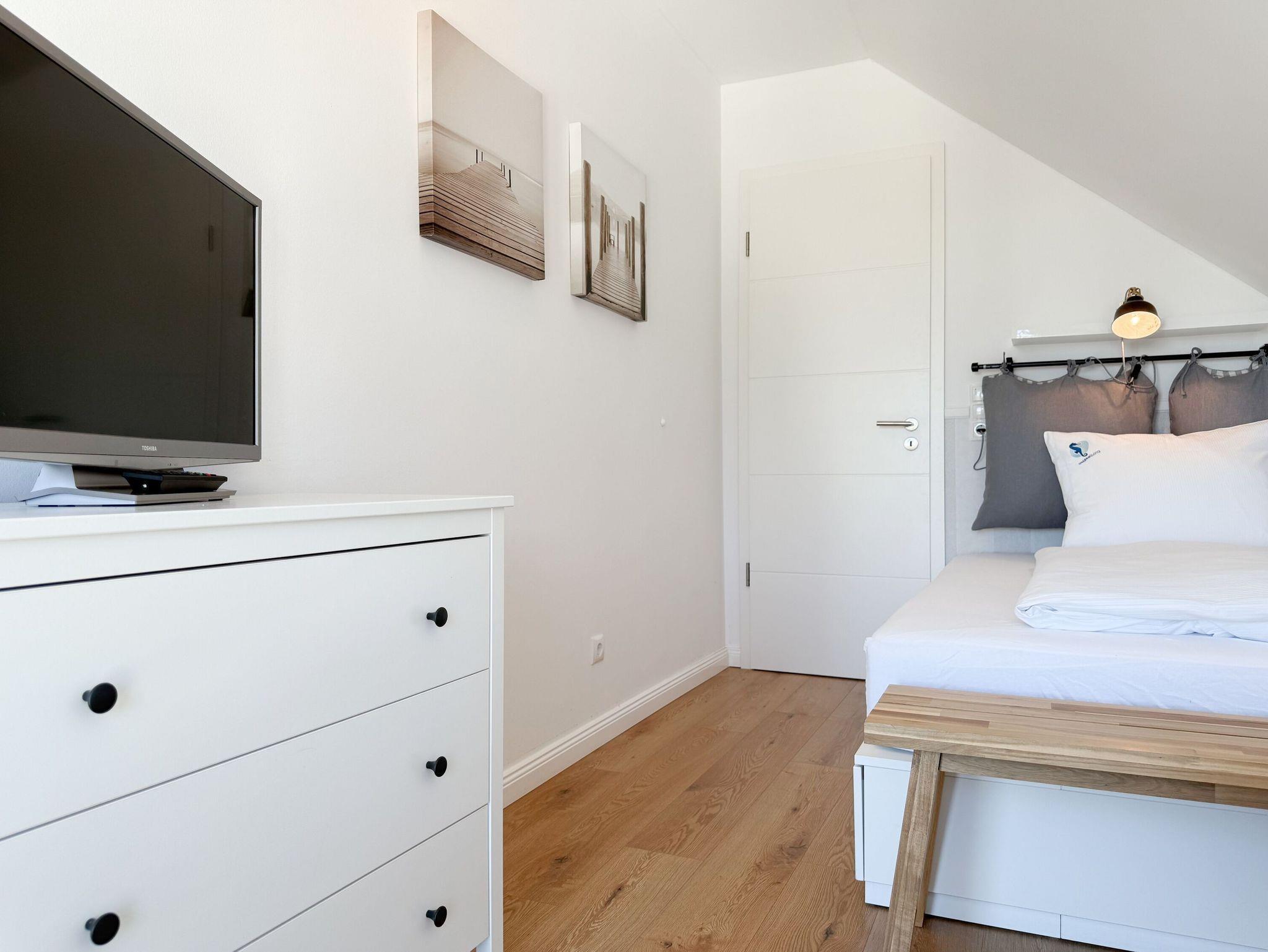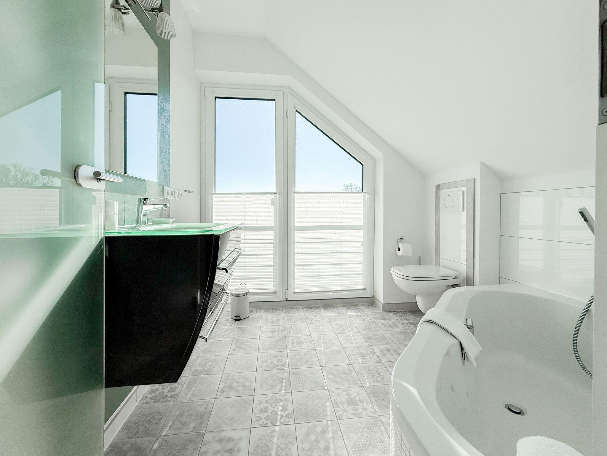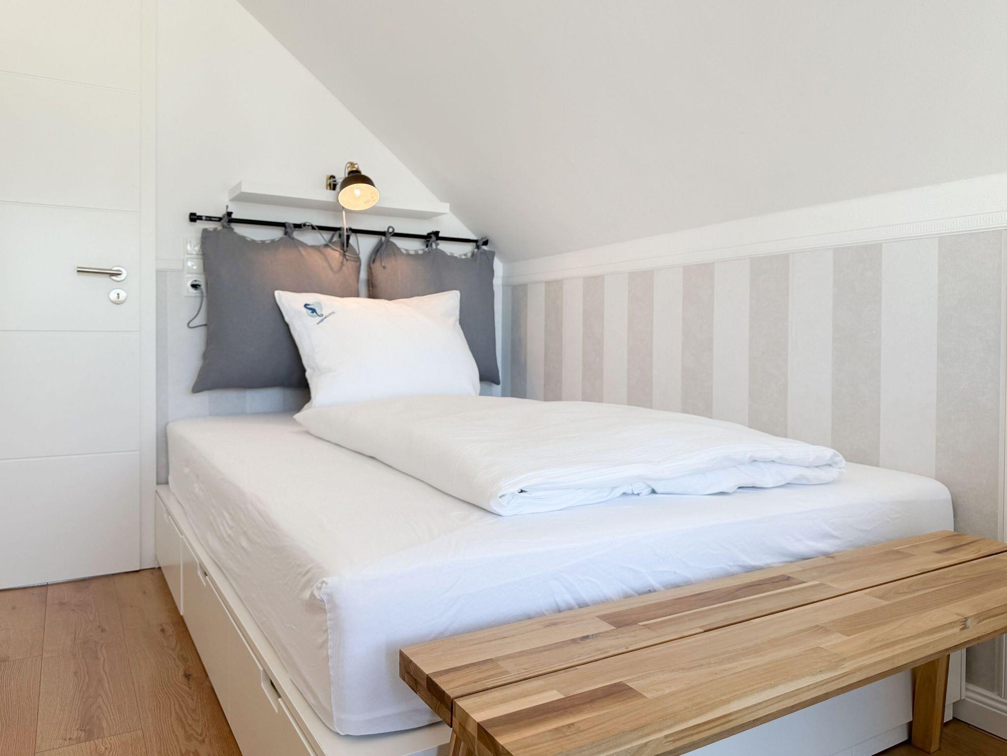 Das Penthouse ist hochwertig eingerichtet und bestens ausgestattet. Große, bodentiefe Fensterflächen durchfluten die Räumlichkeiten mit Tageslicht und sorgen für ein angenehmes Wohlfühlambiente ideal für einen entspannten Ostseeurlaub. Ein besonderes Highlight ist die großzügige, über 50 m² große Dachterrasse in Südwestausrichtung. Hier lassen sich die frische Meeresluft und den Hafenblick genießen ob auf den Sonnenliegen, an den Gartenmöbeln oder im Schatten der elektrischen Markise. Der offene Wohn- und Essbereich bietet viel Platz für gesellige Stunden. Ein Kaminofen (Holz nicht inklusive) sorgt für eine gemütliche Atmosphäre, und die moderne Einbauküche mit Kochinsel ist mit allen wichtigen Geräten ausgestattet perfekt für alle, die gerne gemeinsam kochen. Auf der unteren Wohnebene befindet sich eines der beiden stilvollen Bäder mit Dusche und Waschtisch sowie eine Sauna mit Blick ins Grüne. Die obere Ebene beherbergt zwei separate Schlafzimmer mit Doppelbetten (180x200 und 140x200 plus Schlafsessel), Verdunkelungsvorhängen und TV. Das kleine Schlafzimmer punktet mit einem tollen Blick auf den Hafen. Ein weiteres Badezimmer mit Badewanne rundet den Komfort ab. Das Penthouse bietet auf über 100 m² einen herrlichen Rückzugsort für 2-4 Personen mit der ganz besonderen Atmosphäre des Hafens.