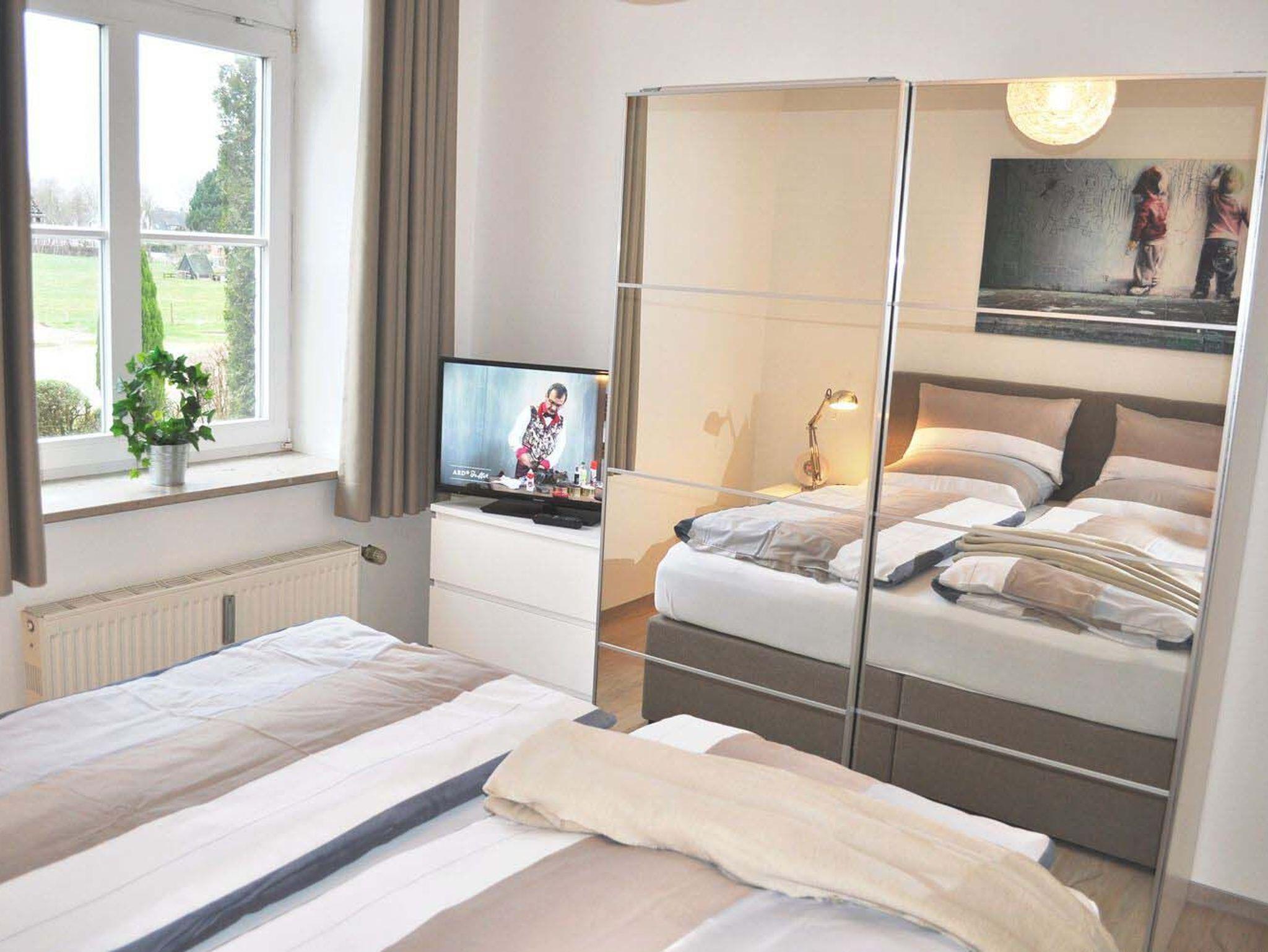 Schlafzimmer 1: 1 Matratze, 2 Nachttische, Boxspringbett 2,00 x 1,80 m, Flachbildschirm, Kleiderschrank mit Spiegel, Kommode, Radiowecker
