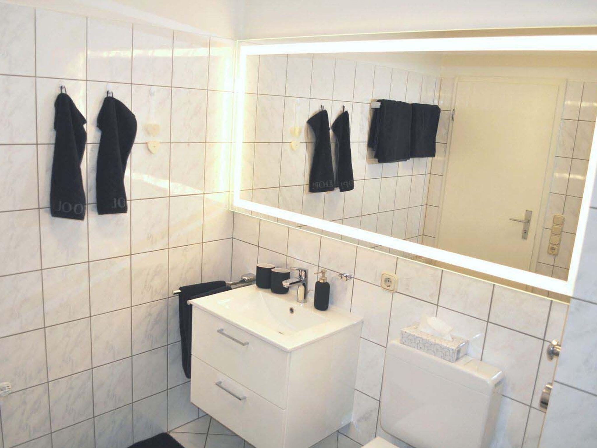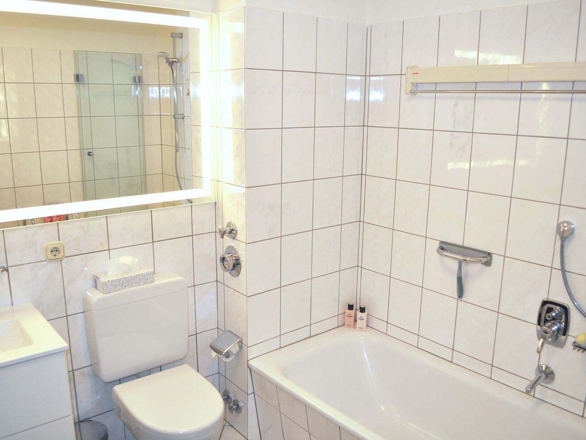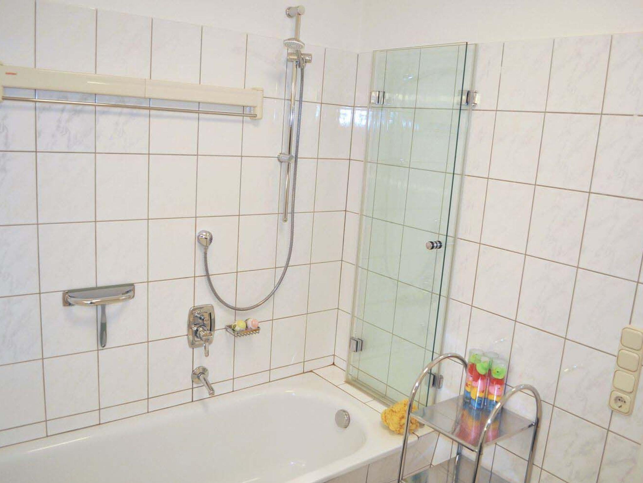 Bad 1: Badewanne, Glastrennwand, Regal, Spiegel, Waschtisch mit Unterschrank, WC