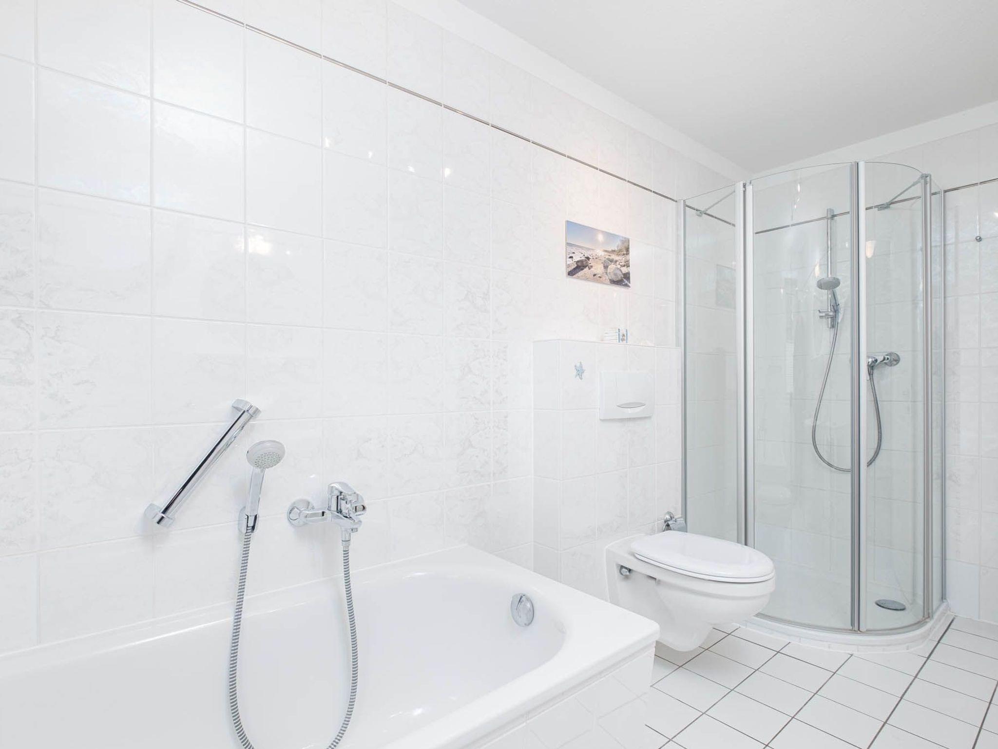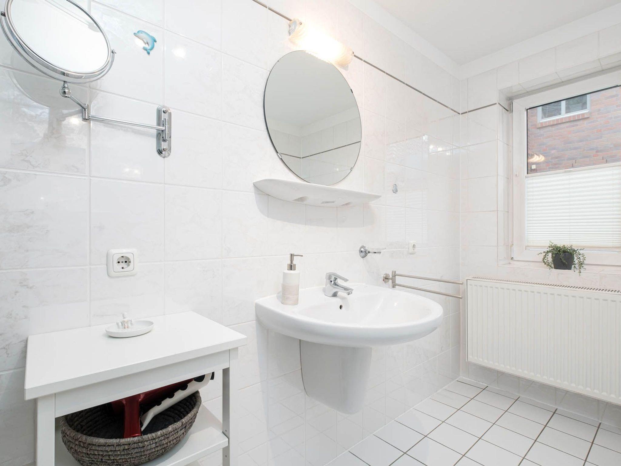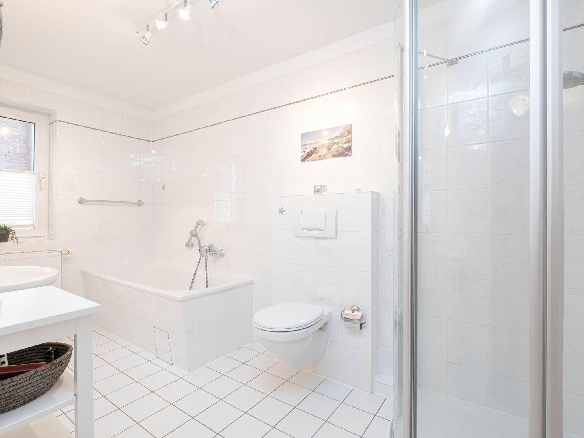Darüber hinaus finden Sie hier ein Badezimmer mit Badewanne und separater Dusche, WC, Fön und Kosmetikspiegel, sowie ein zusätzliches Gäste-WC vor.