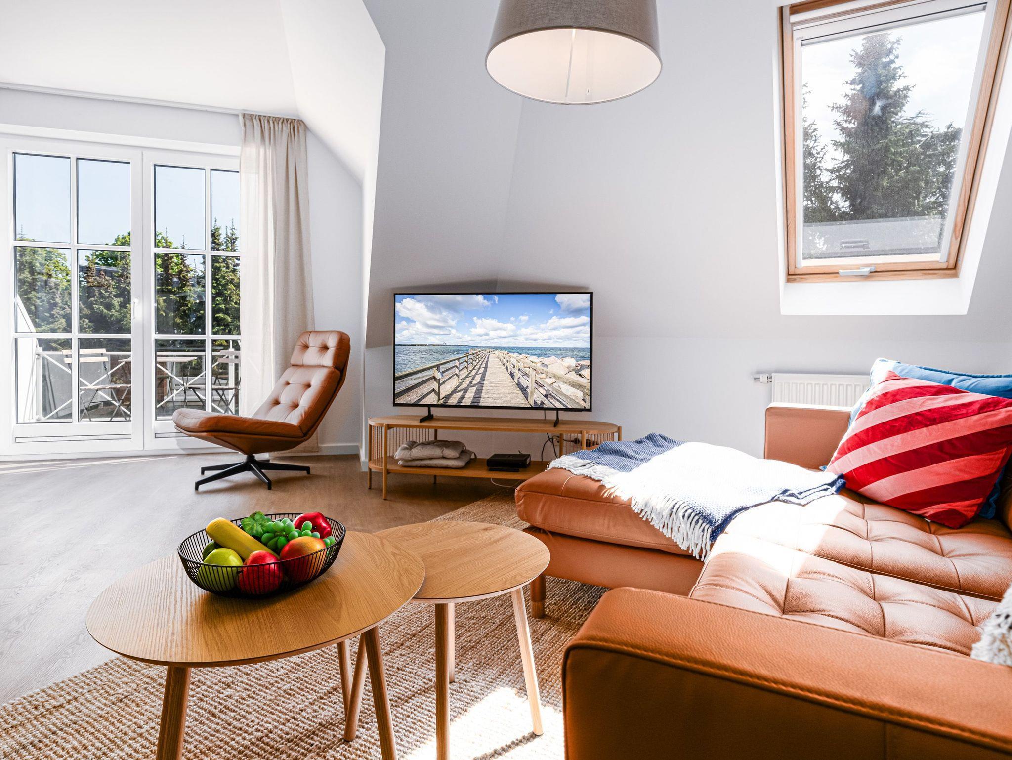 Das Wohnzimmer verfügt über eine gemütliche Couchgarnitur mit Kabel-TV und einem großzügigen Essbereich. Hier haben Sie auch Zutritt auf den möblierten Balkon, auf dem Sie bei gesunder Meeresbrise Ihren Urlaubstag genießen.