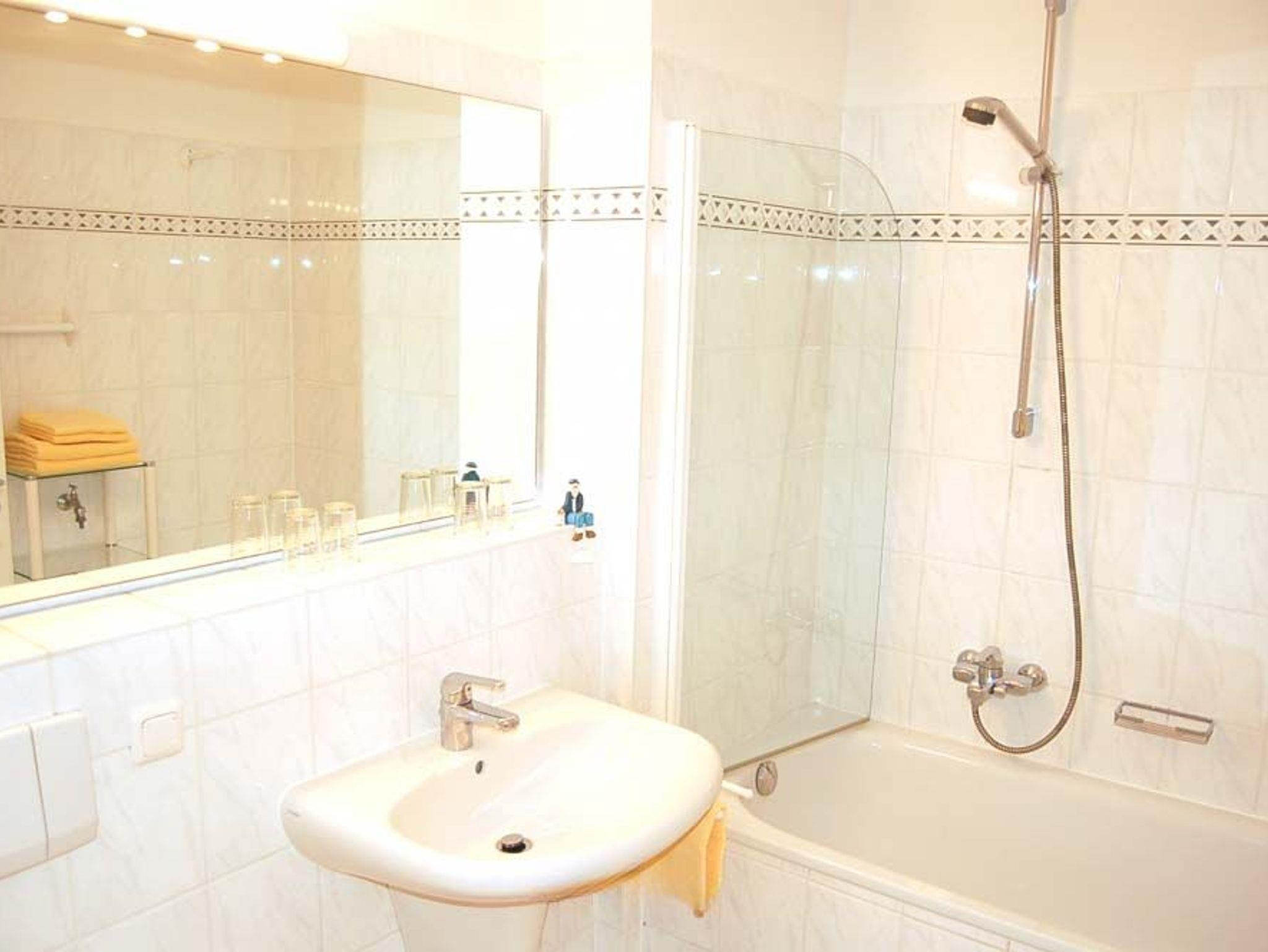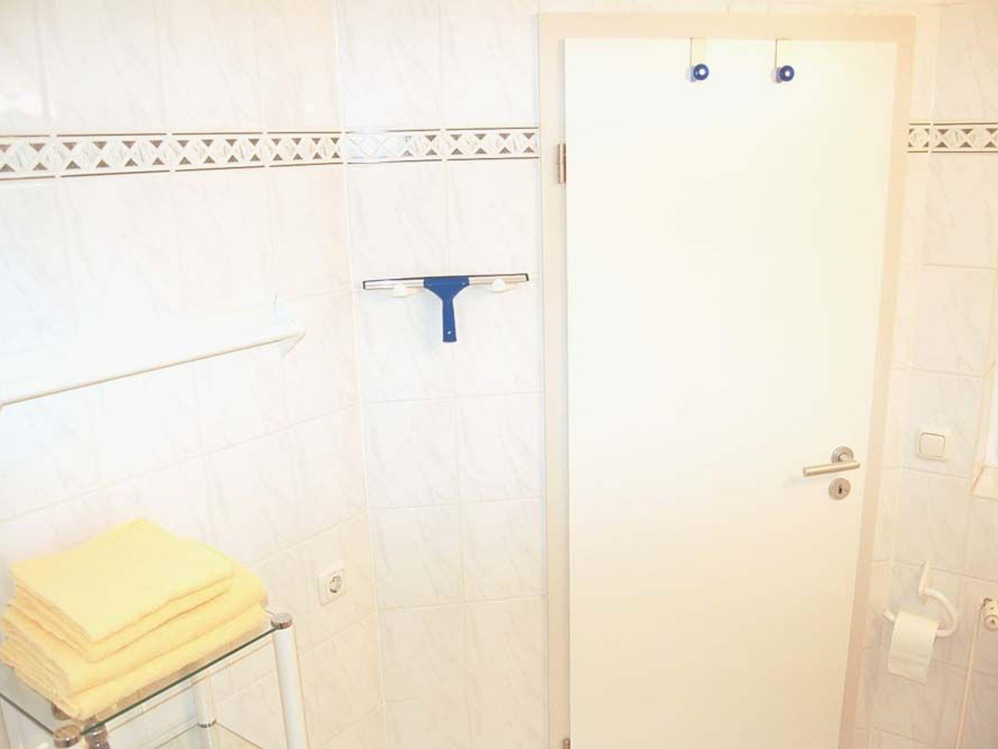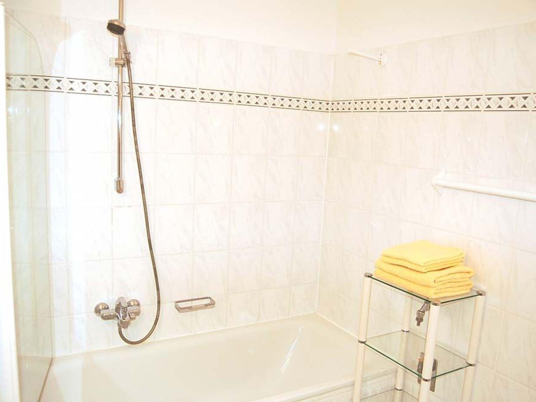 Bad 1: Badewanne, Duschwand, Waschbecken, WC