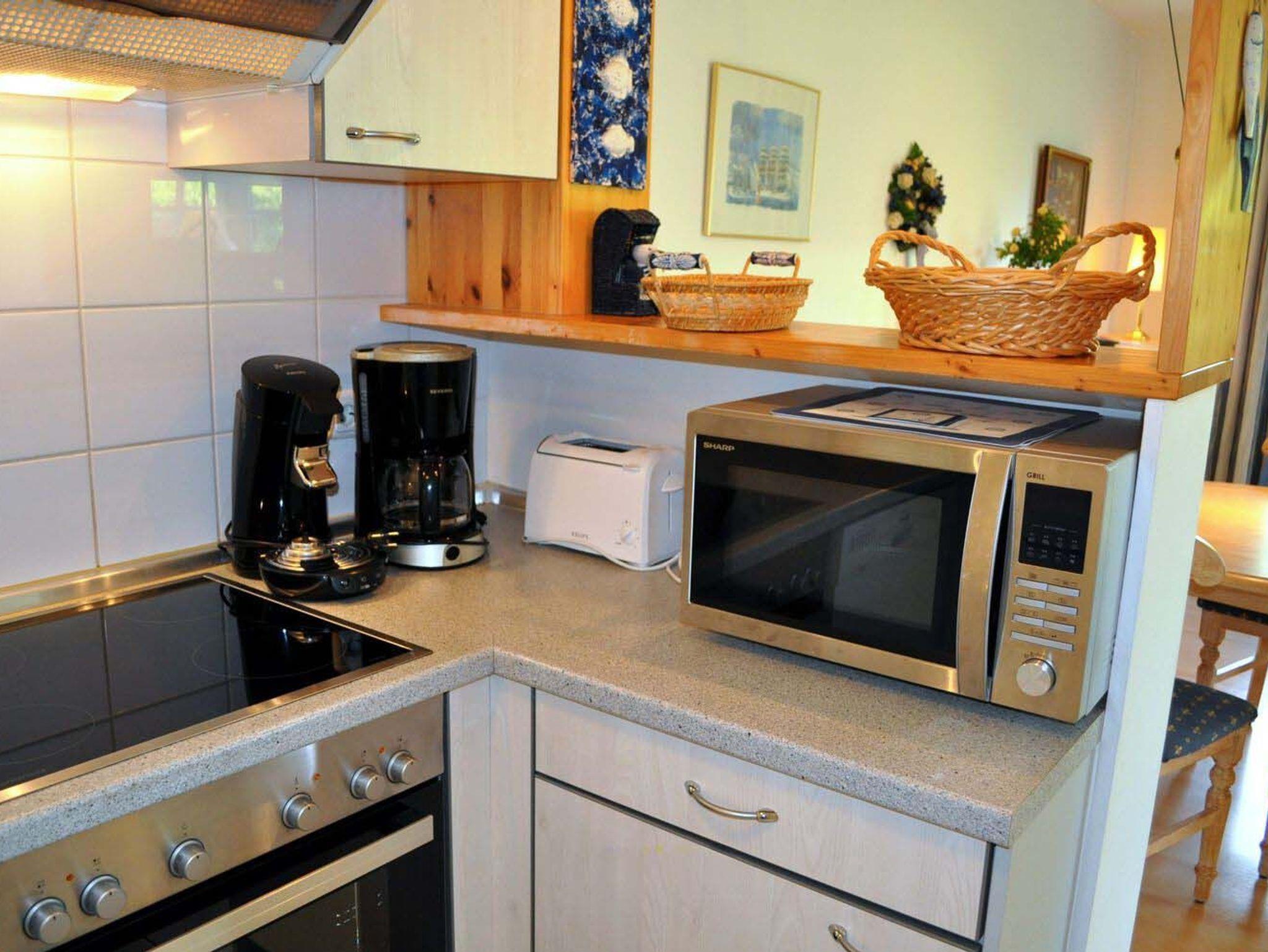 Wohnzimmer: 2 Sessel, 4 Stühle, Anrichte, Couchtisch, Einbauküche, Esstisch, Flachbildschirm, Geschirr, Kaffeemaschine, Kochtöpfe, Mikrowelle, Sat-TV, Schlafcouch, Spülmaschine, Stehlampe, Tischlampe, Toaster, Wasserkocher