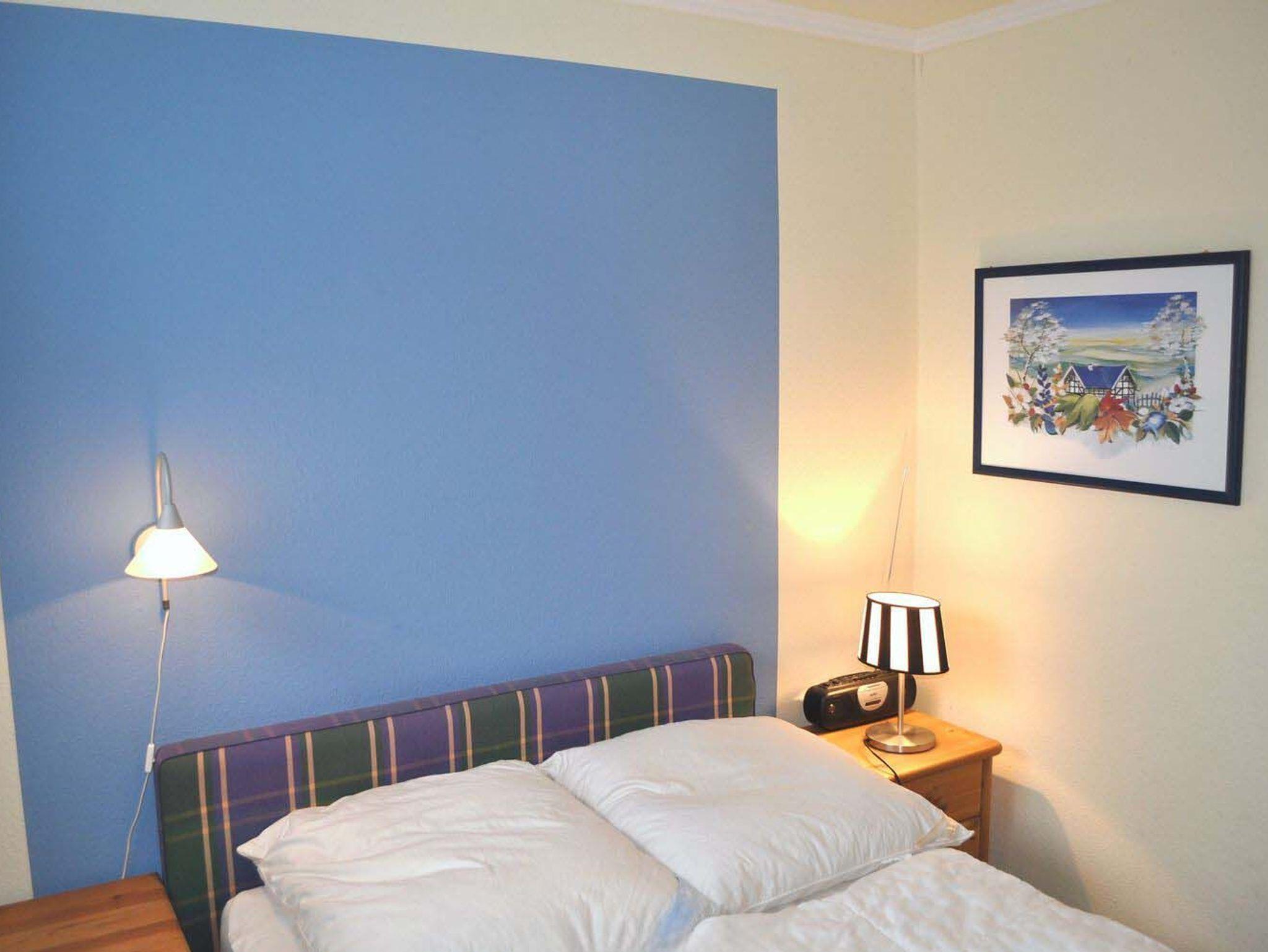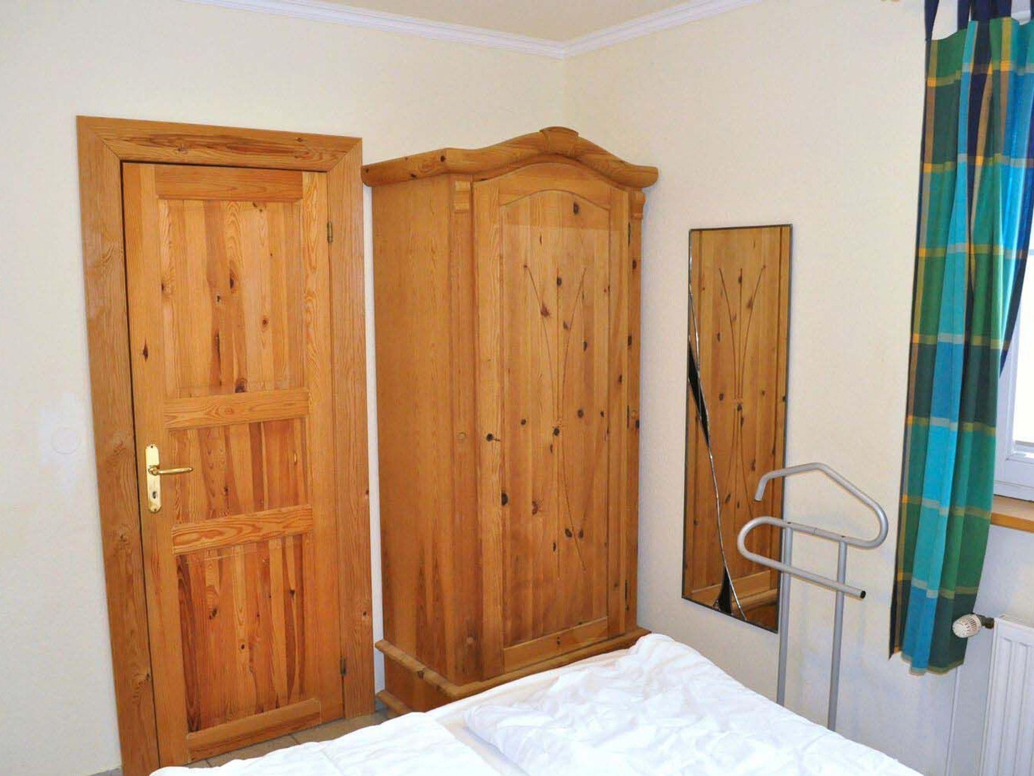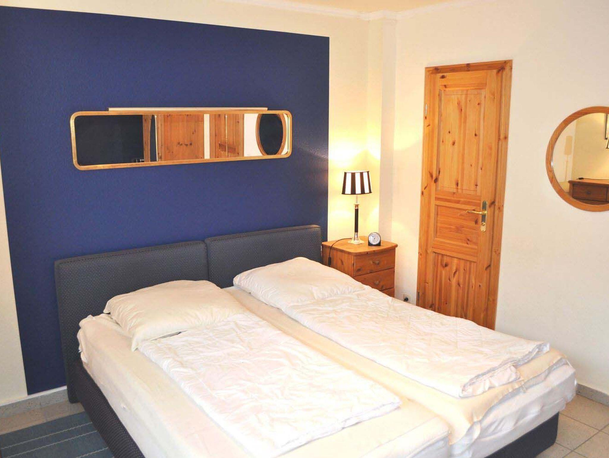 Schlafzimmer 2: 1 Matratze, 2 Nachttische, CD-Stereoanlage, Doppelbett 2,00 x 1,40 m, Kleiderschrank, Plissees, Spiegel, Stummerdiener