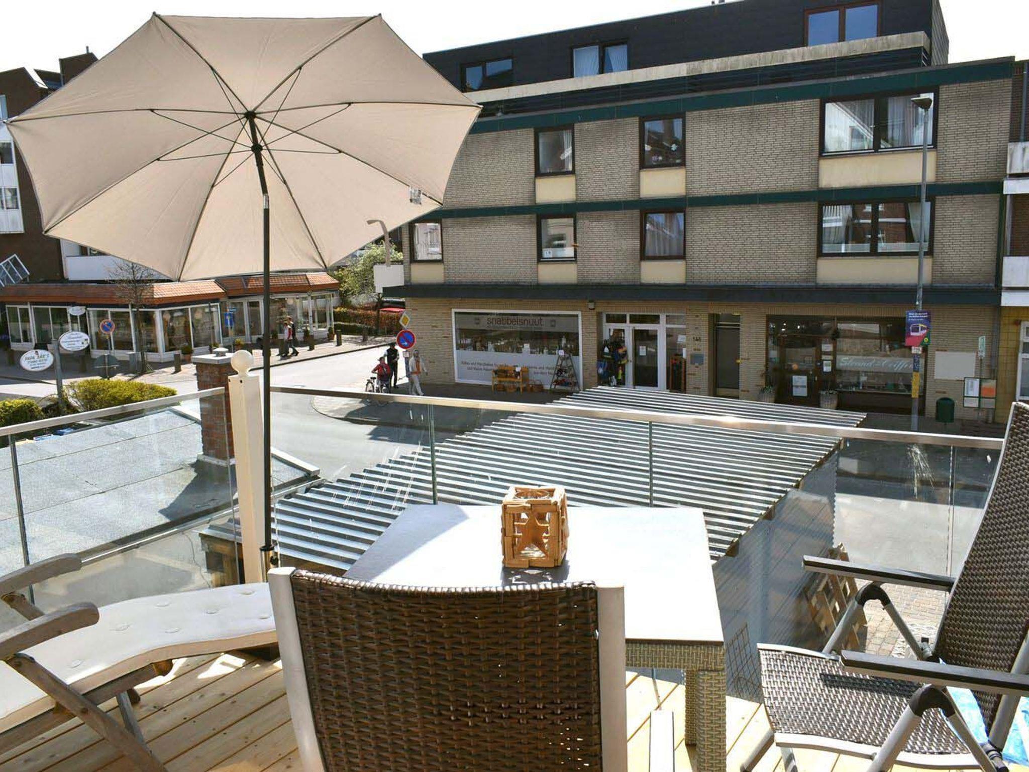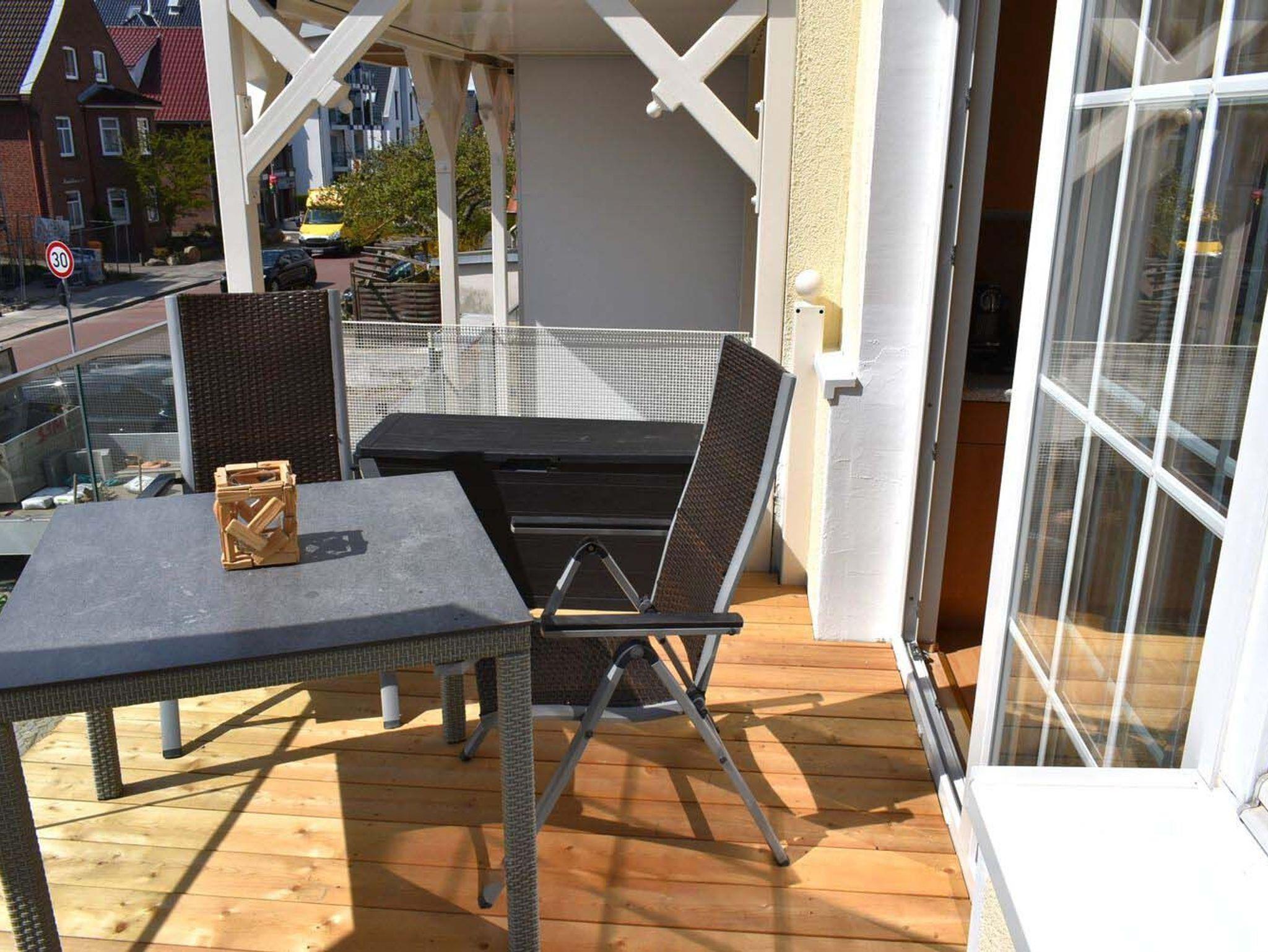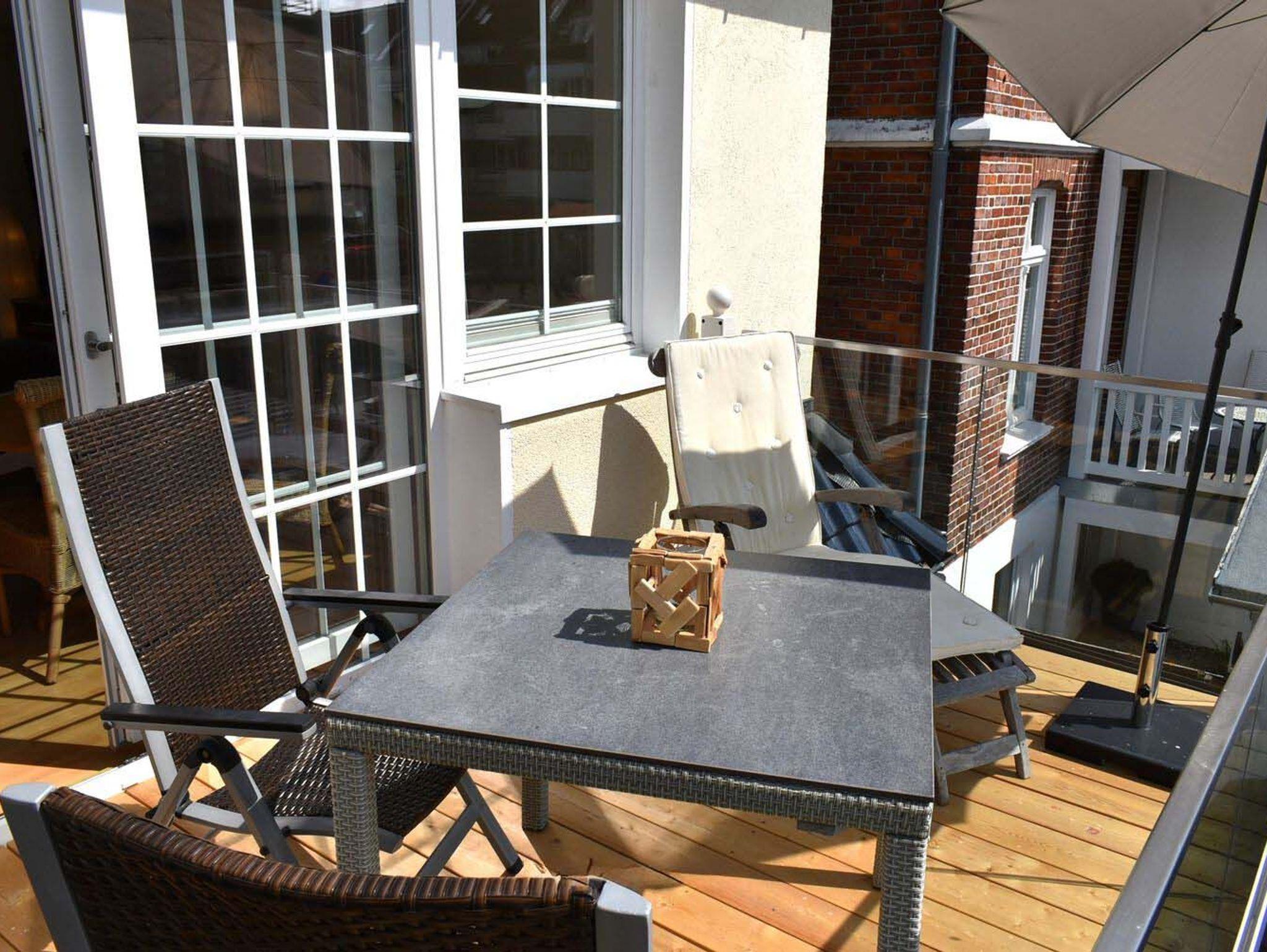Balkon: 1 Deckchair (Liege), 4 Stühle, Sonnenschirm, Süd- Westlage, Tisch